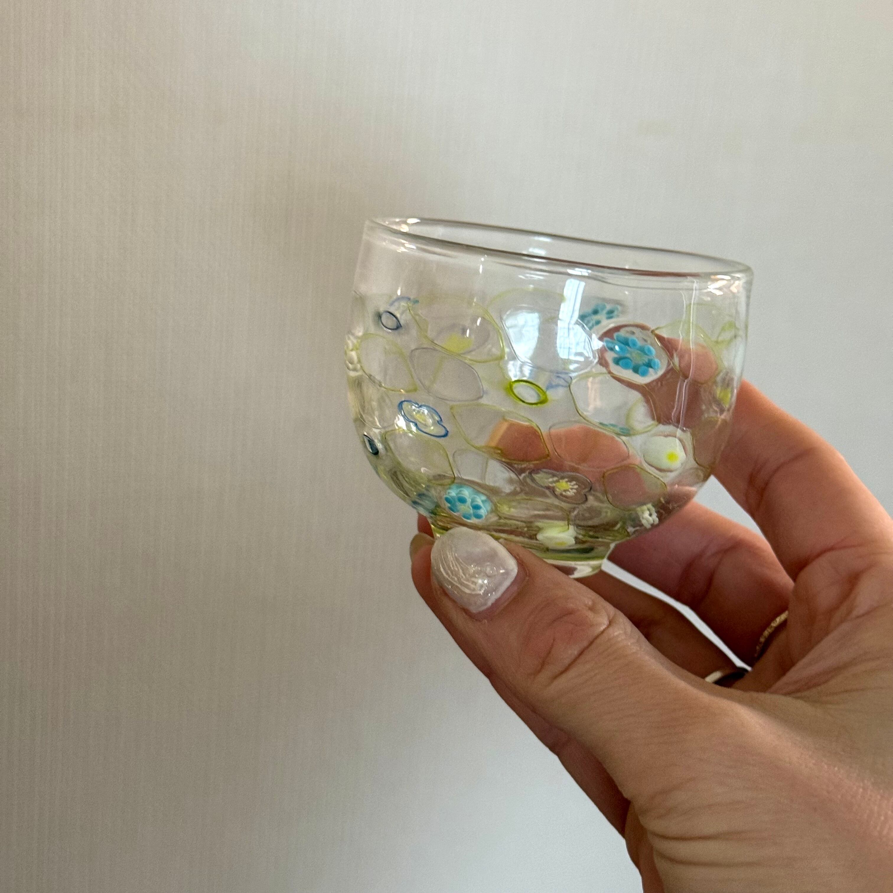 ガラスで作られた小さなパーツがグラスにたくさんつけられています。よく見ると、本当に小さな細いガラスが集まって花の形になっているのがわかります。