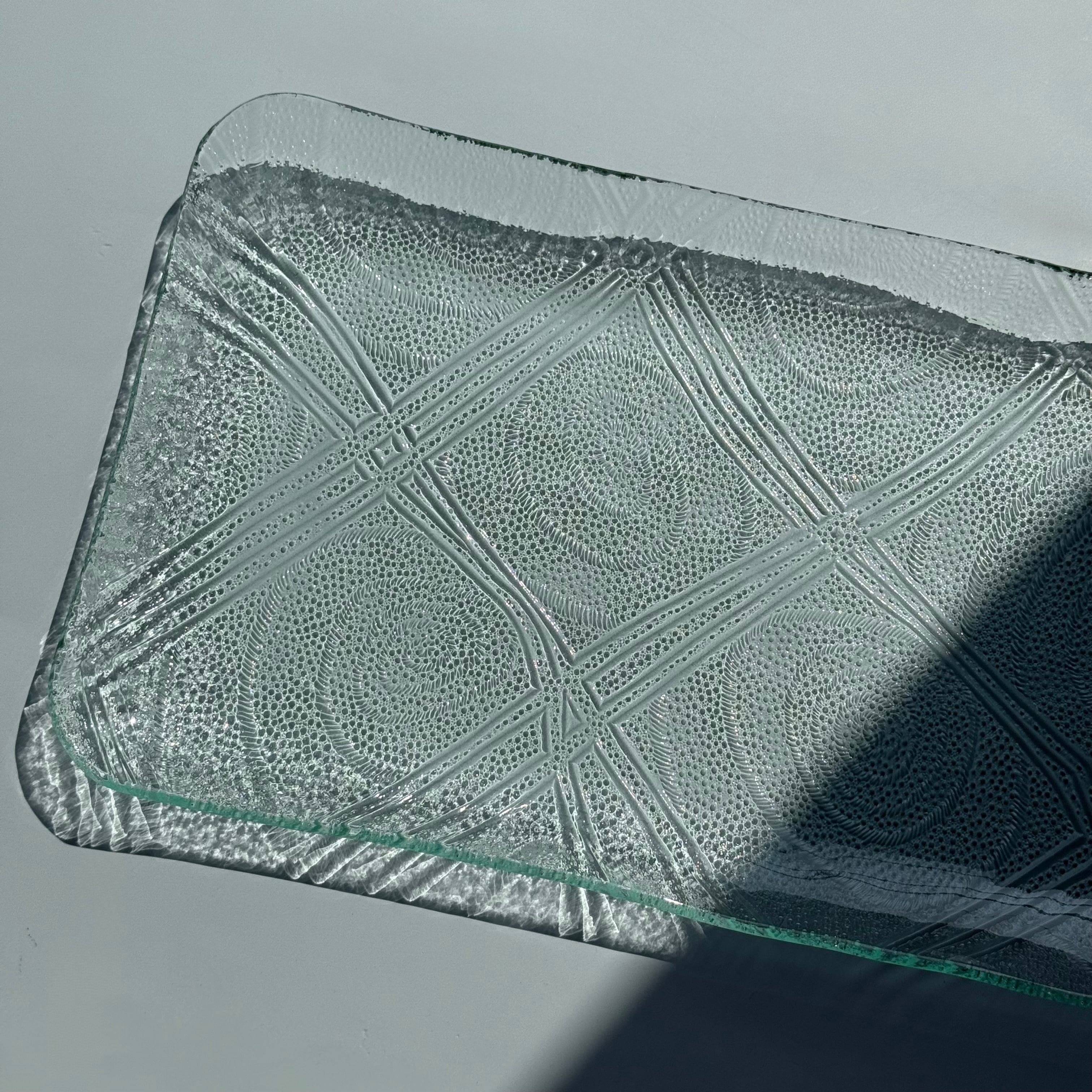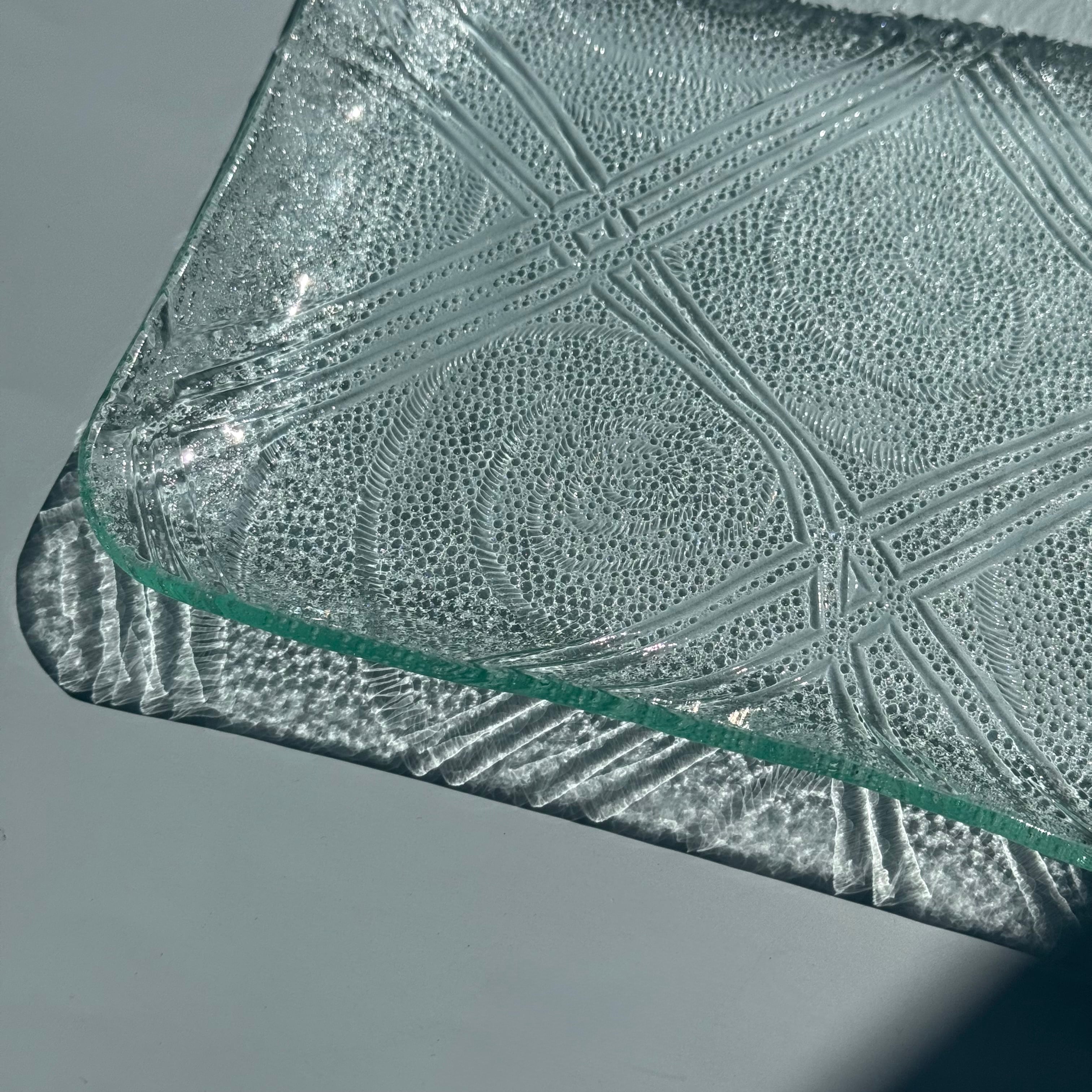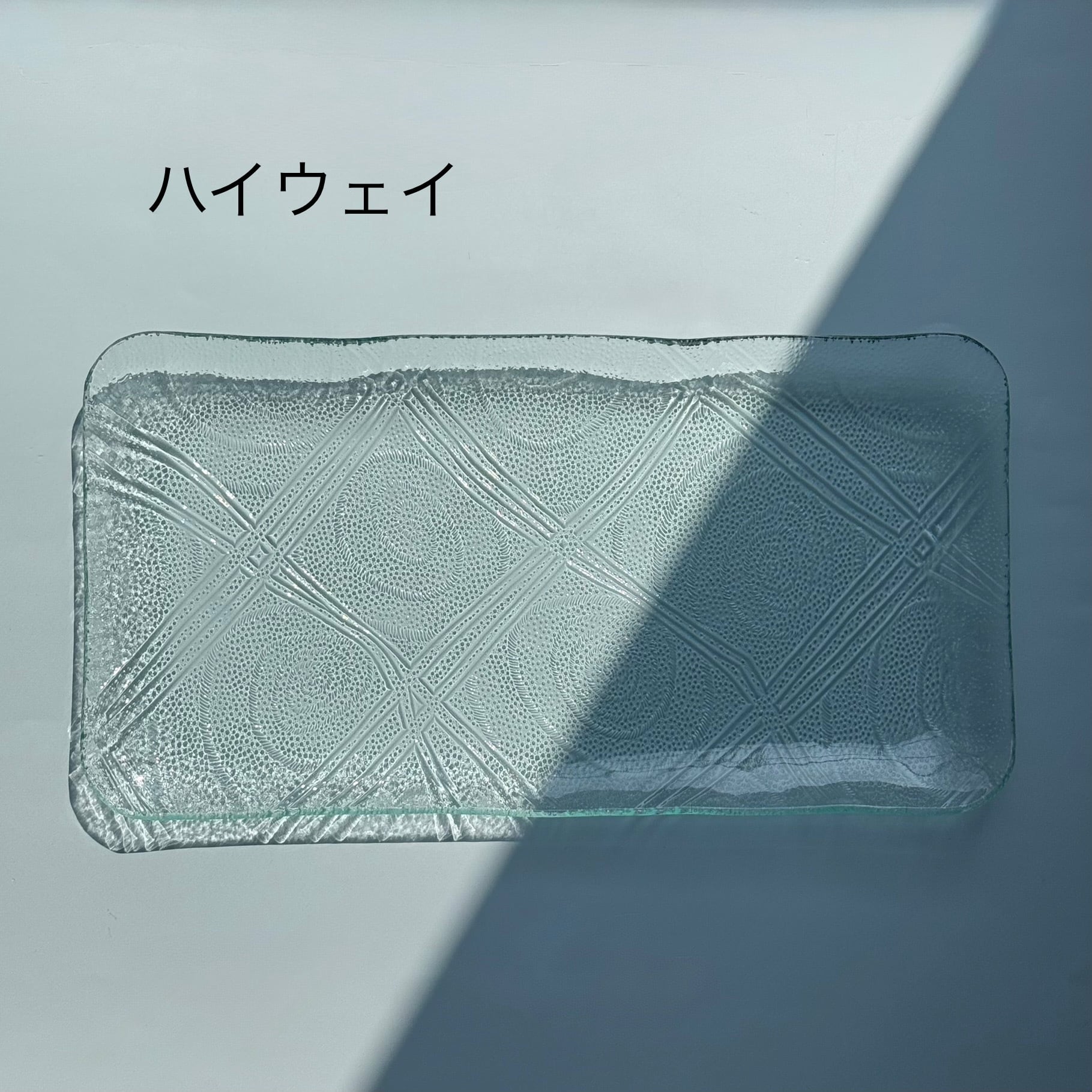 国産板ガラスをリメイクした長方形の角皿 ハイウェイ です。レトロな模様は涼やかなアイテムでサラダやお刺身等とも相性がいいです。