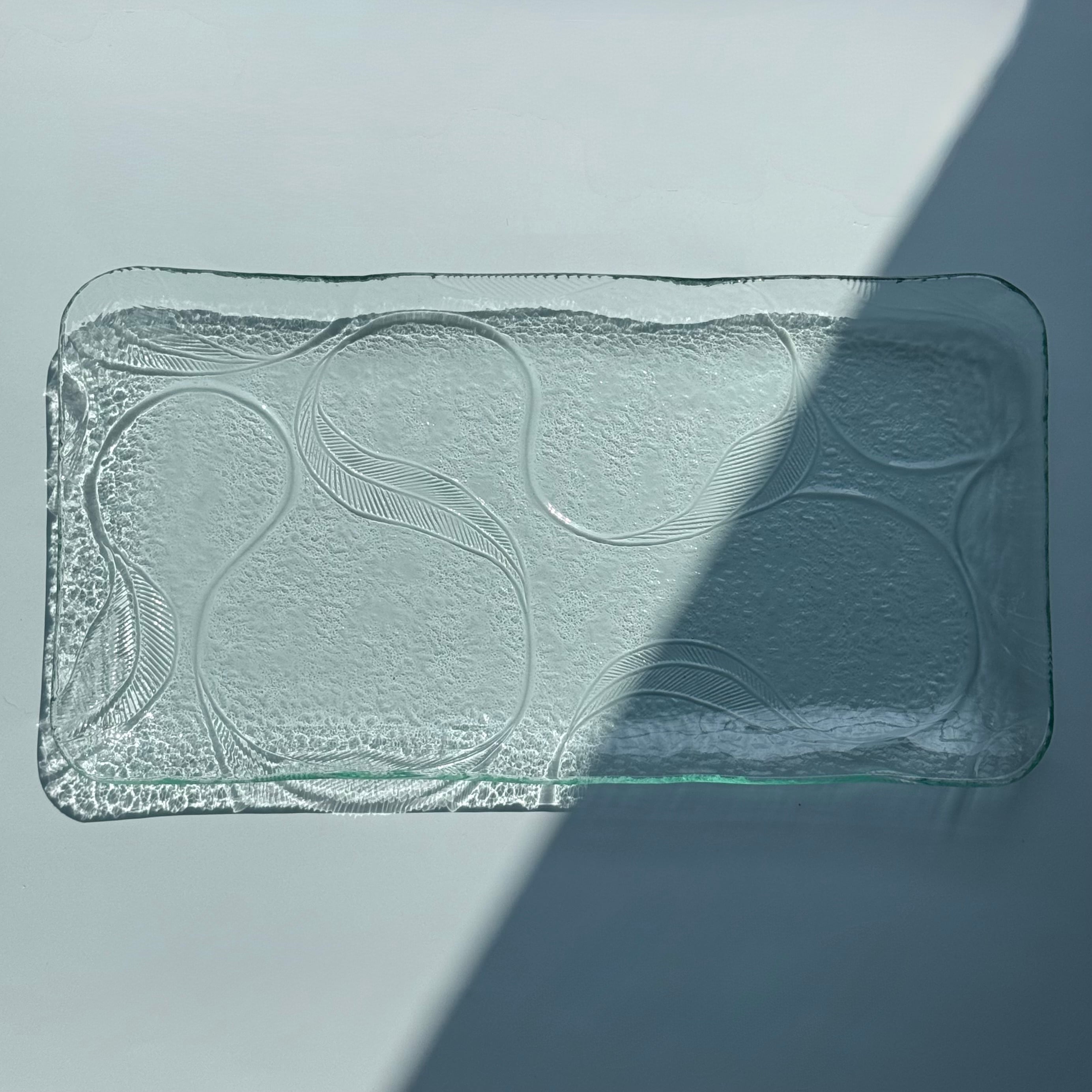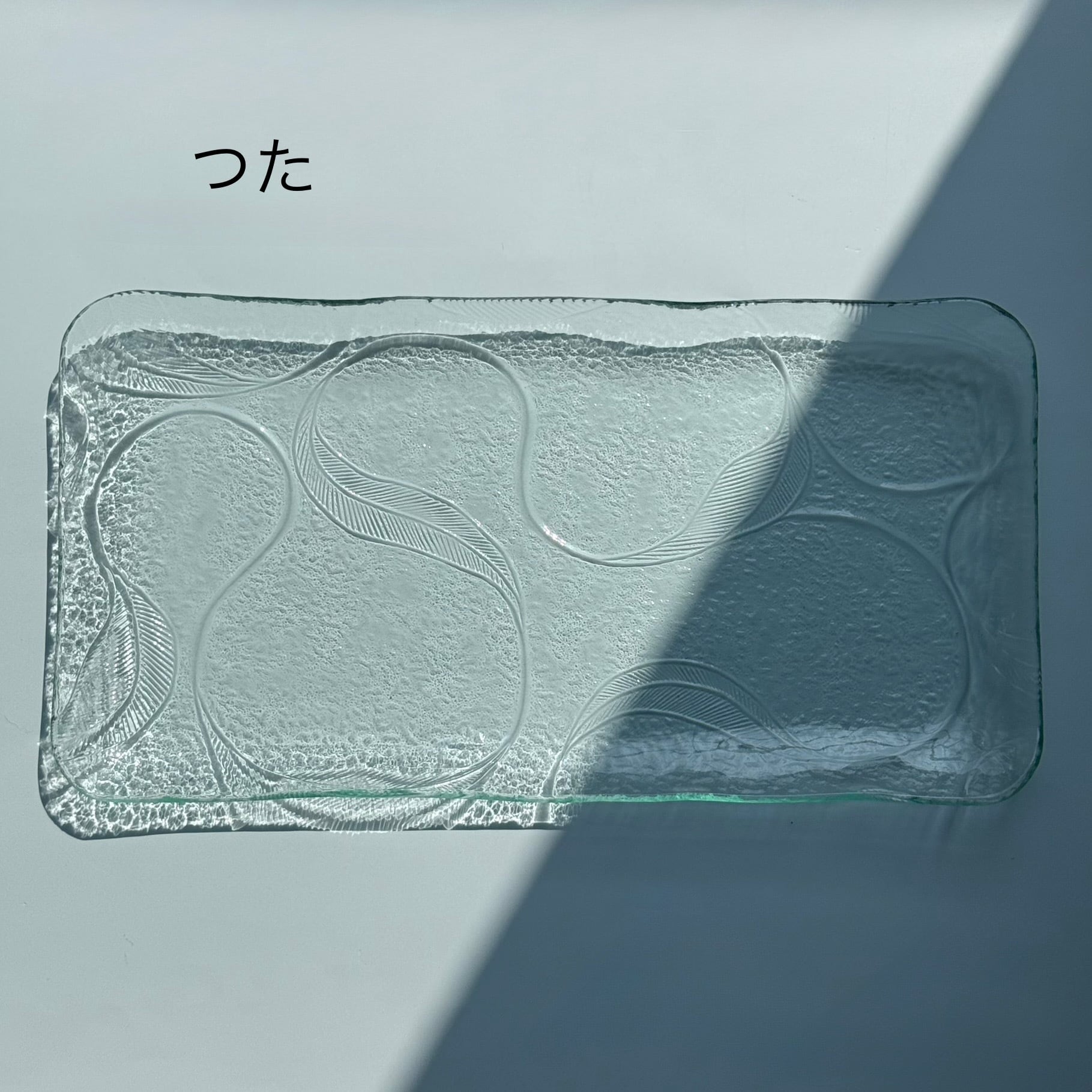 国産板ガラスをリメイクした長方形の角皿 つた です。レトロな模様は涼やかなアイテムでサラダやお刺身等とも相性がいいです。