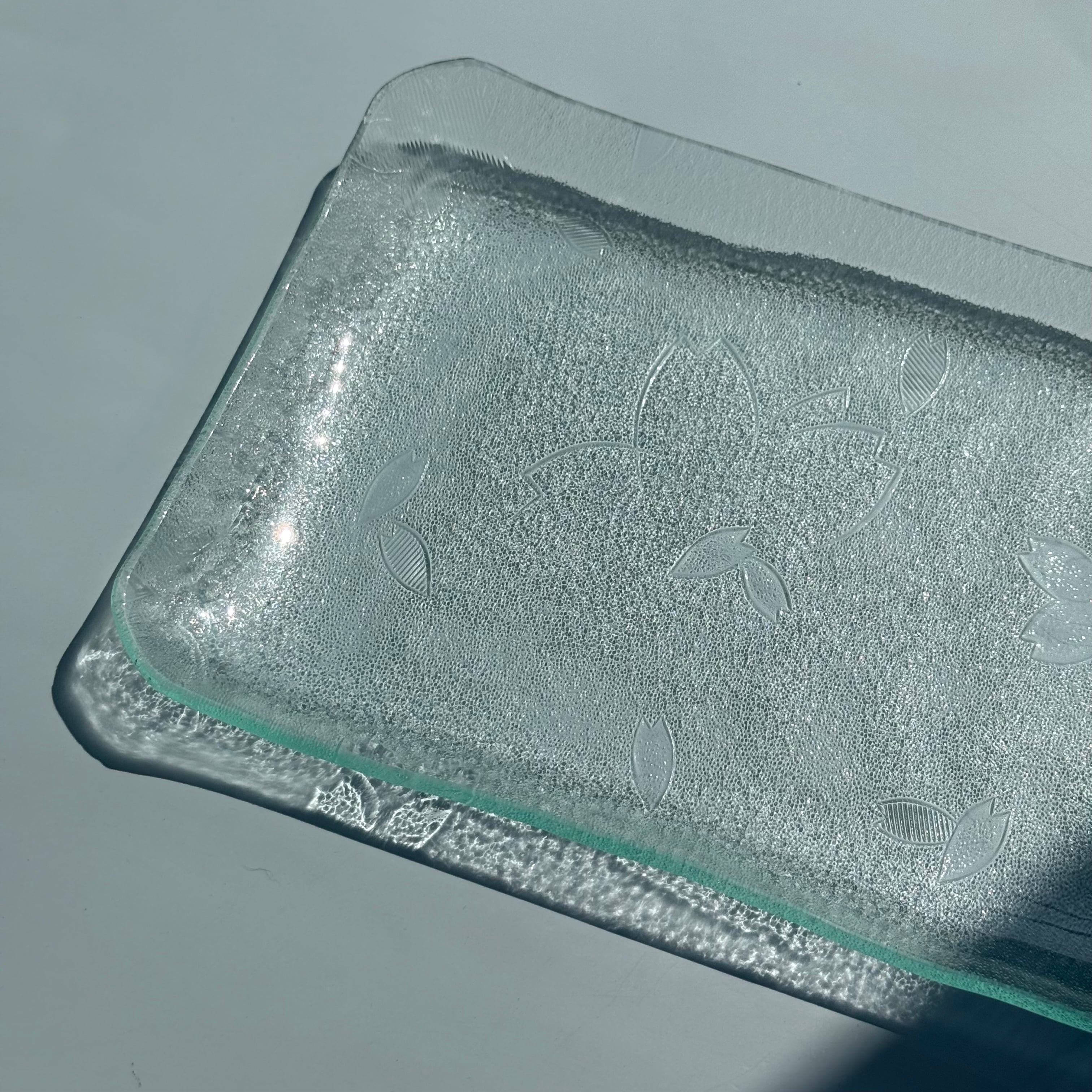 国産板ガラスをリメイクした長方形の角皿 桜 です。レトロな模様は涼やかなアイテムでサラダやお刺身等とも相性がいいです。