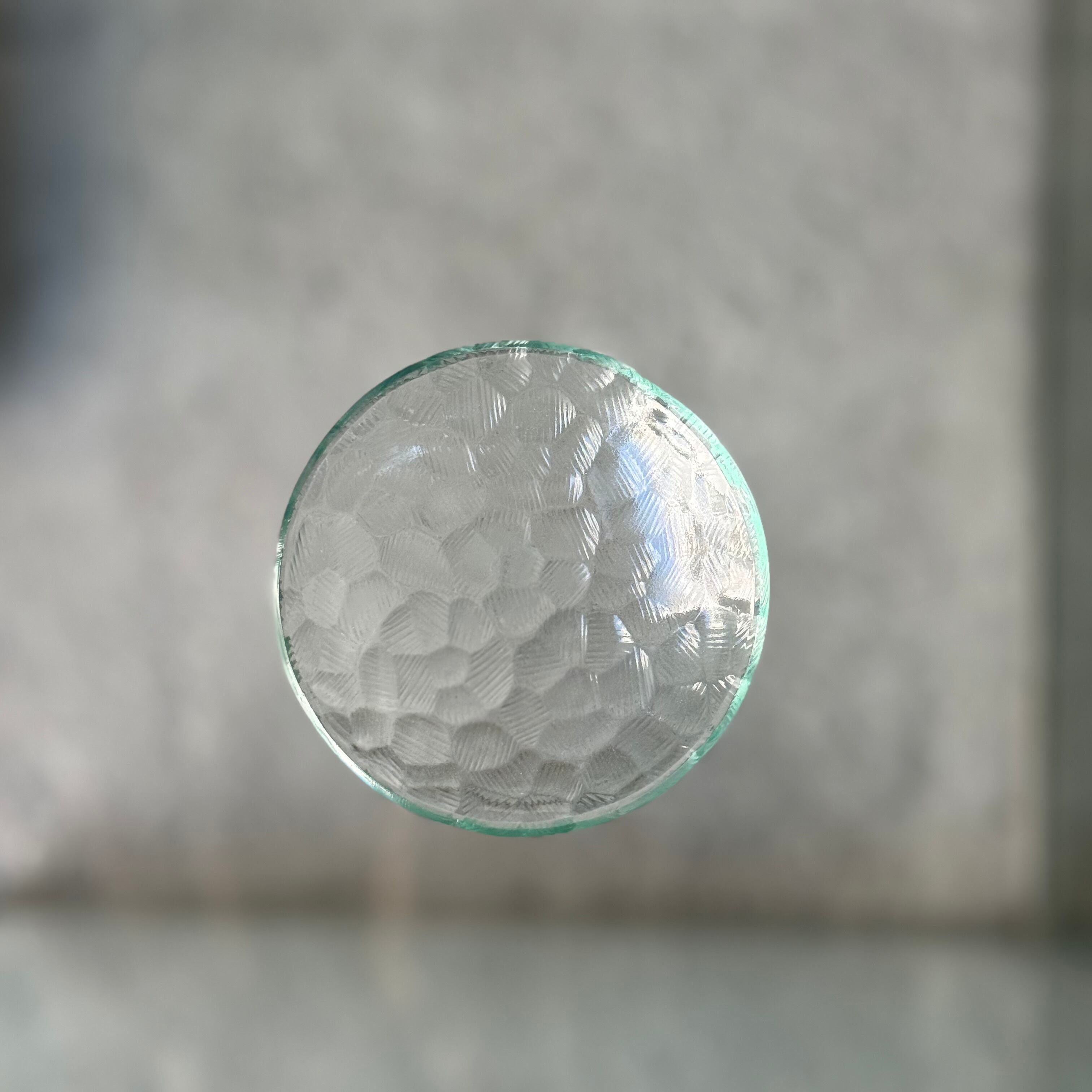 熟練の職人が、板ガラスを1つずつ手作業で丸くカットし、電気炉で18時間かけて焼成して制作しています。