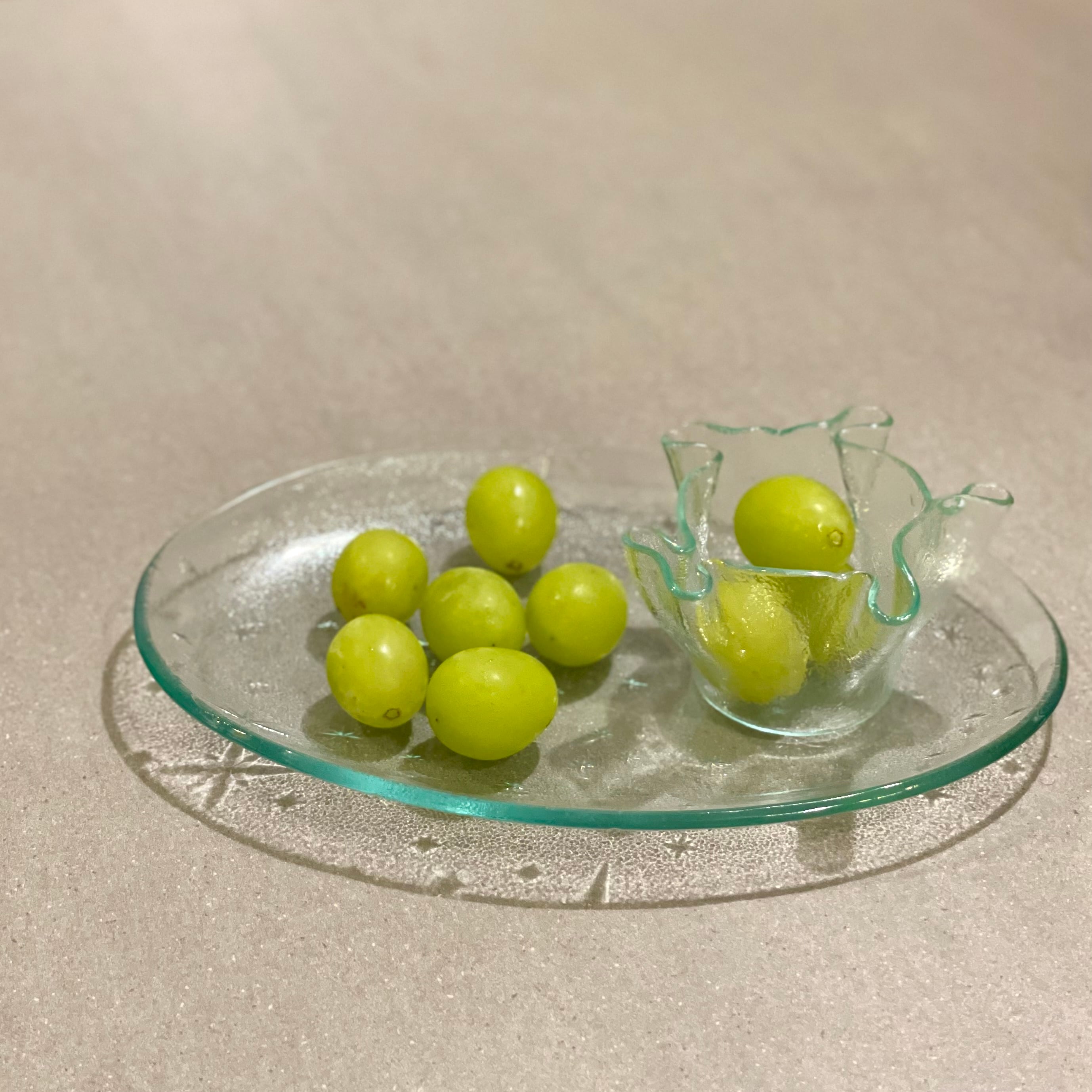 熟練の職人が、1つずつ手作業で板ガラスを丸くカットして、電気炉で18時間かけて焼成し制作しています。フリルの形は熱と重力で自然にできるので、同じ形はありません。唯一無二です。