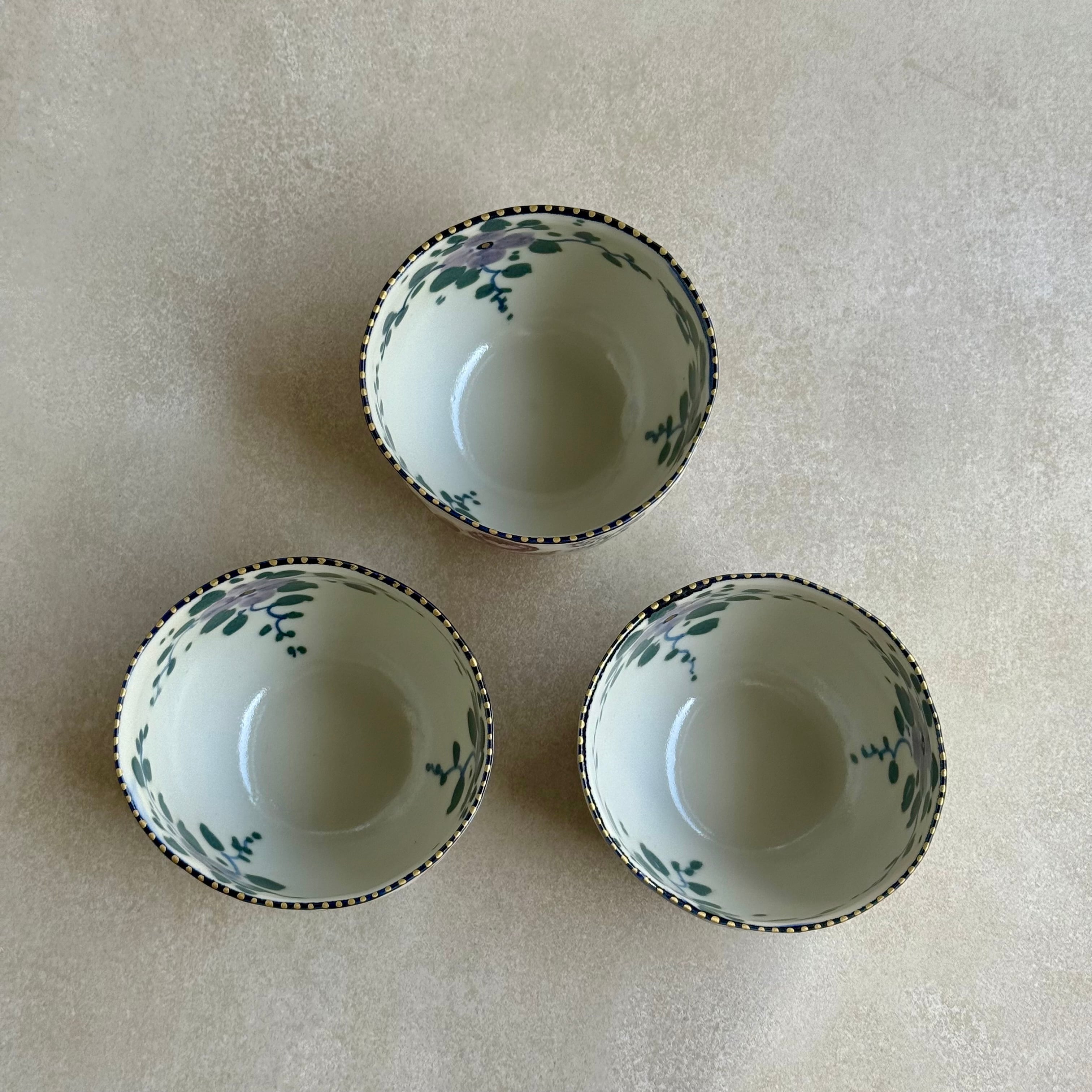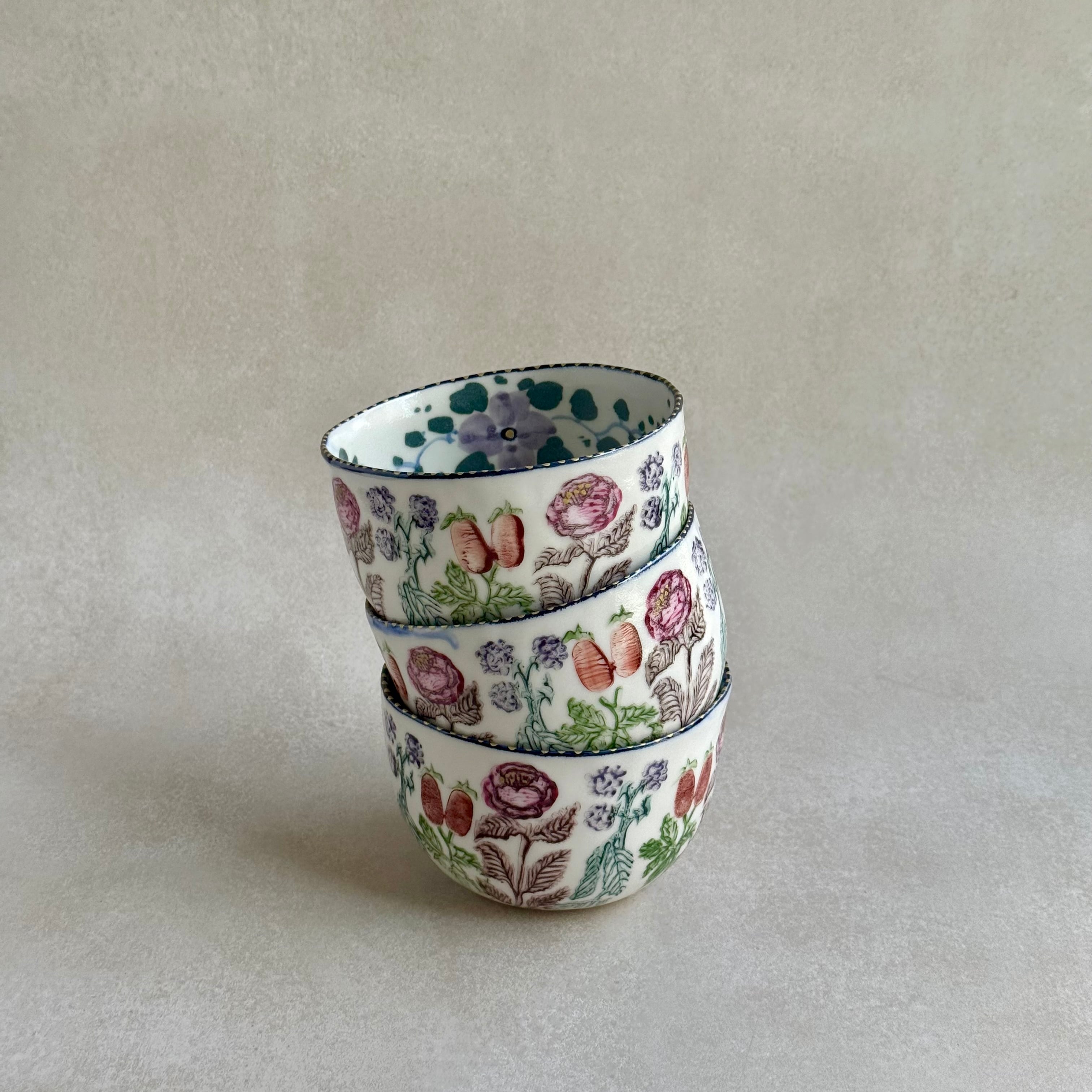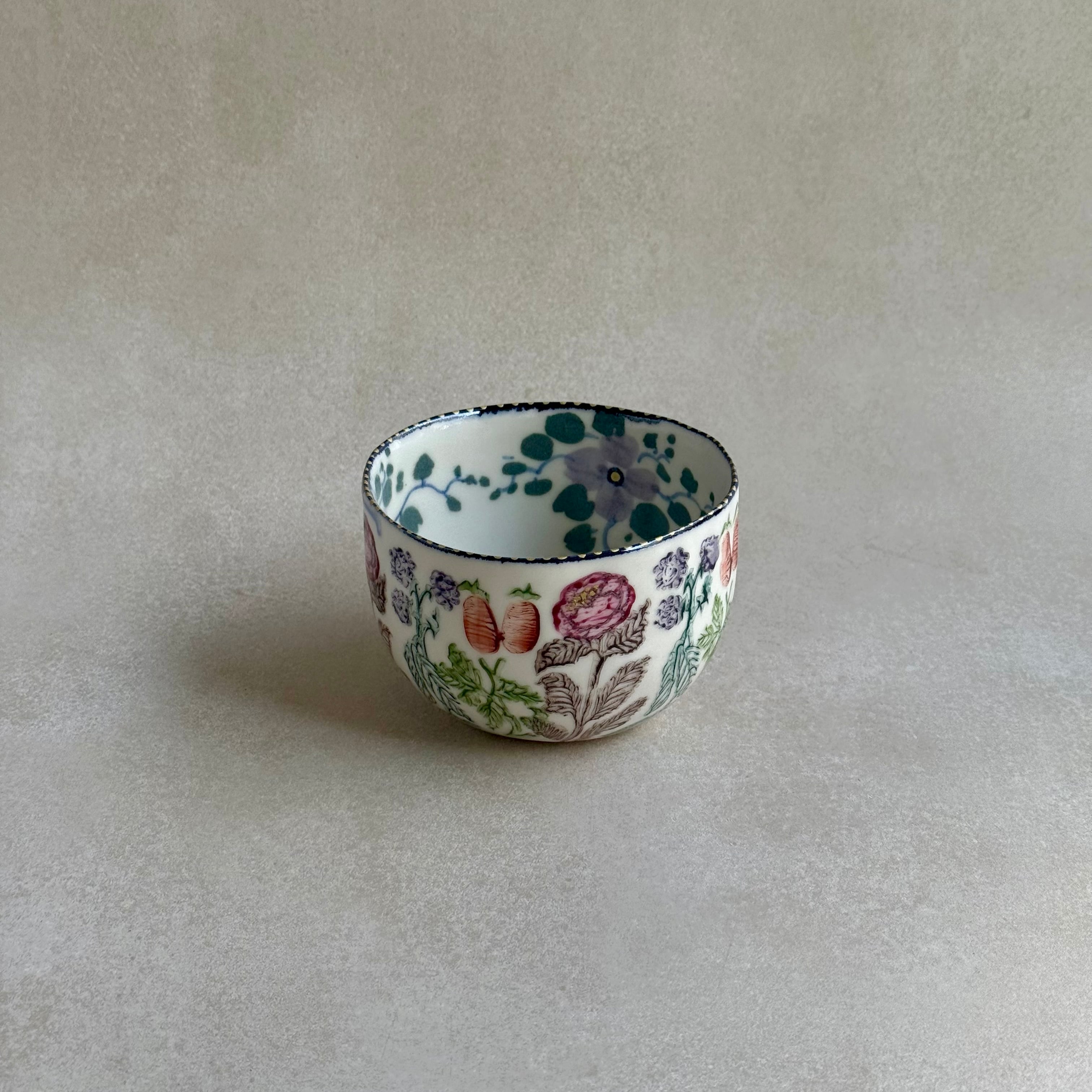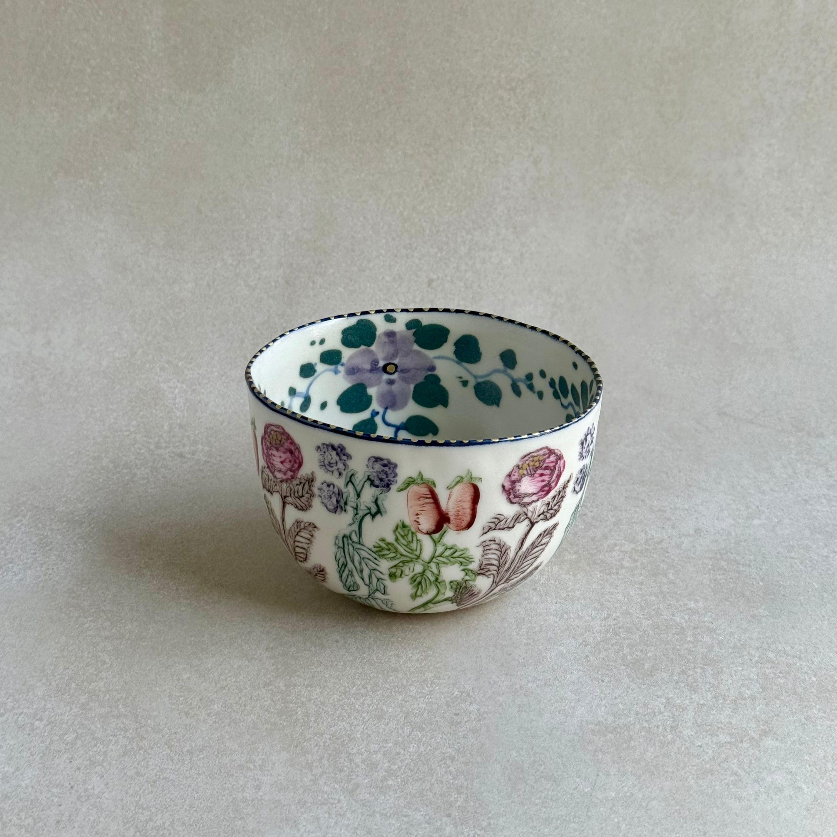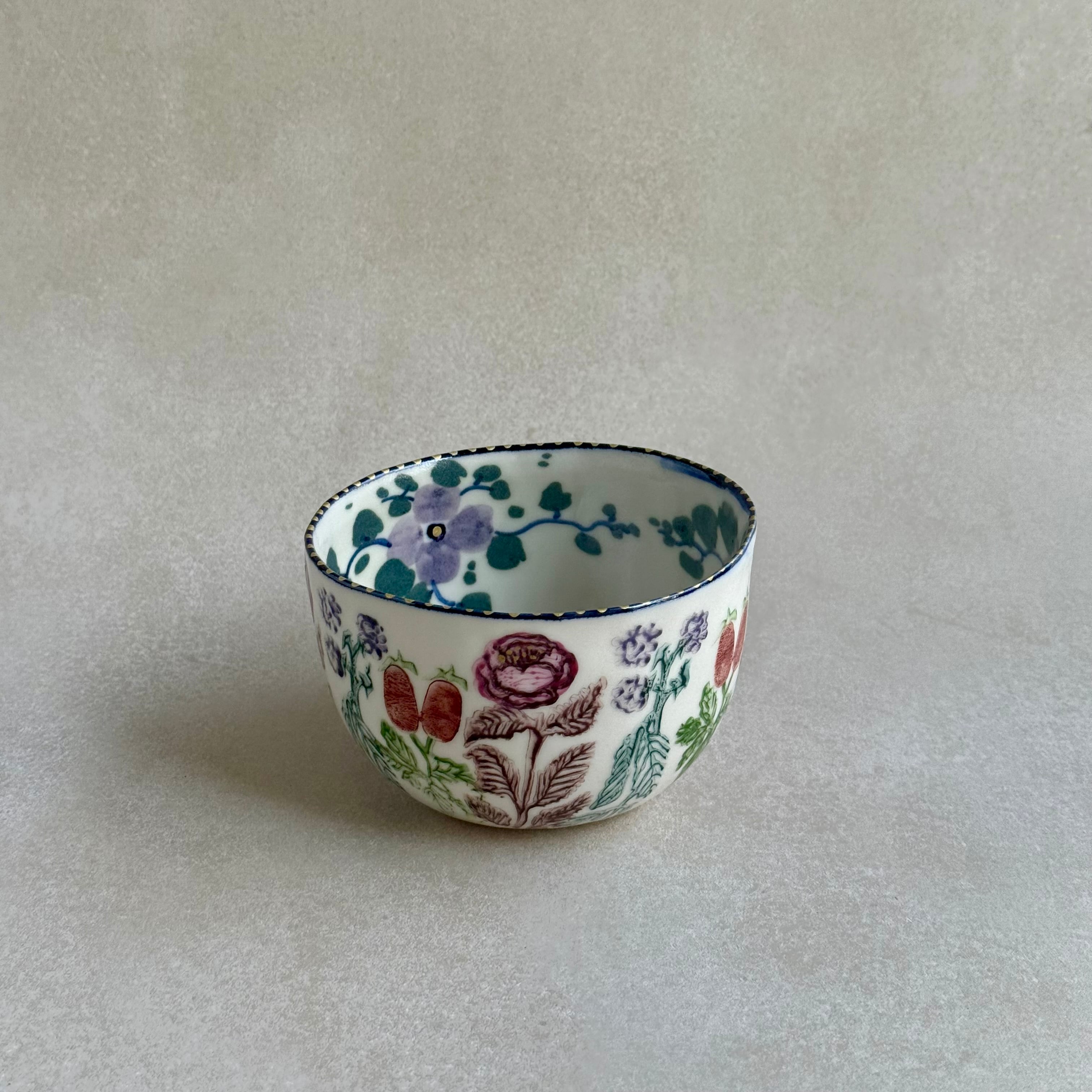 彩り豊かな植物などのモチーフは、印判や手書きで一つ一つ丁寧に描かれています。手捻りならではの温かさが感じられる作品。