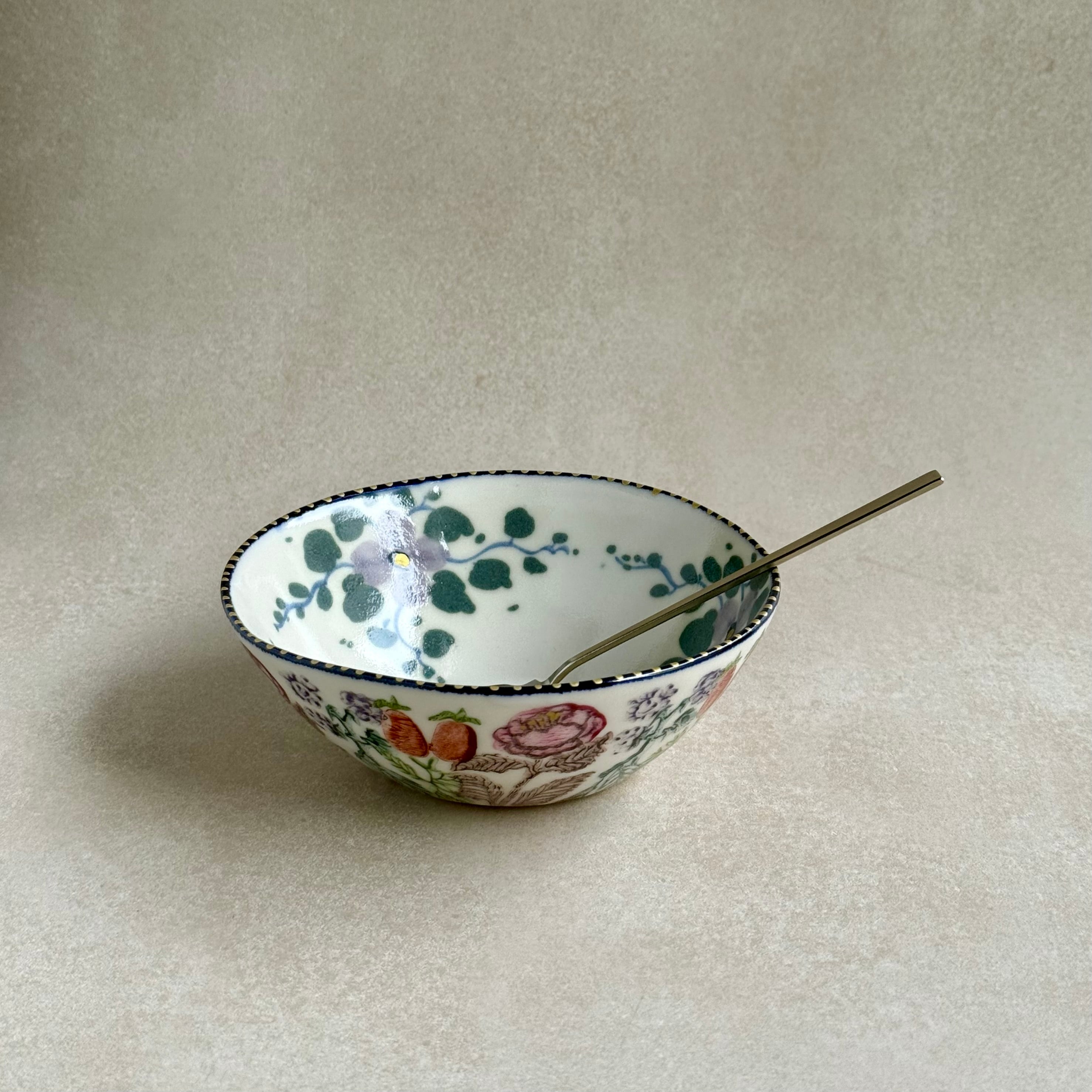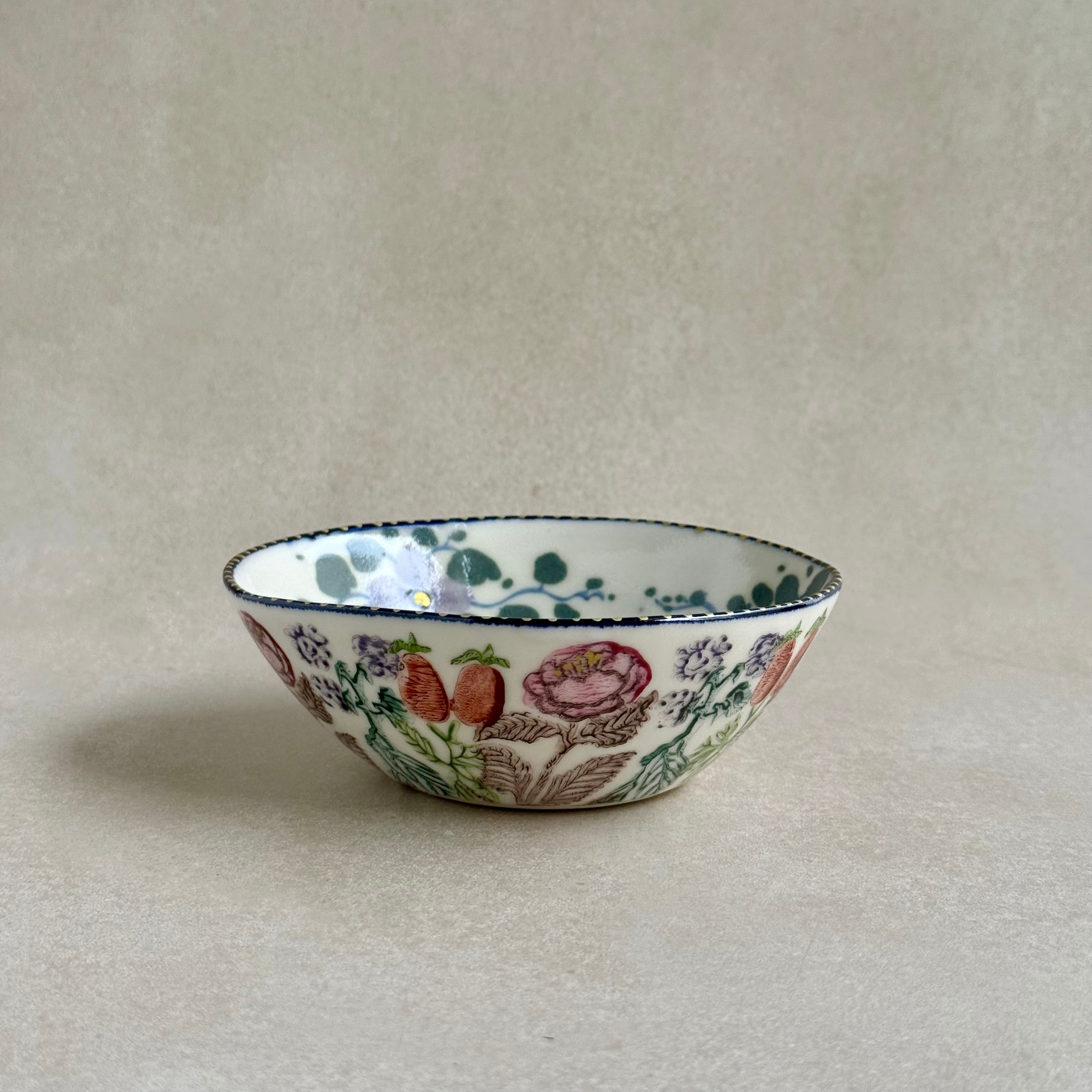 彩り豊かな植物などのモチーフは、印判や手書きで一つ一つ丁寧に描かれています。手捻りならではの温かさが感じられる作品。