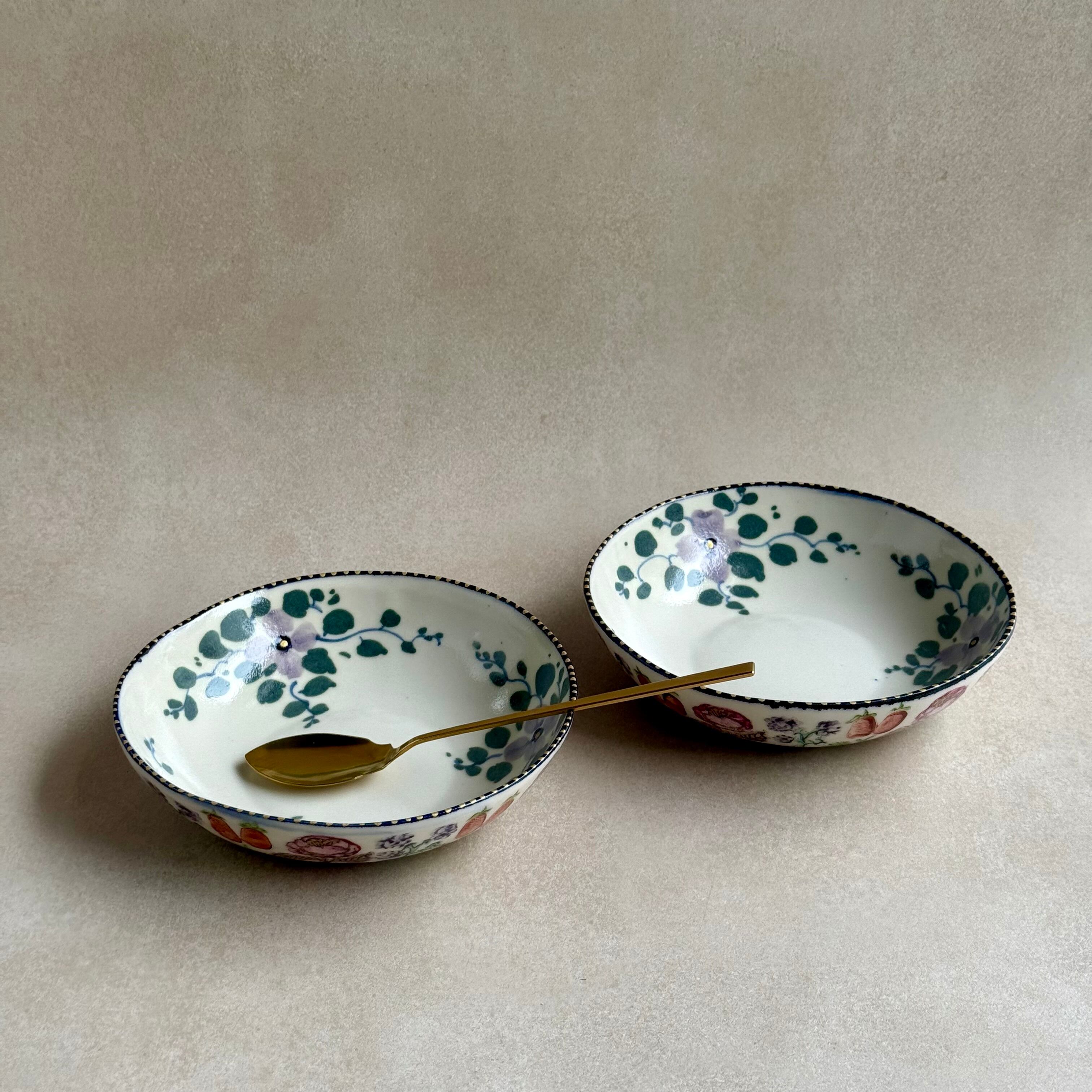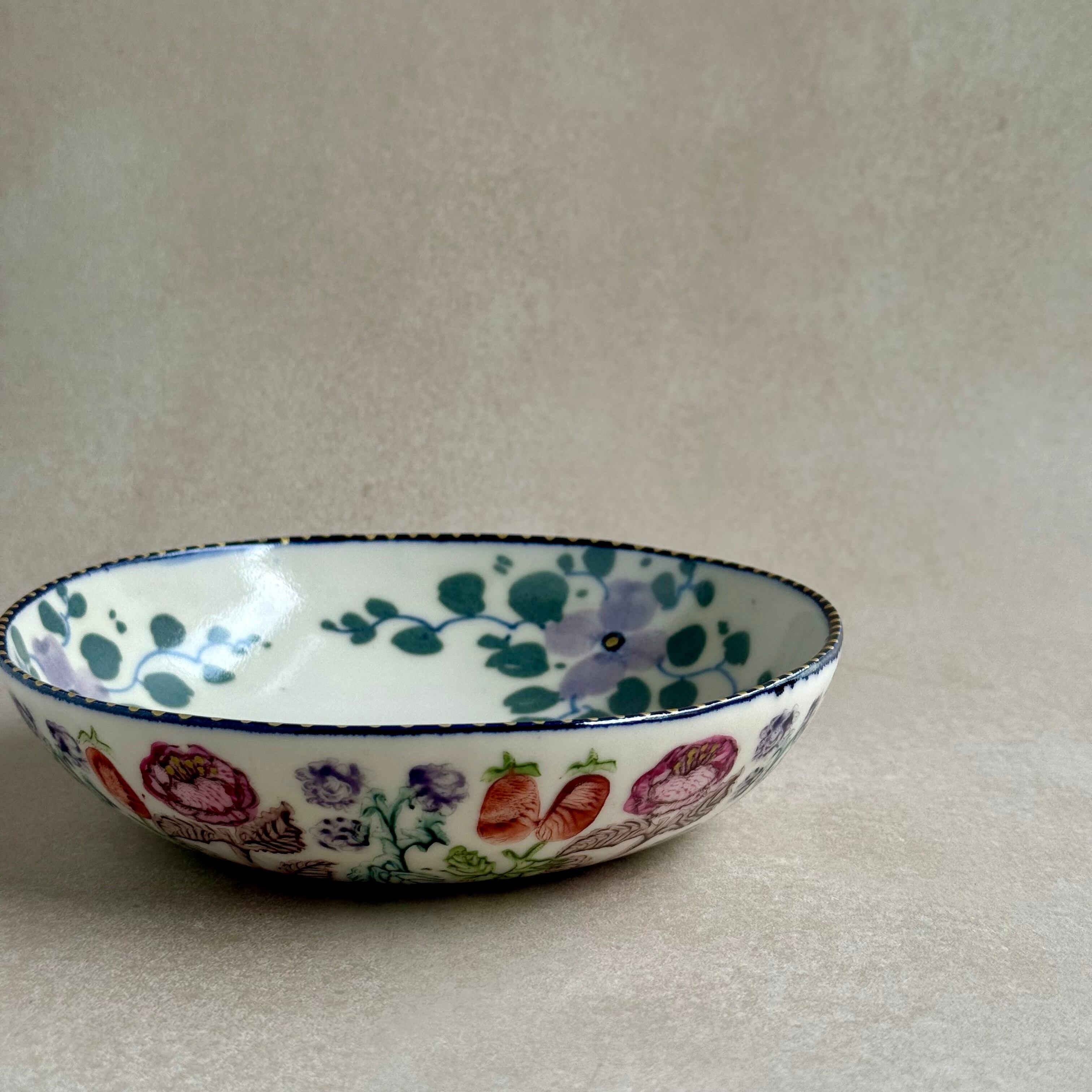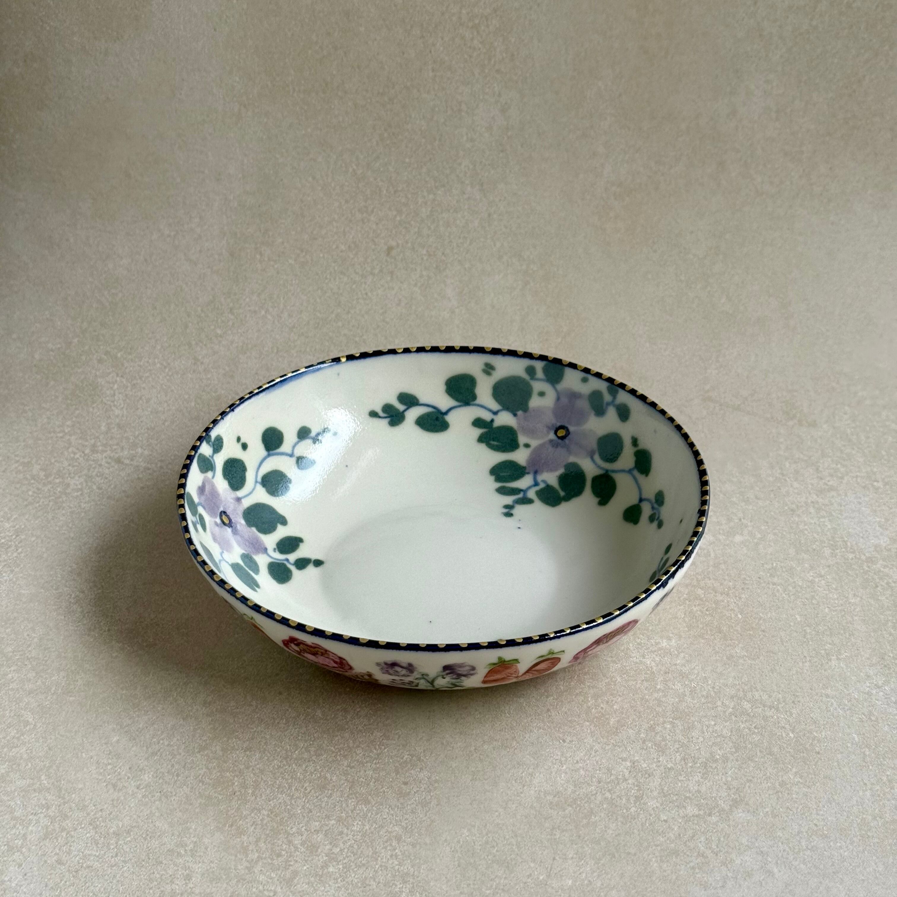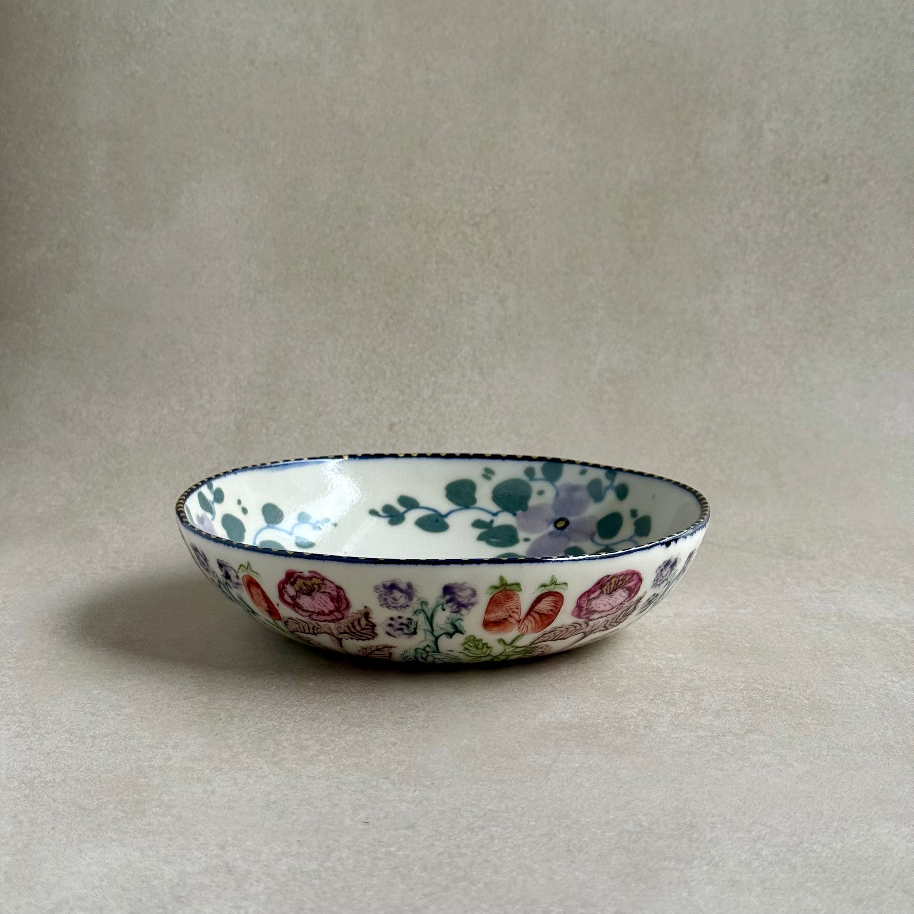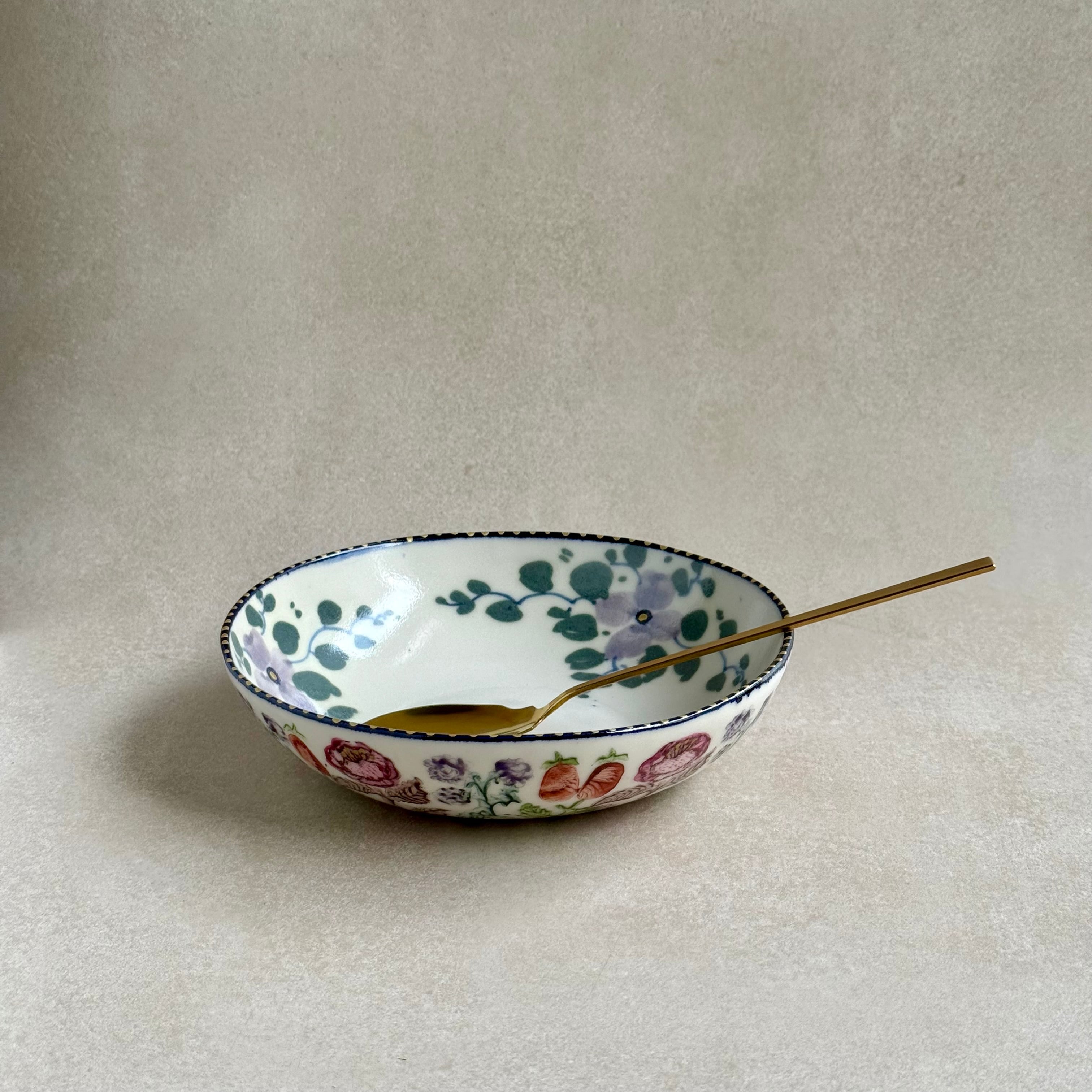 彩り豊かな植物などのモチーフは、印判や手書きで一つ一つ丁寧に描かれています。手捻りならではの温かさが感じられる作品。