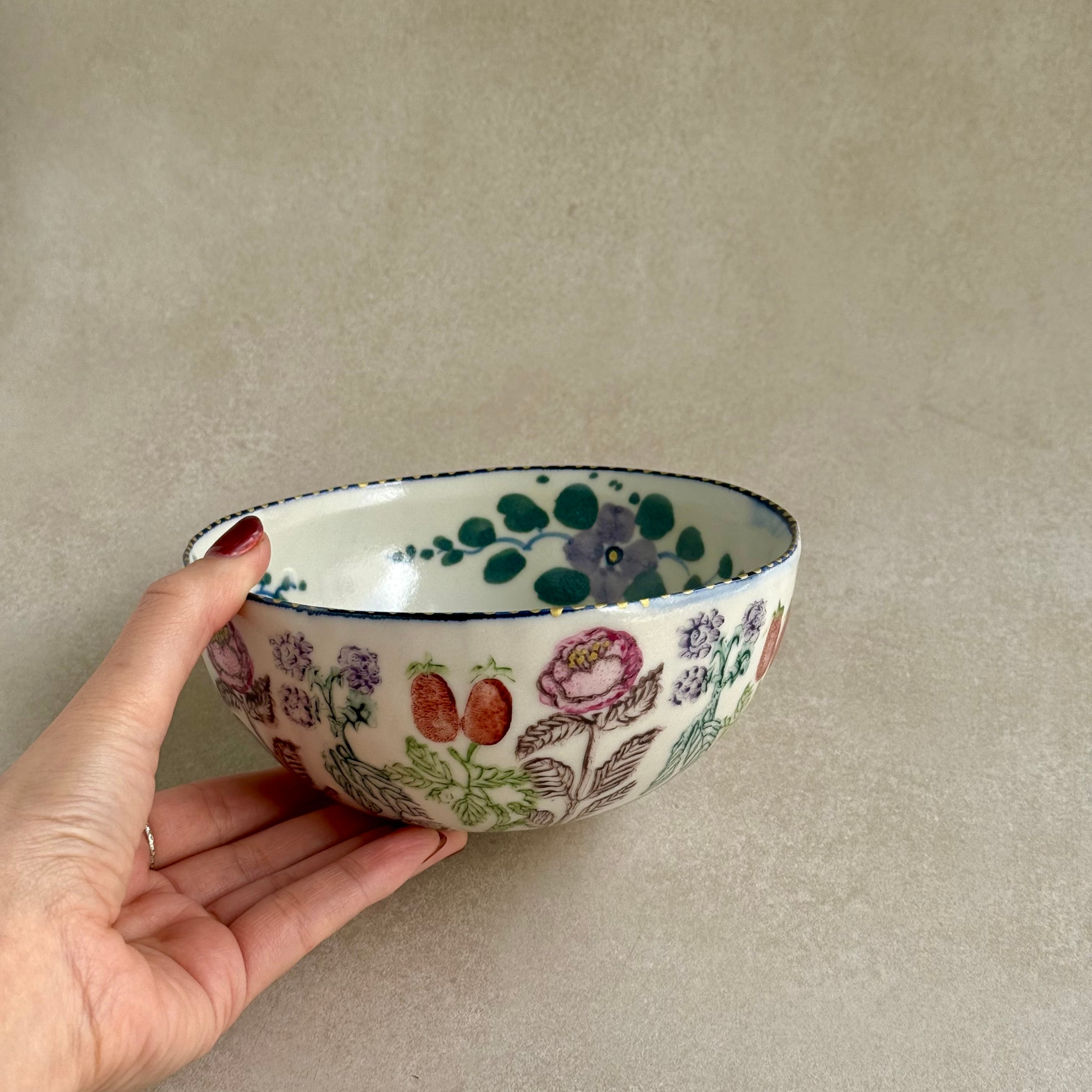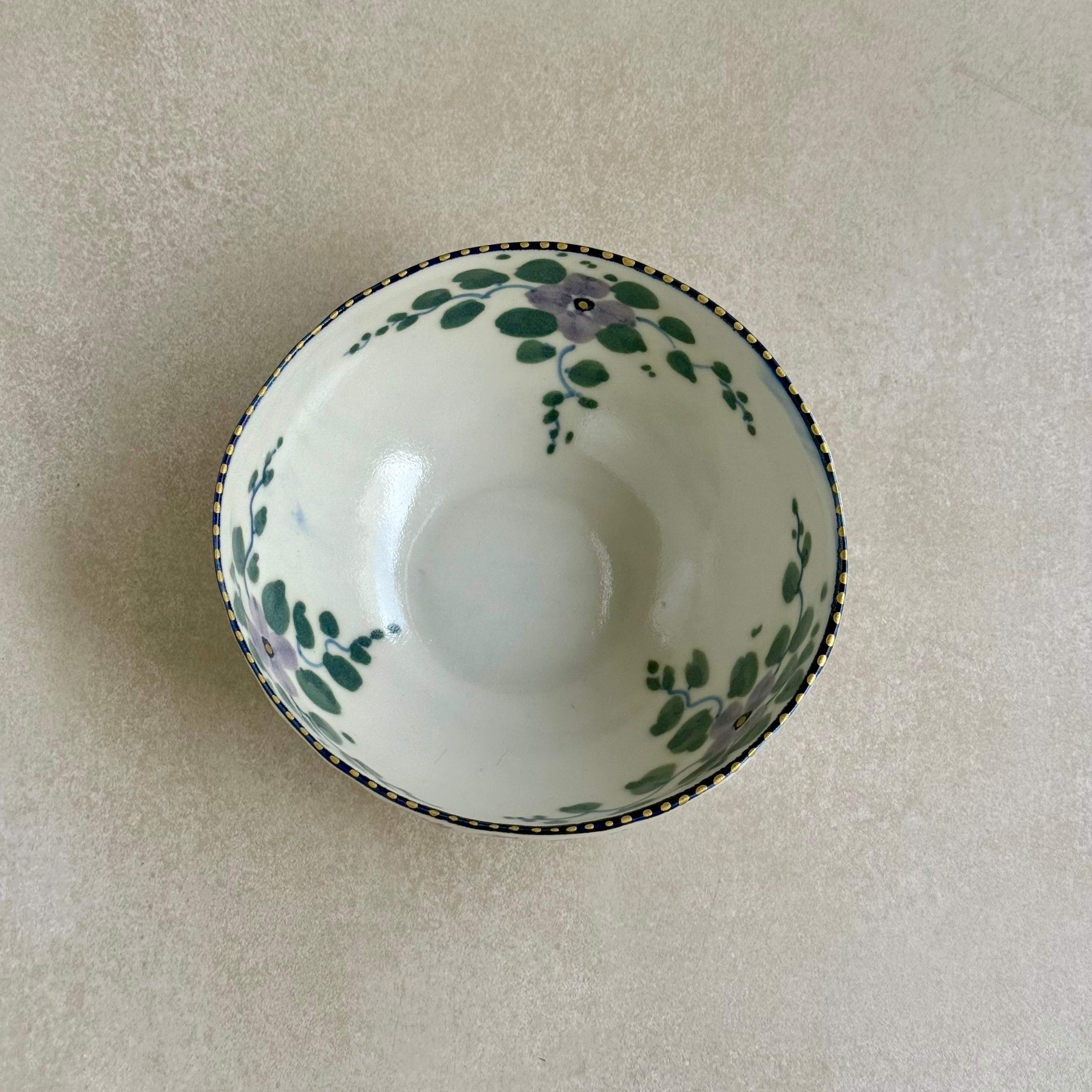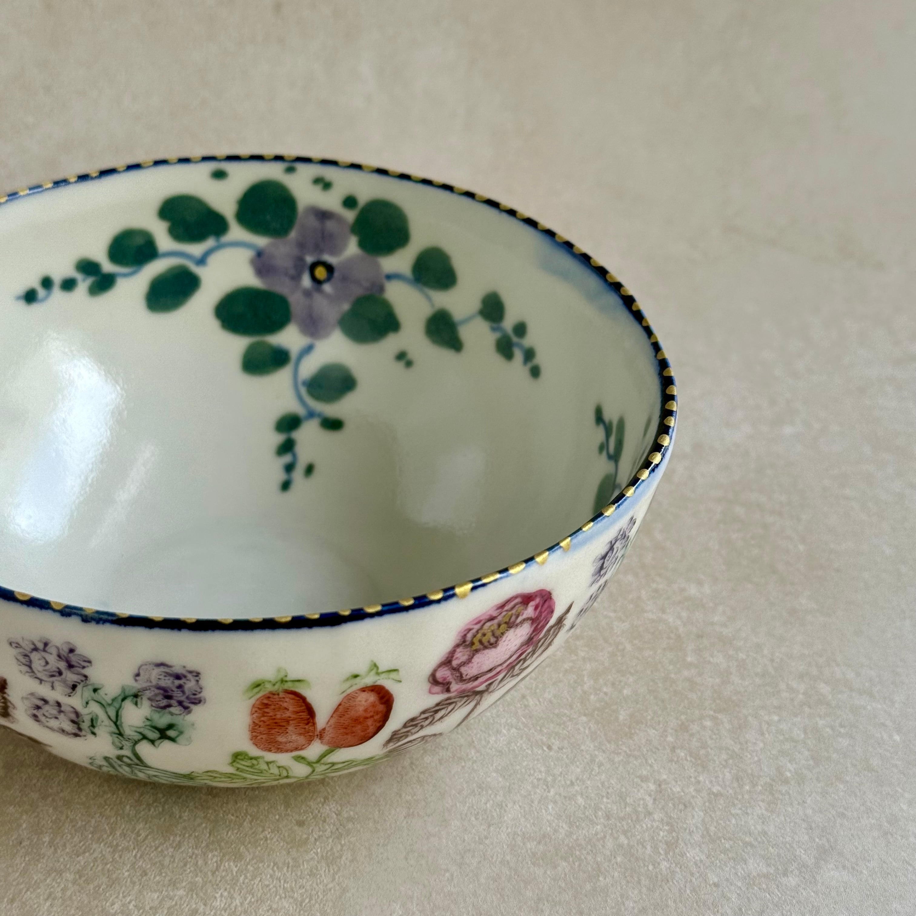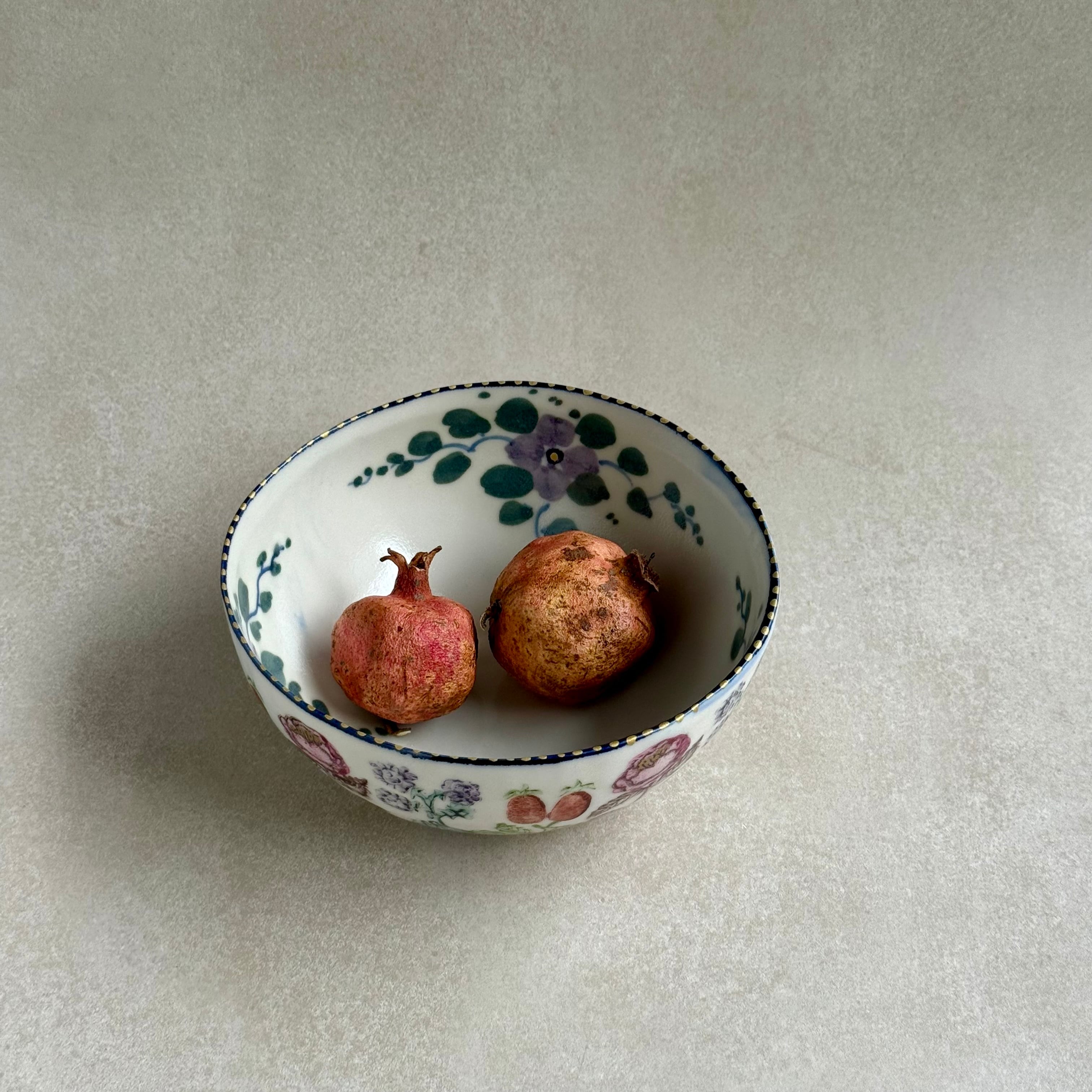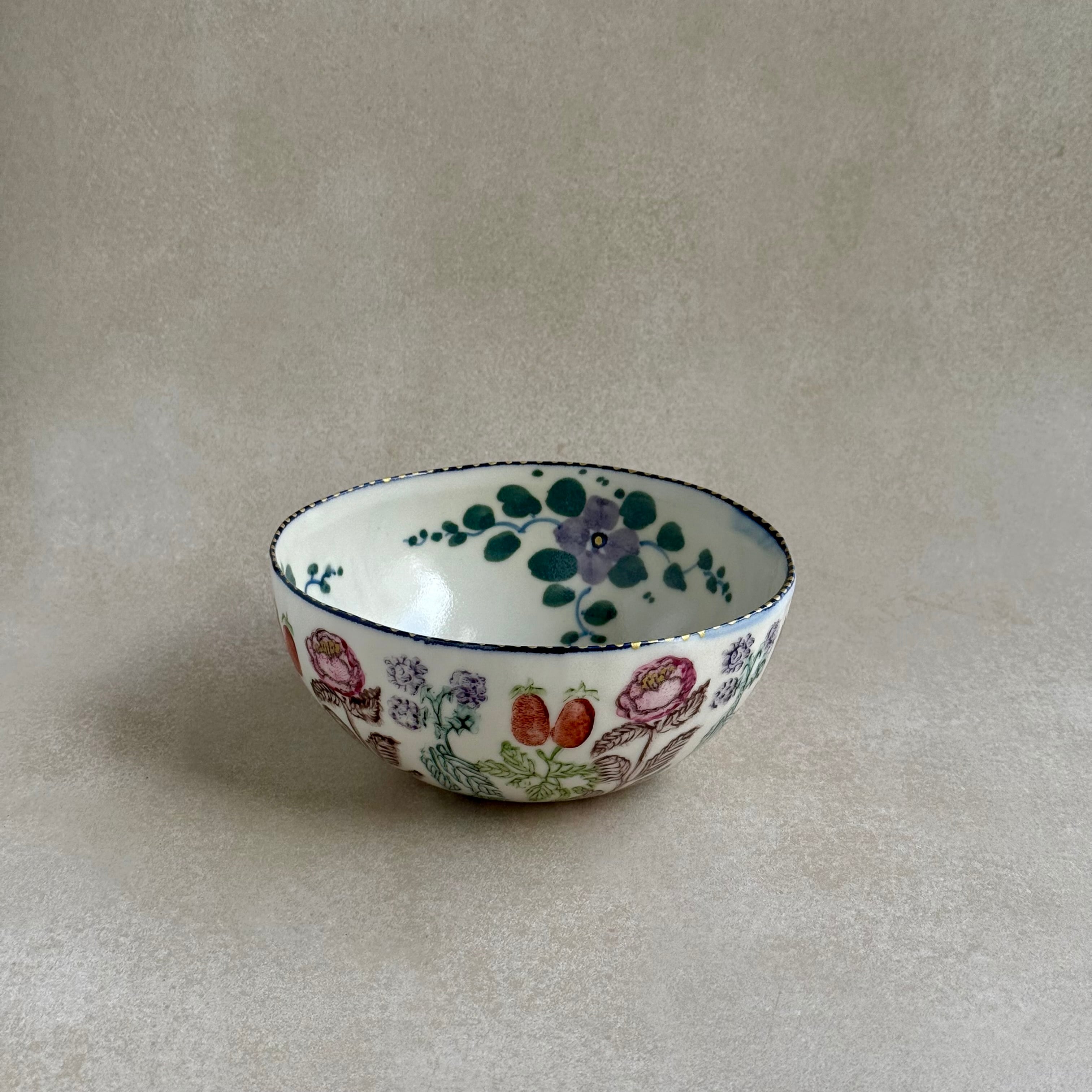 彩り豊かな植物などのモチーフは、印判や手書きで一つ一つ丁寧に描かれています。手捻りならではの温かさが感じられる作品。