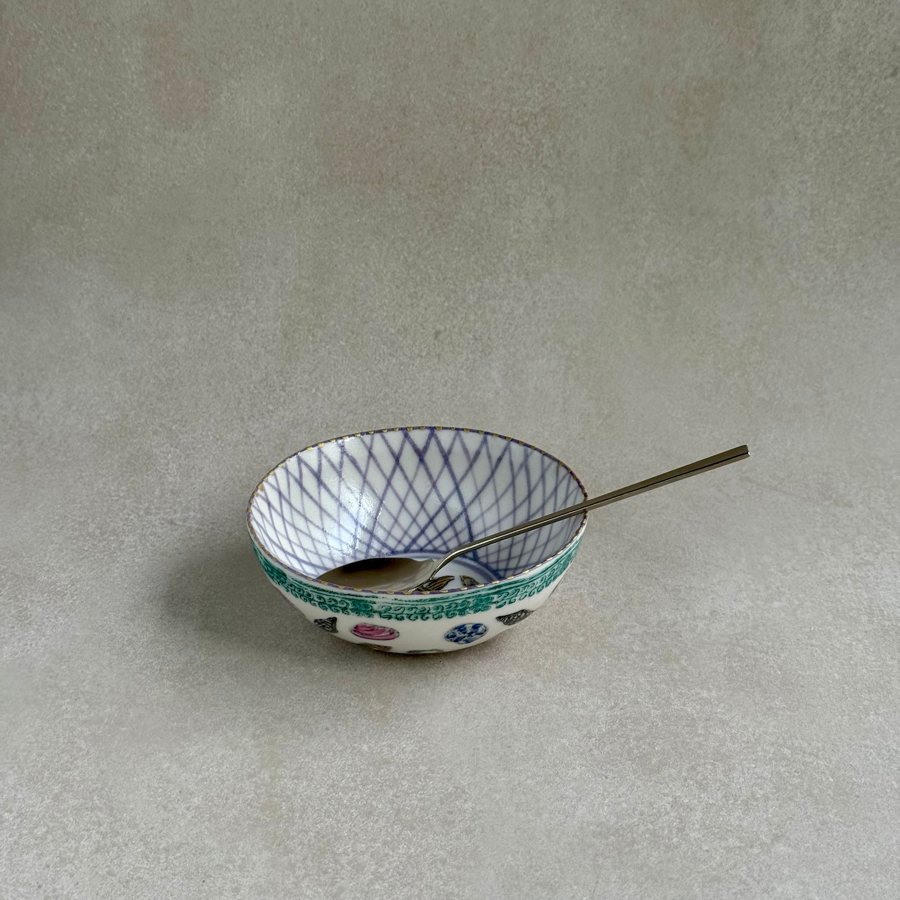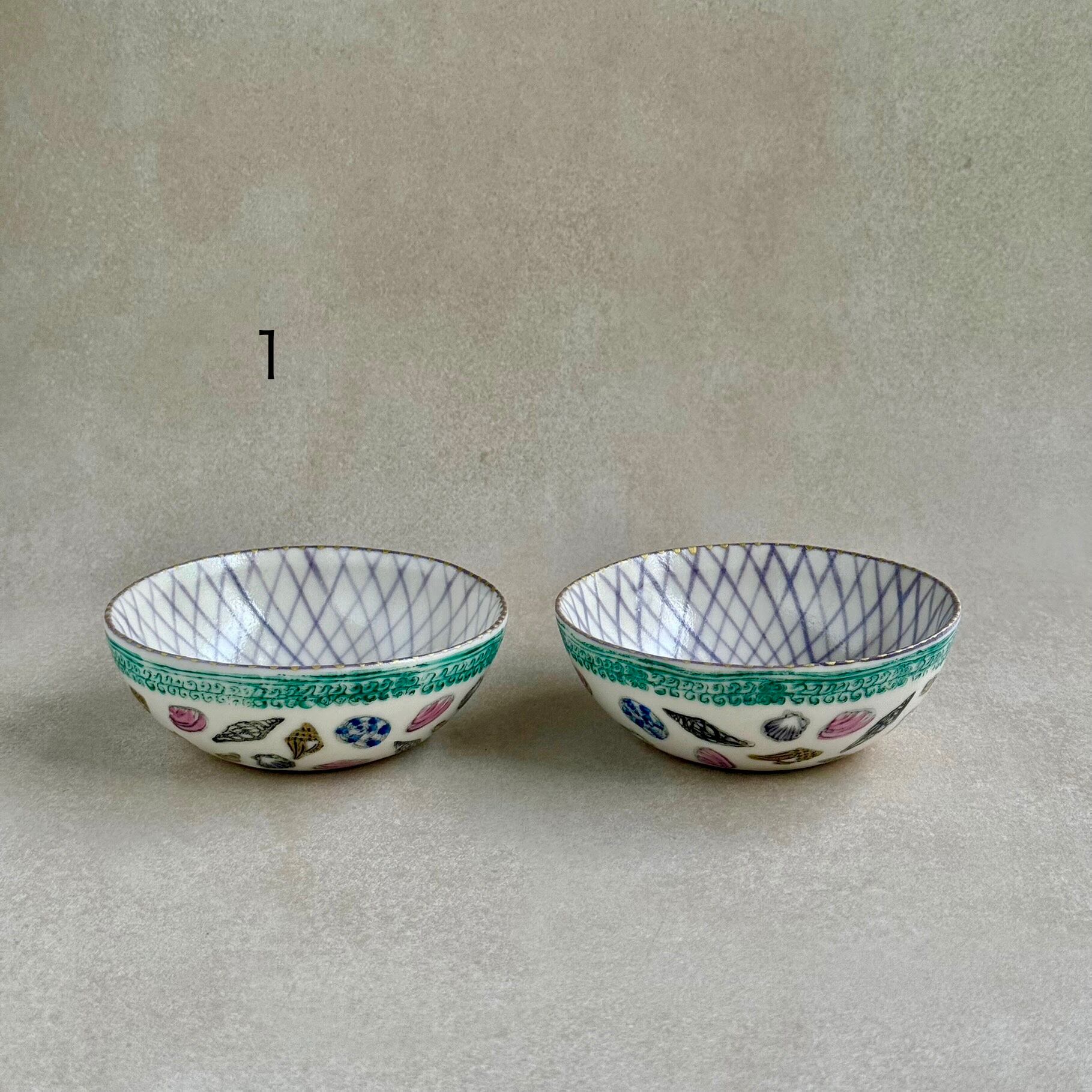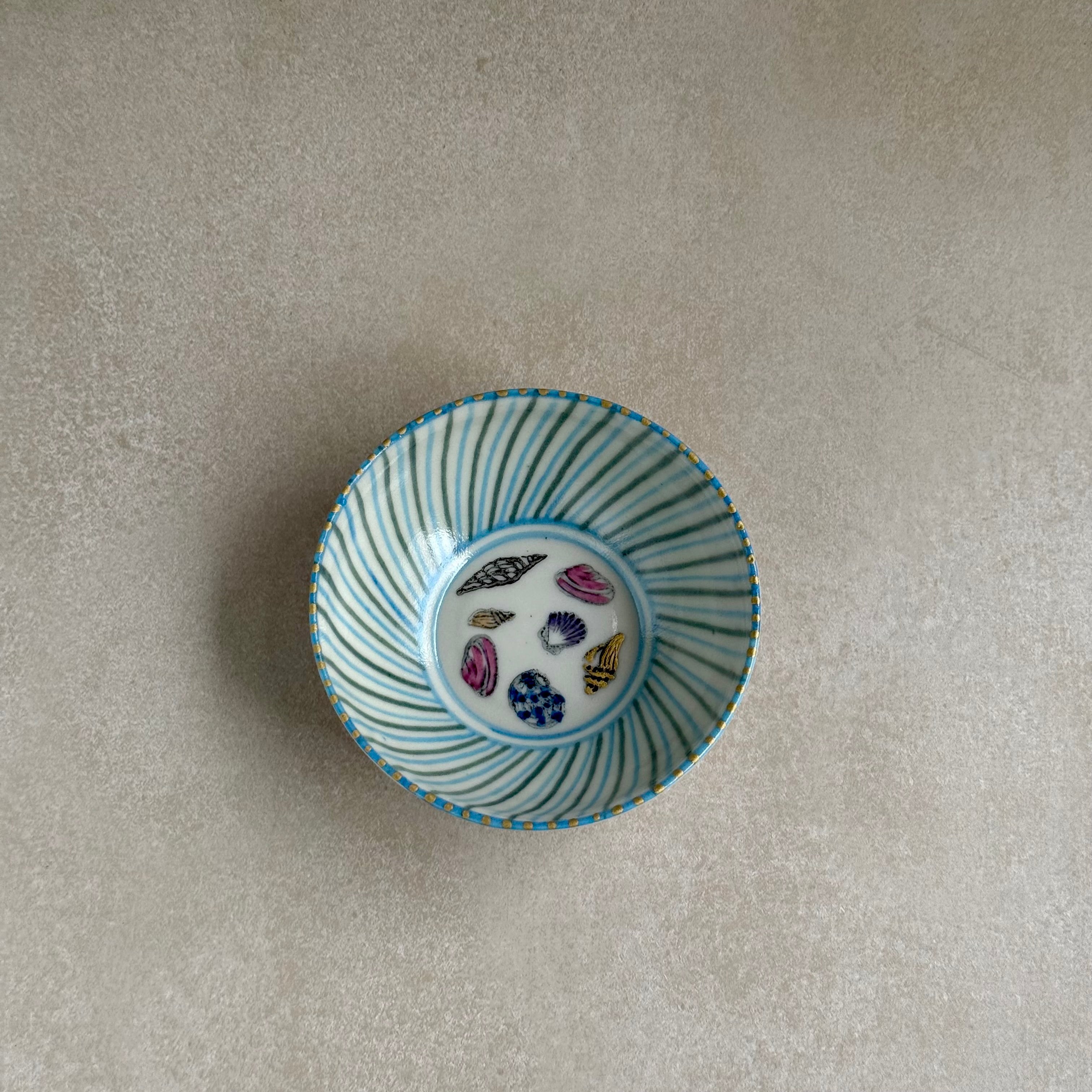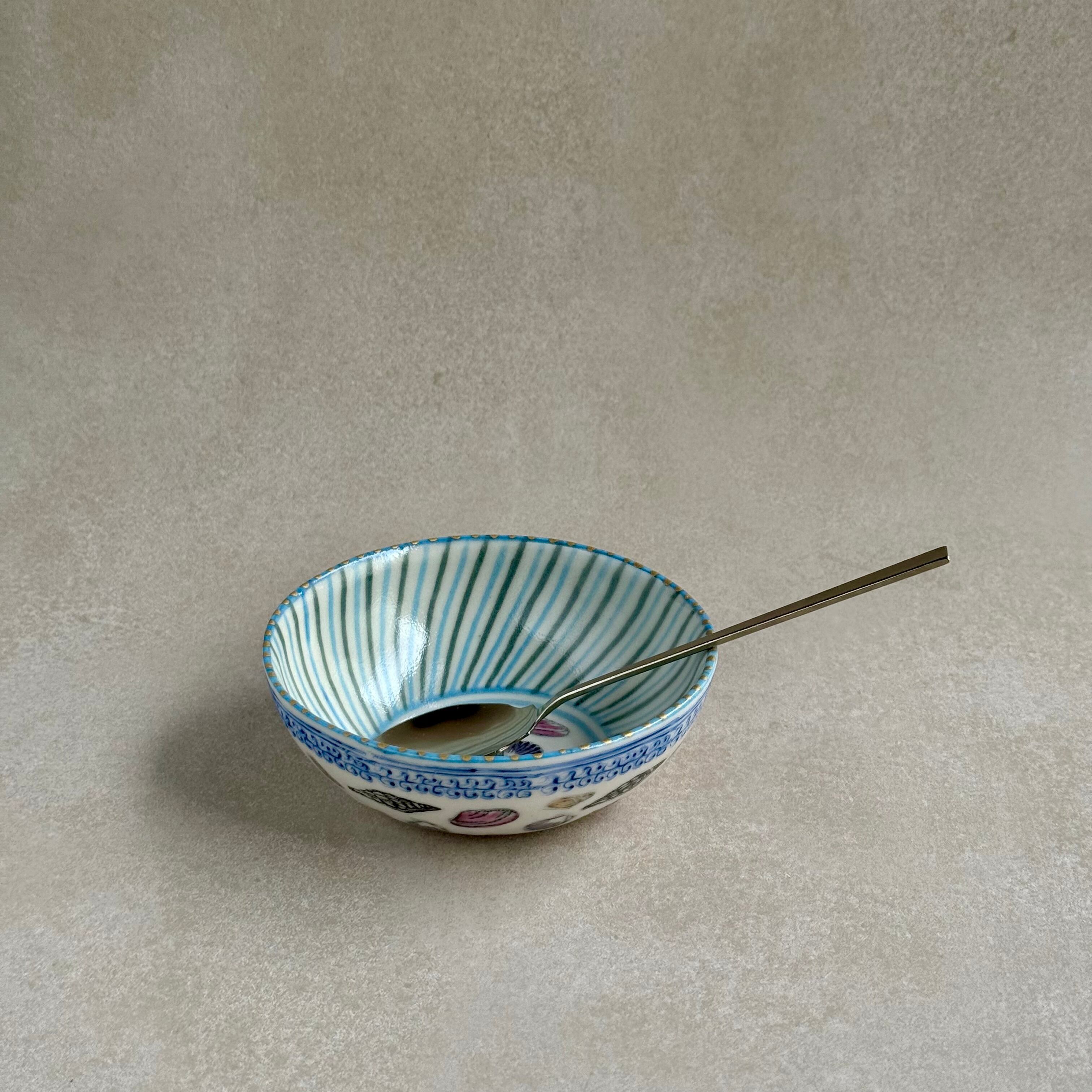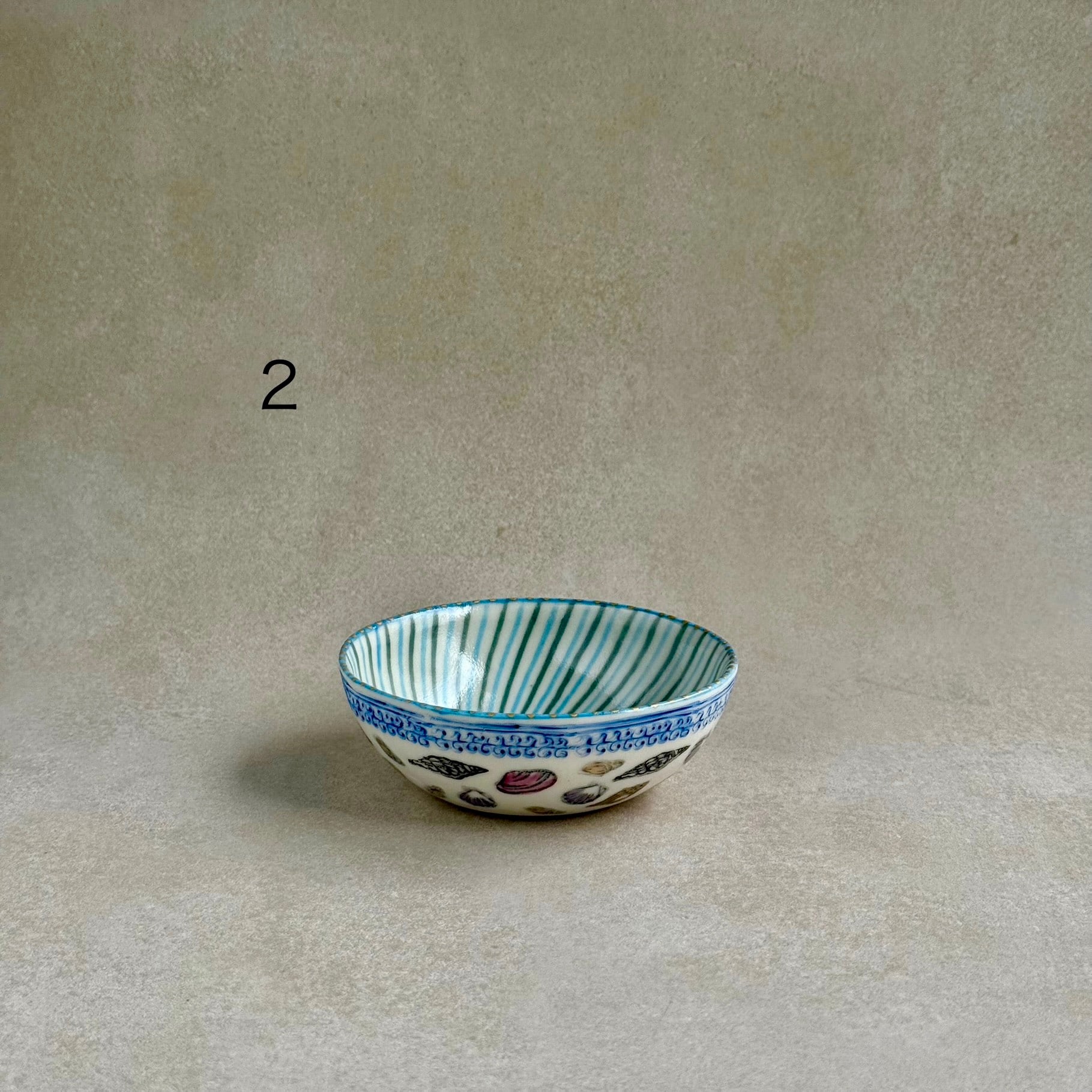 印判や手書きで一つ一つ丁寧に描かれています。手捻りならではの温かさが感じられる作品。