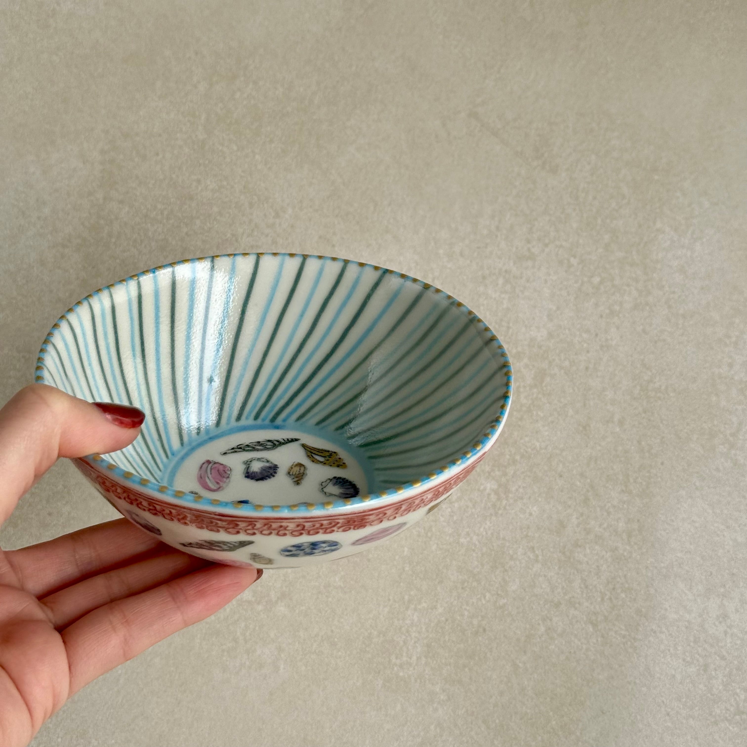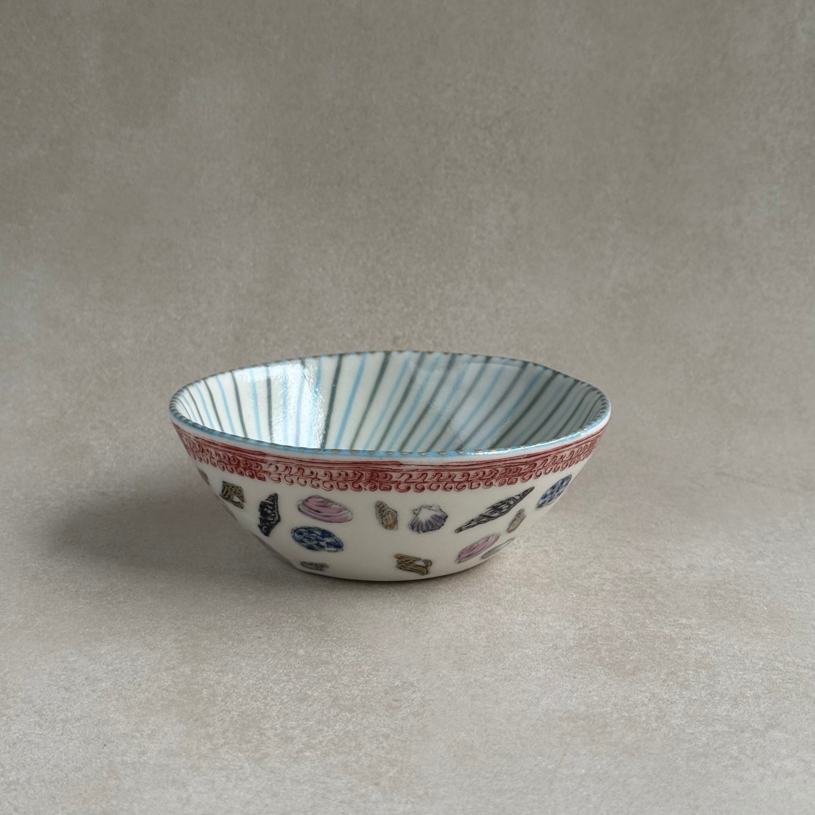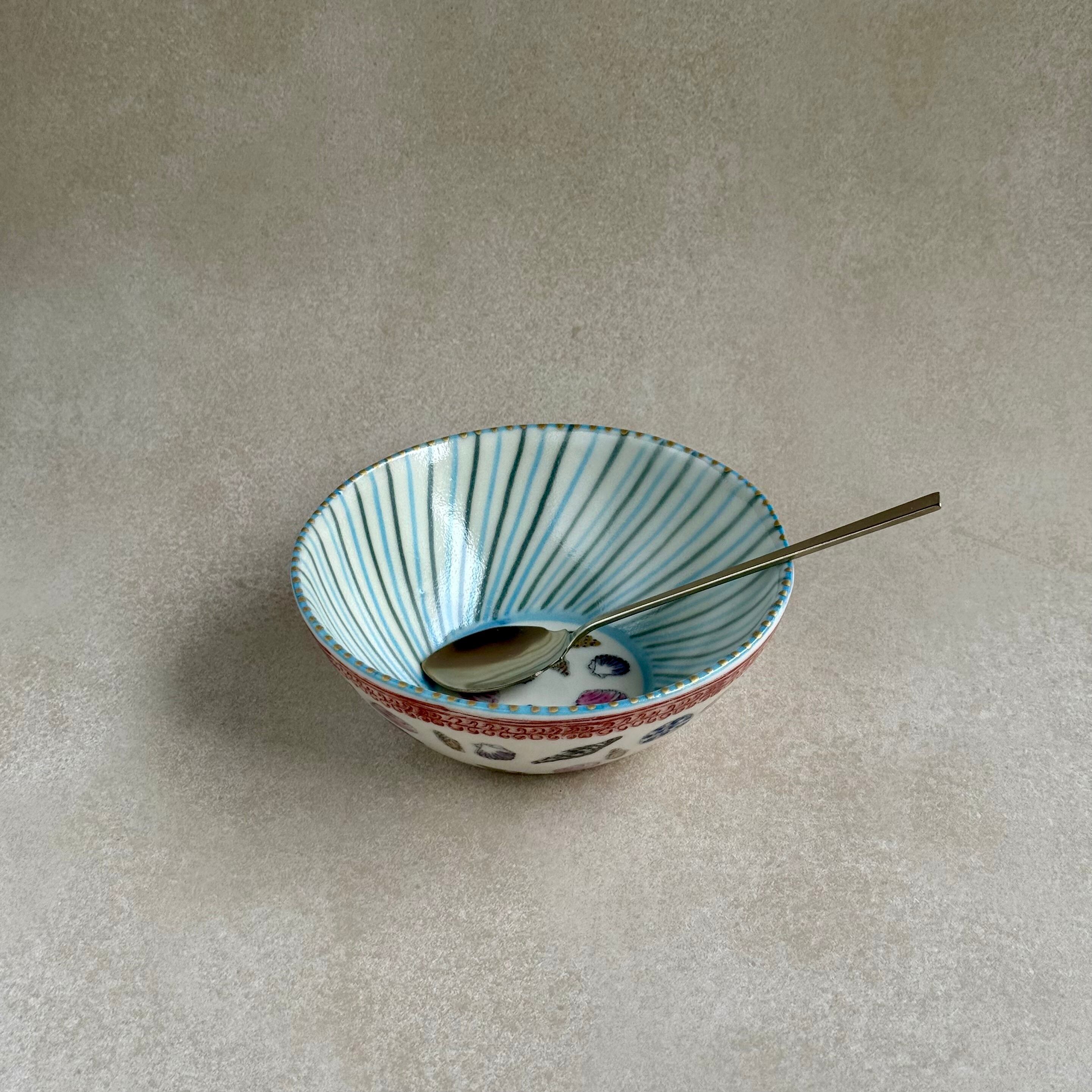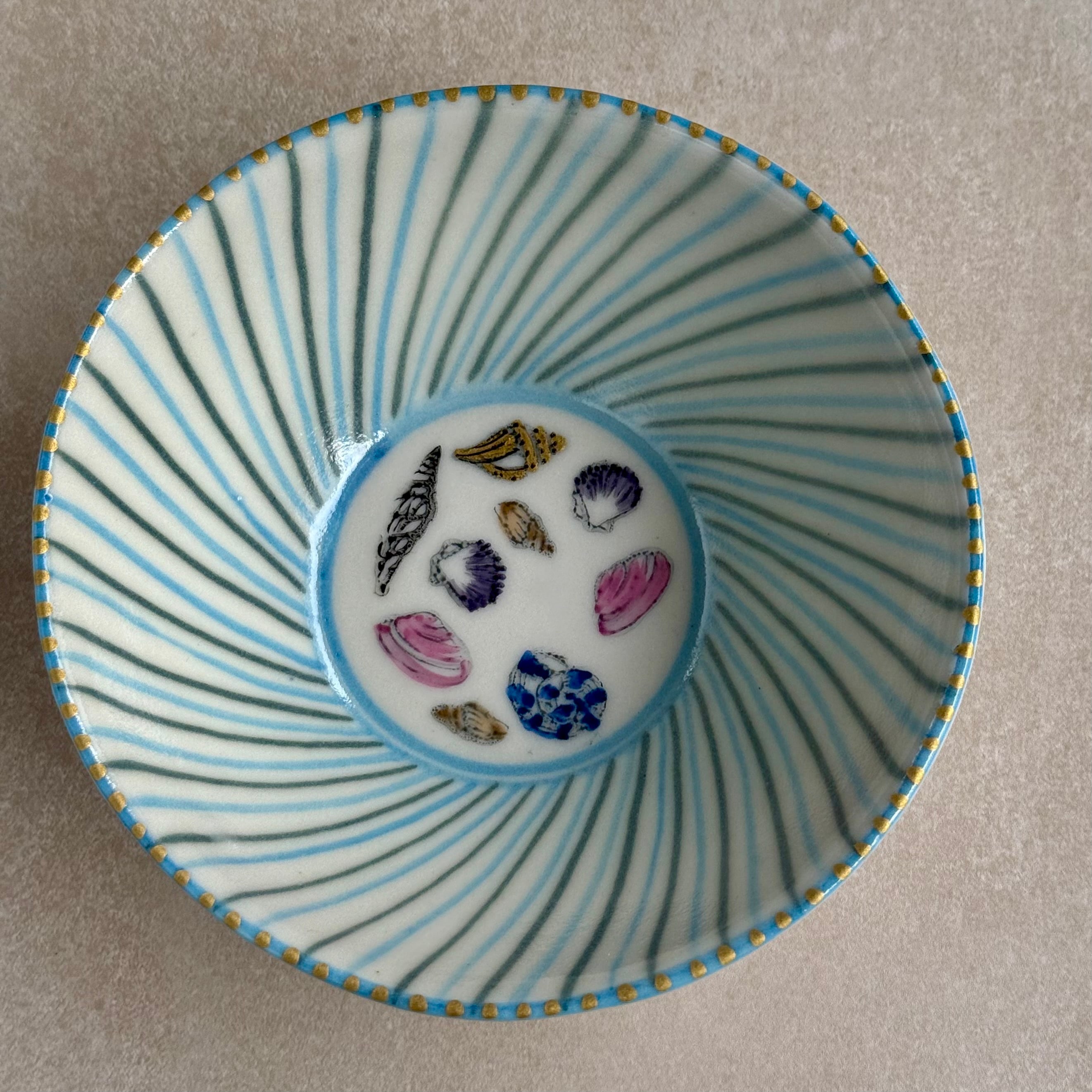 印判や手書きで一つ一つ丁寧に描かれています。手捻りならではの温かさが感じられる作品。
