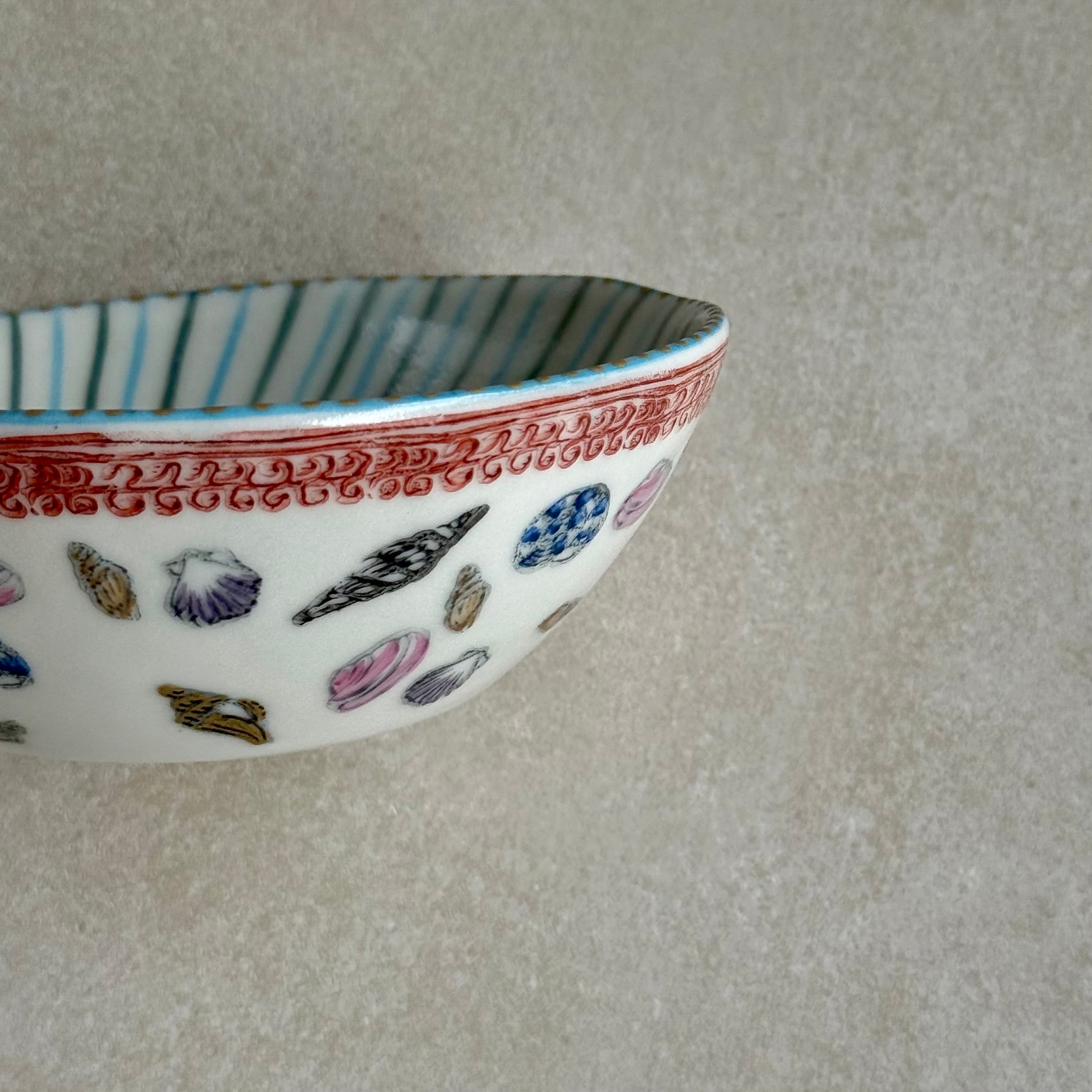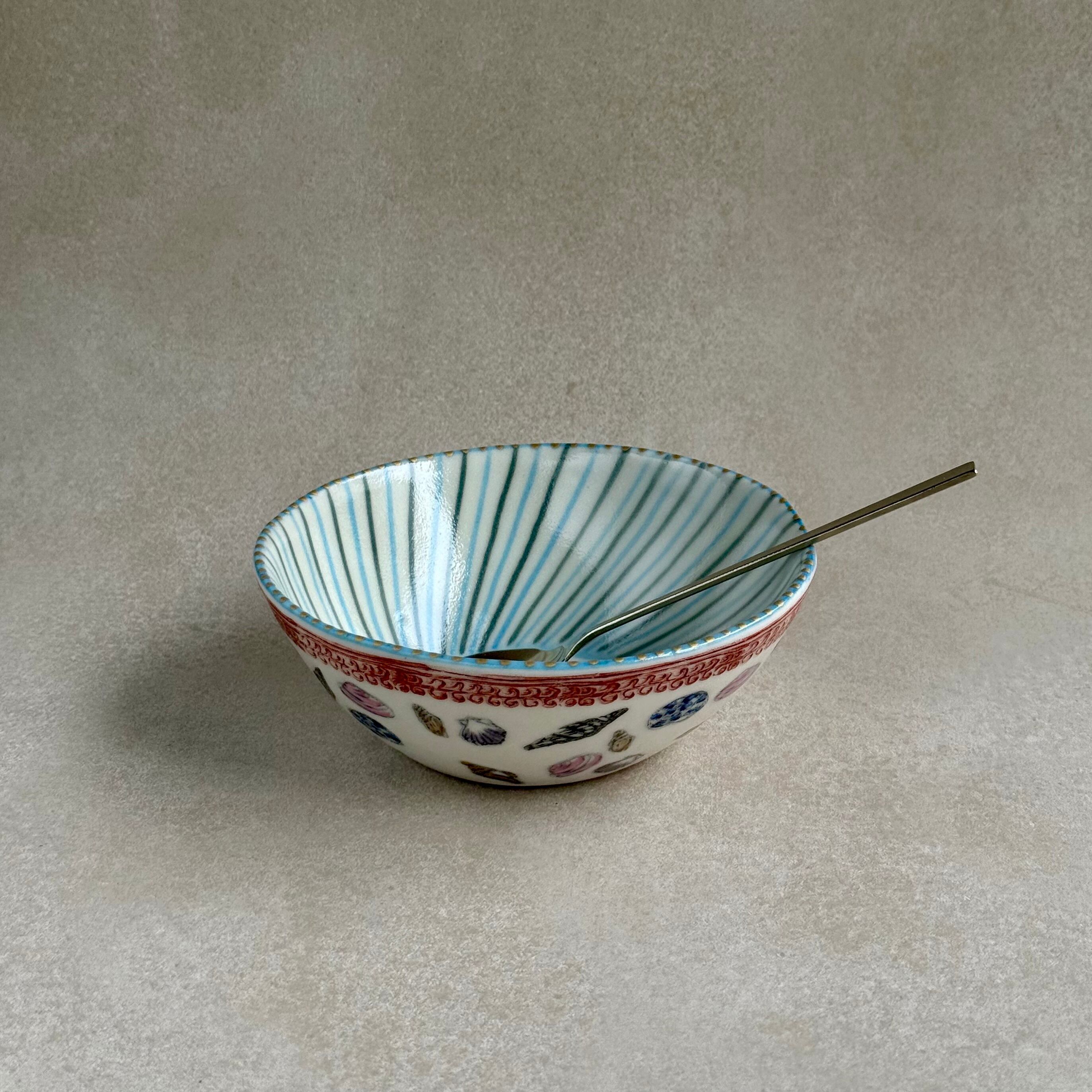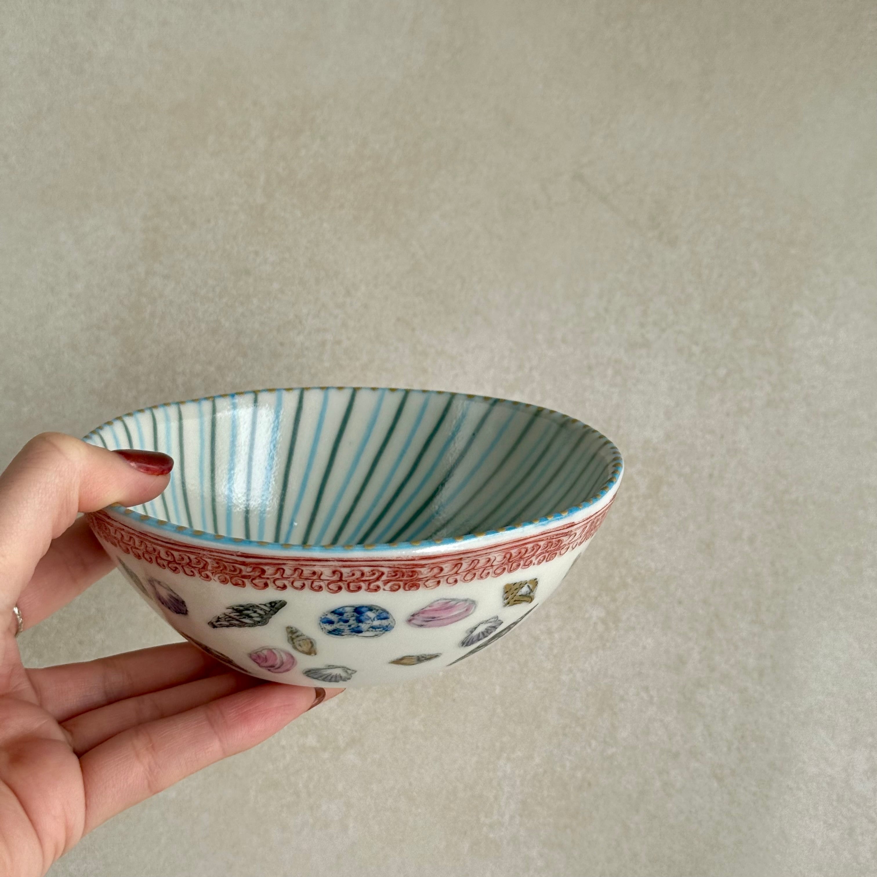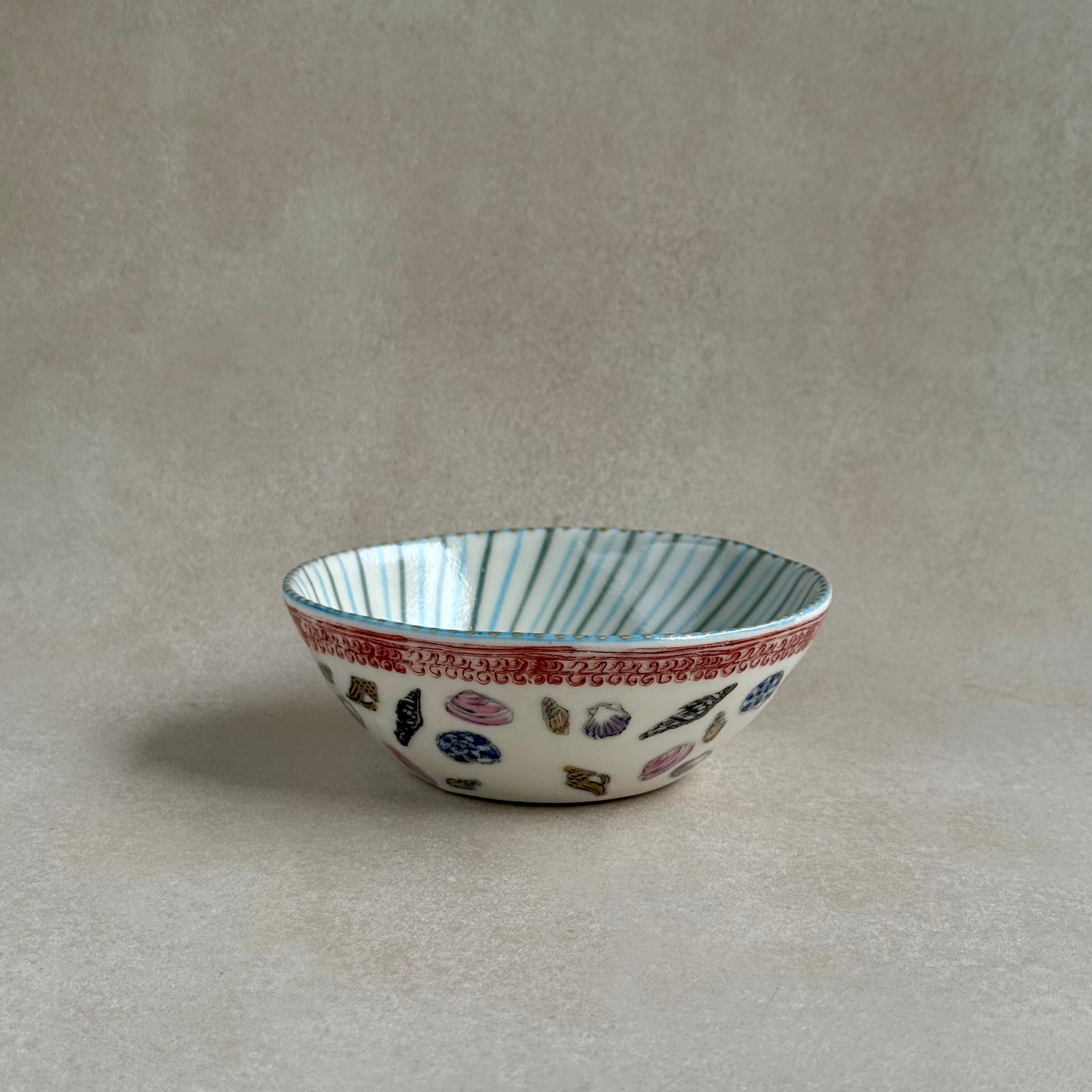 印判や手書きで一つ一つ丁寧に描かれています。手捻りならではの温かさが感じられる作品。