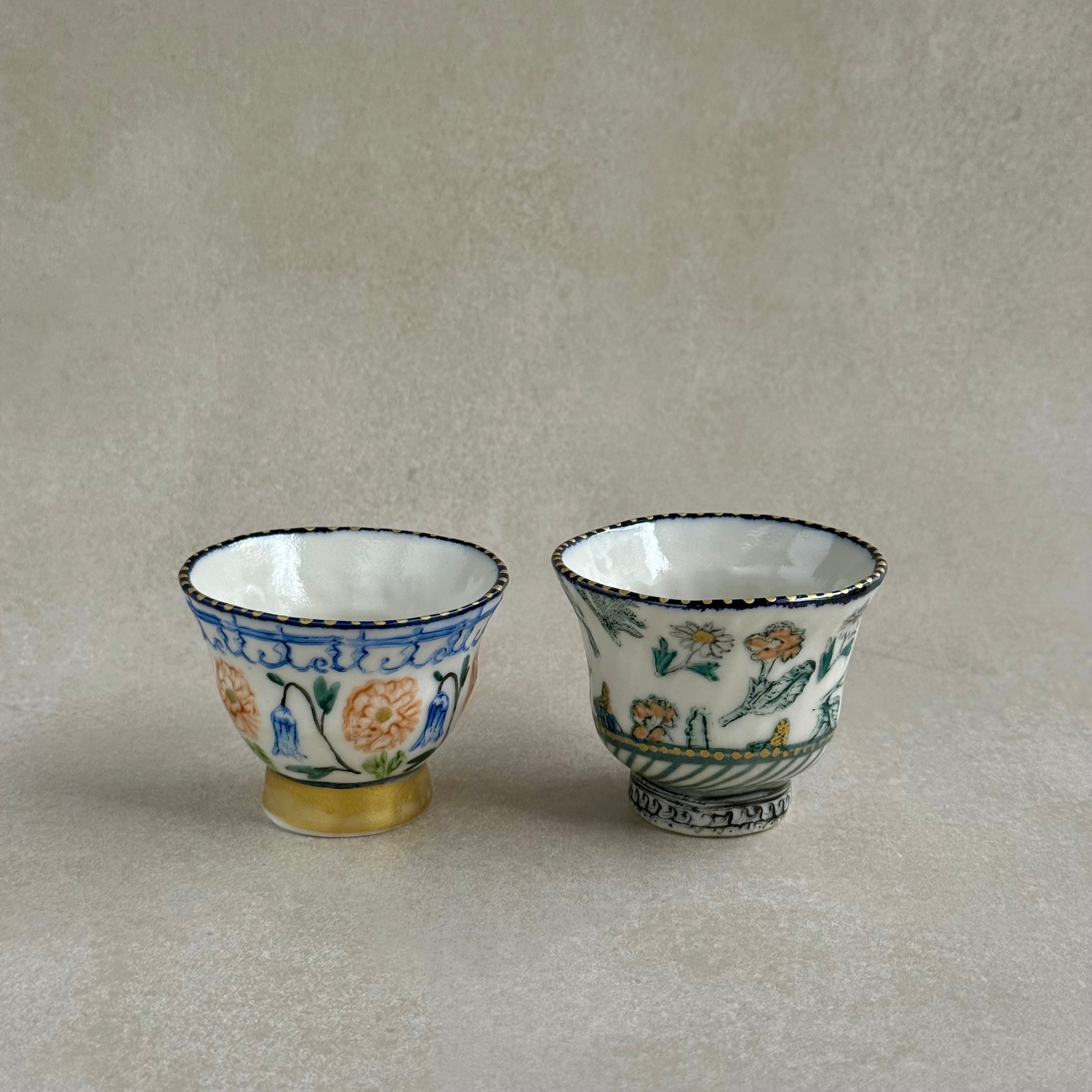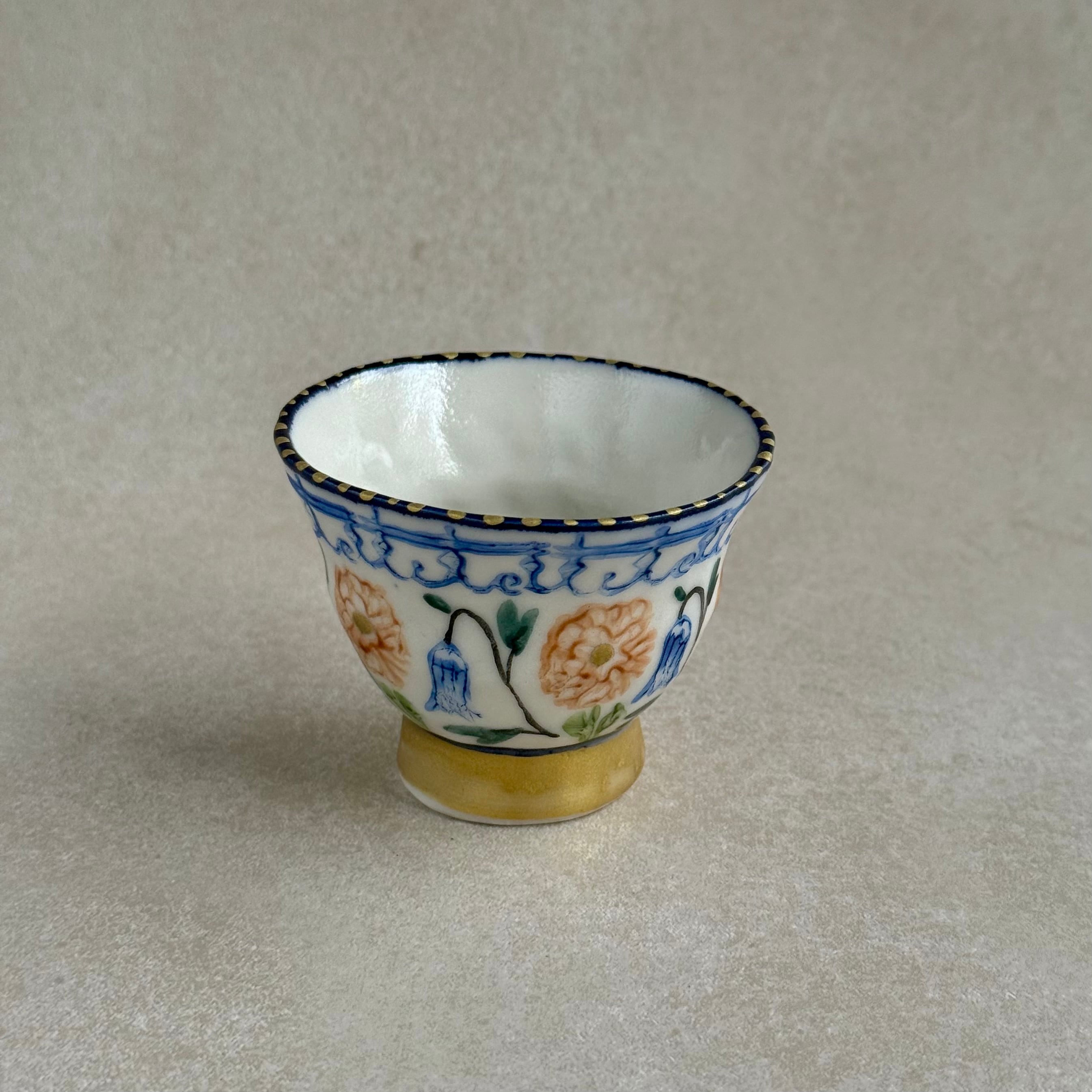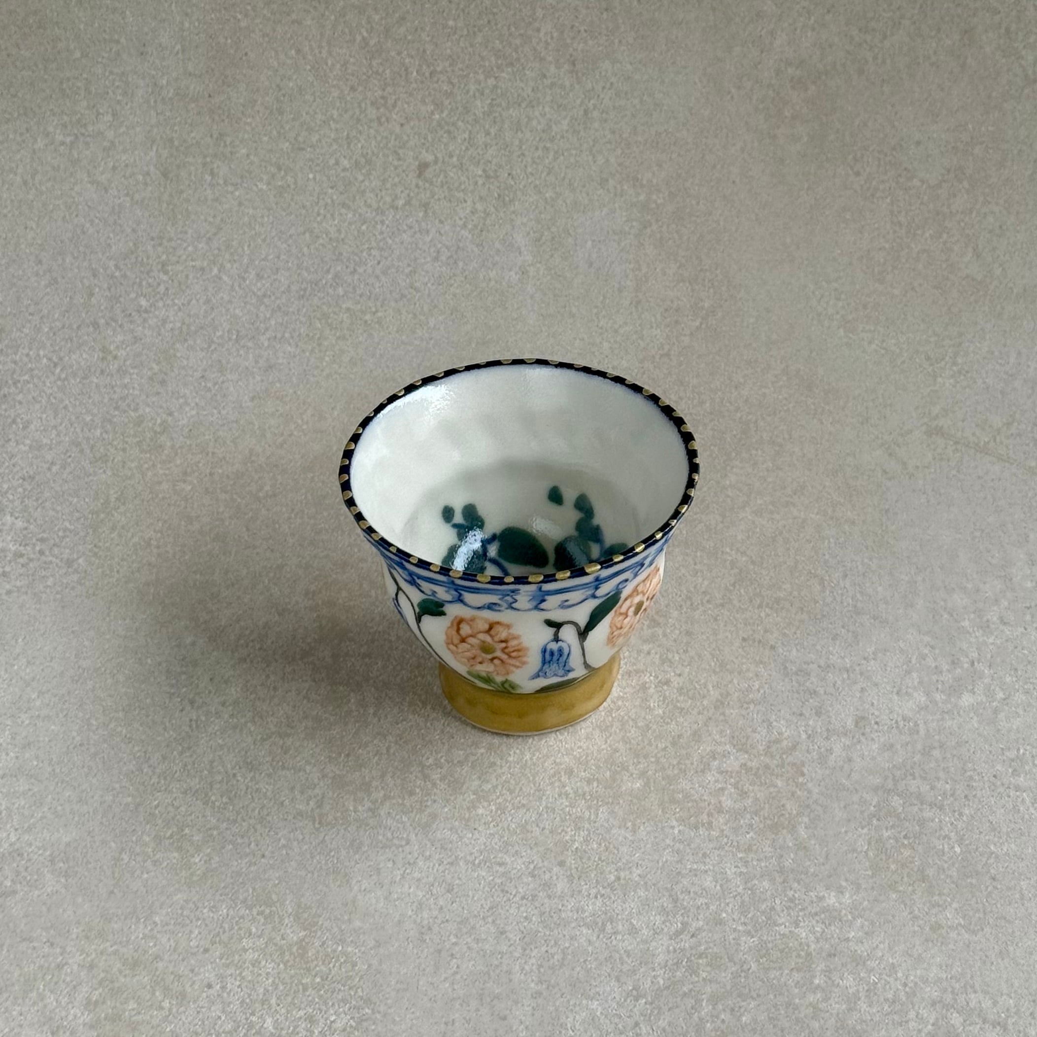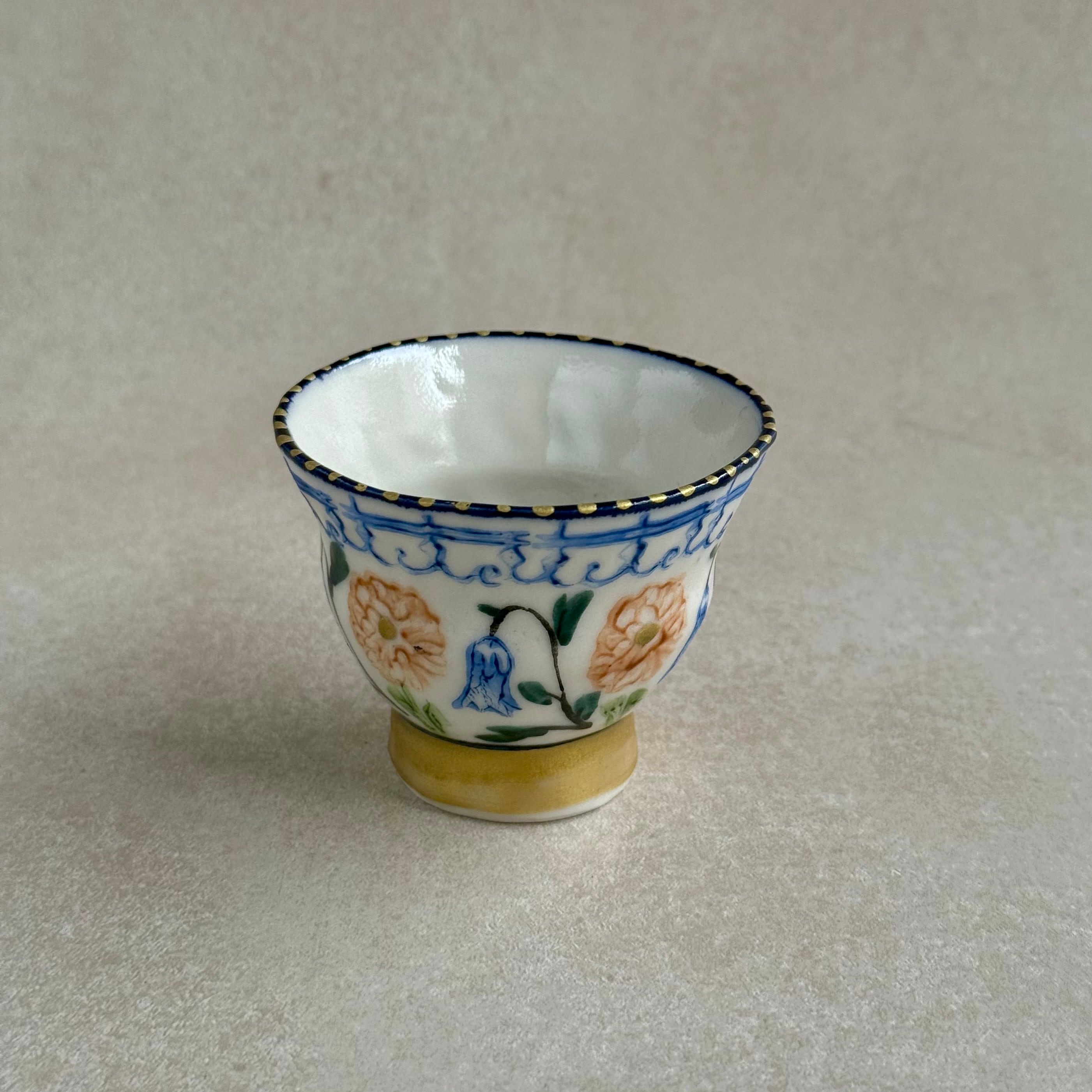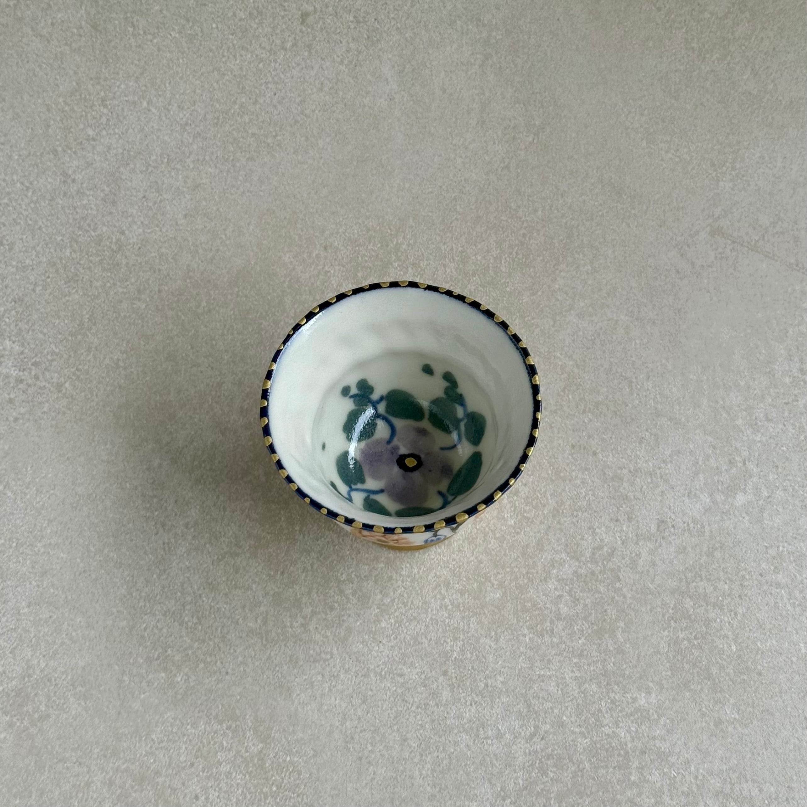 彩り豊かな植物などのモチーフは、印判や手書きで一つ一つ丁寧に描かれています。手捻りならではの温かさが感じられる作品。