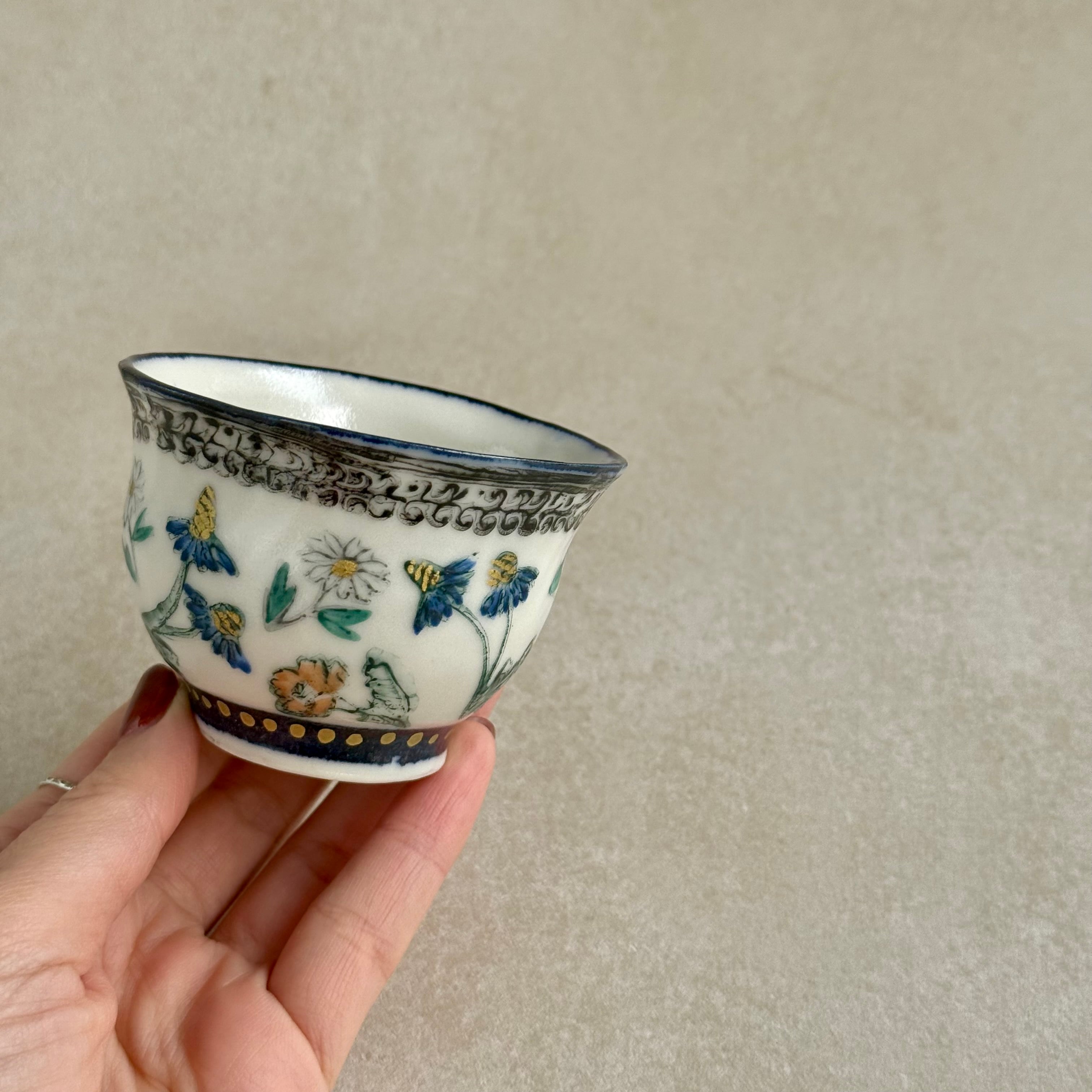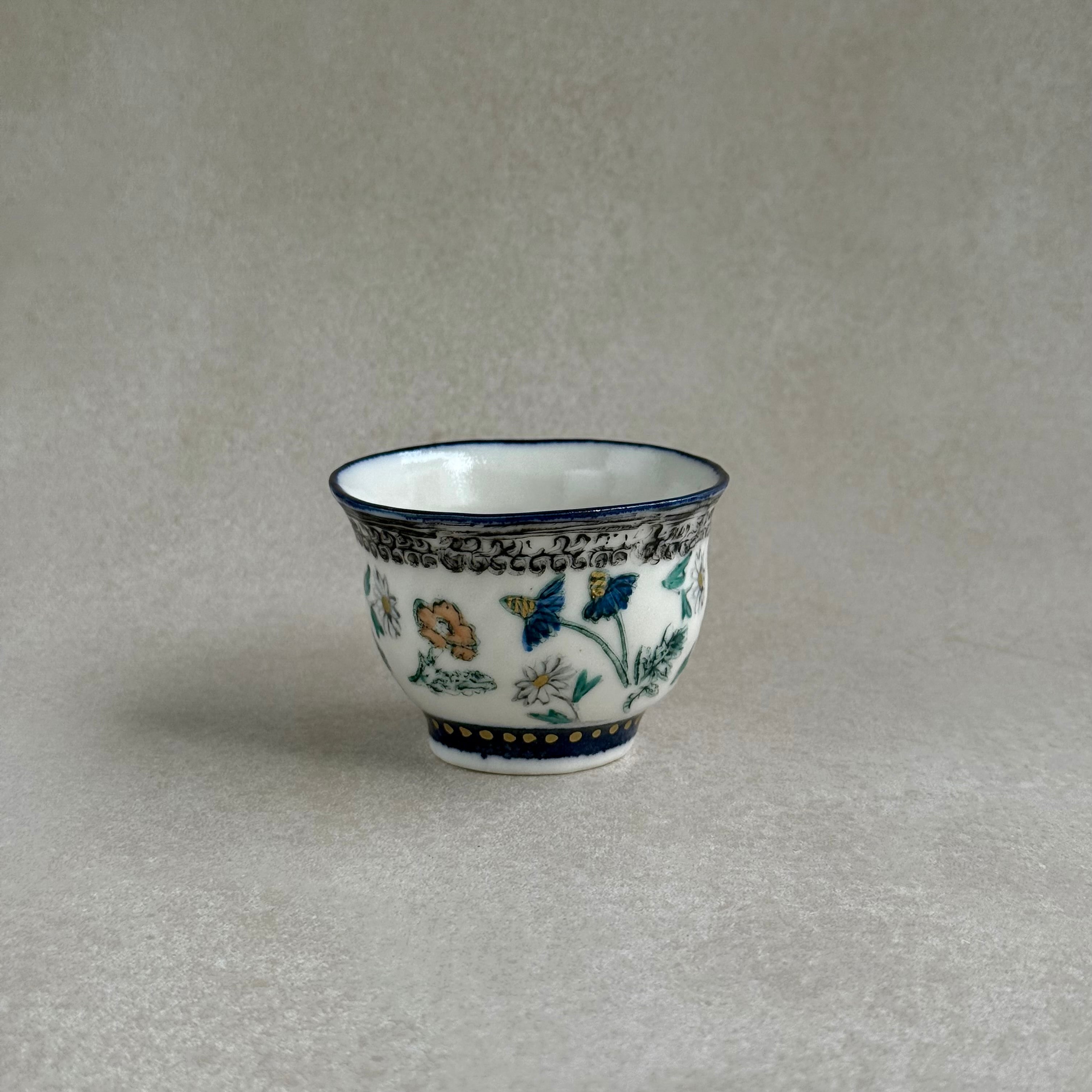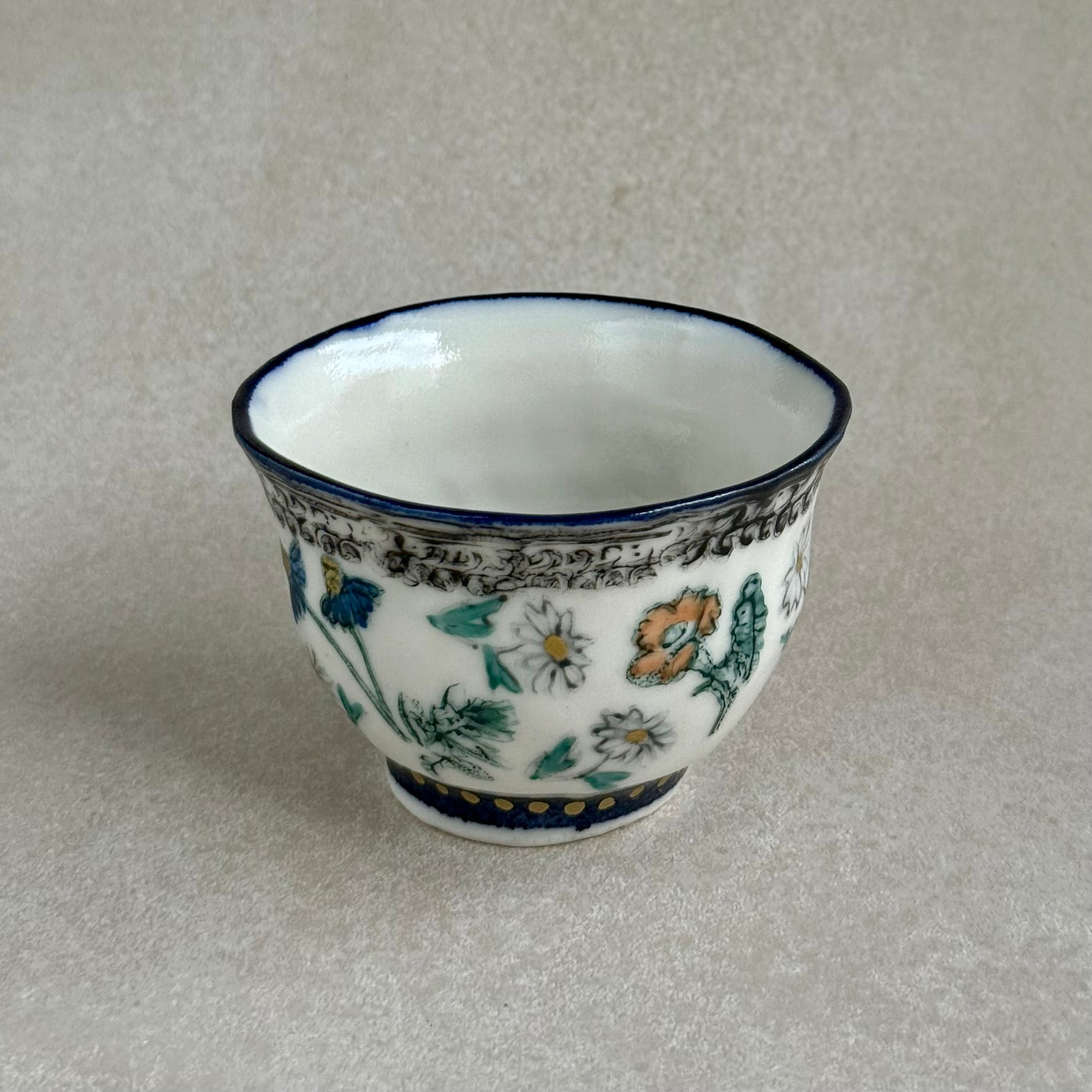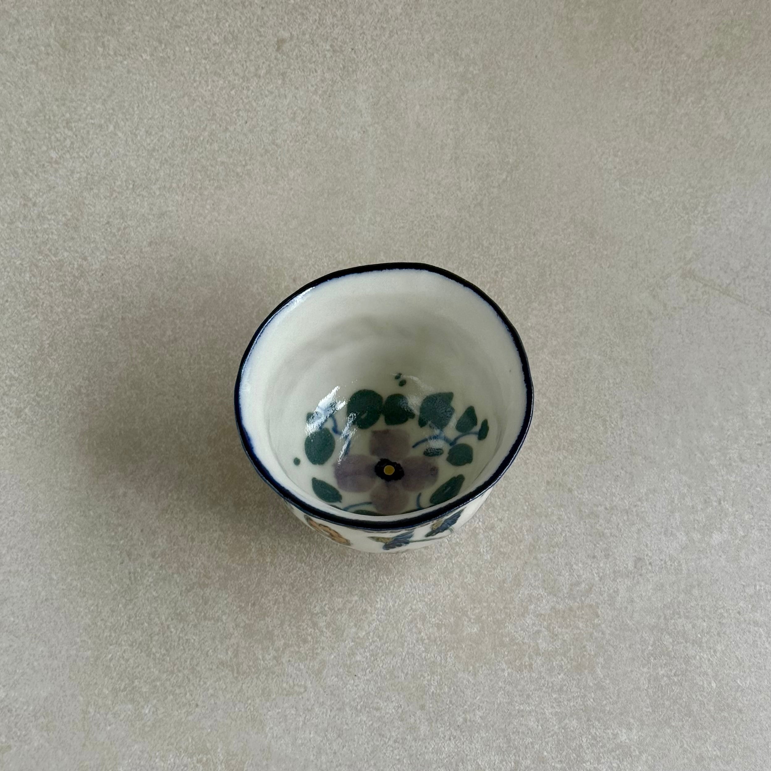 彩り豊かな植物などのモチーフは、印判や手書きで一つ一つ丁寧に描かれています。手捻りならではの温かさが感じられる作品。