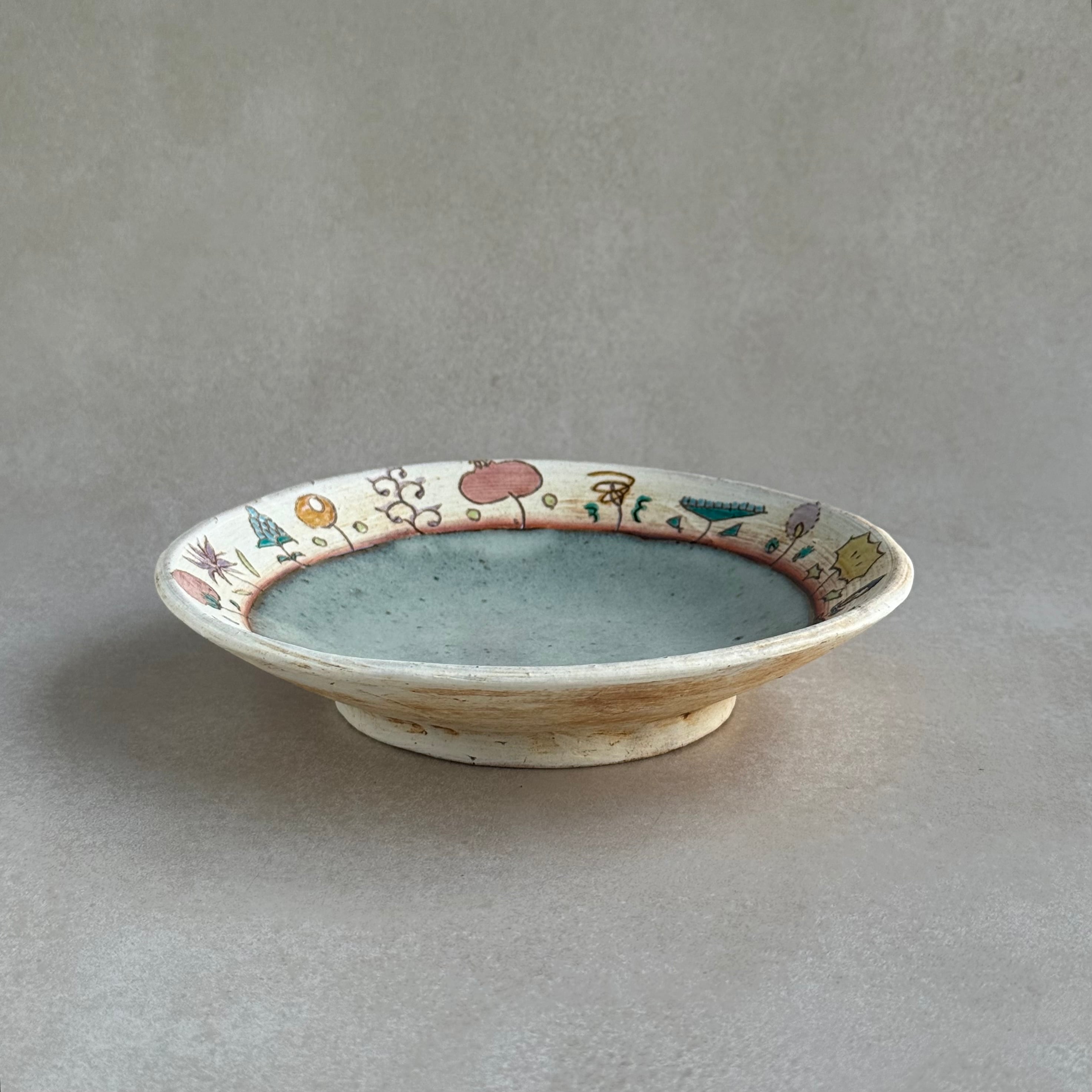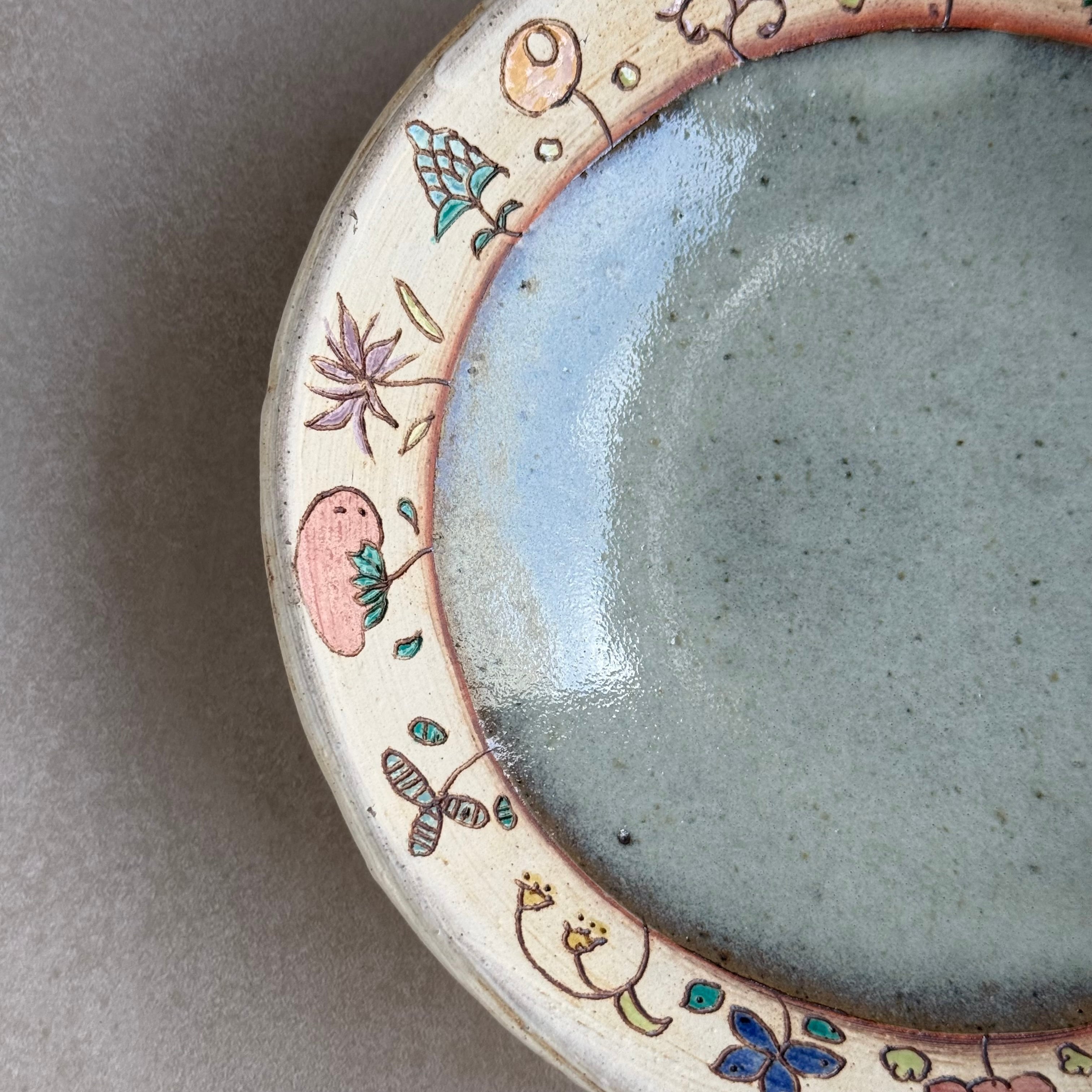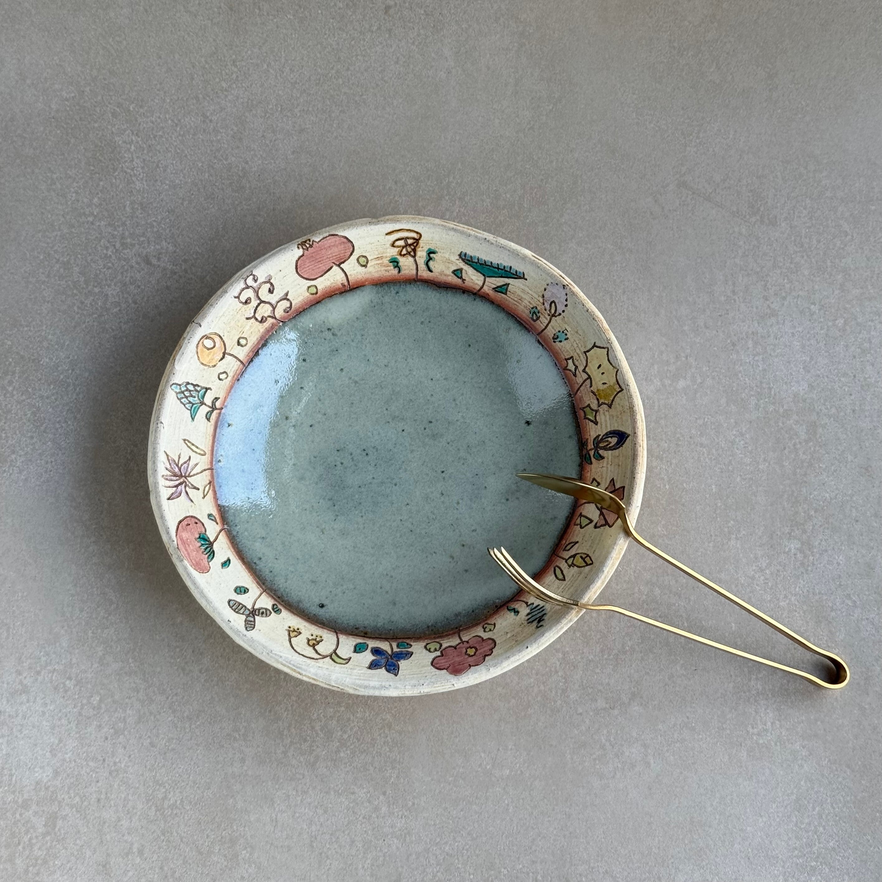 大平真己 色花絵 中皿です。かわいい模様が特徴の、見ているだけでも楽しい作品です。