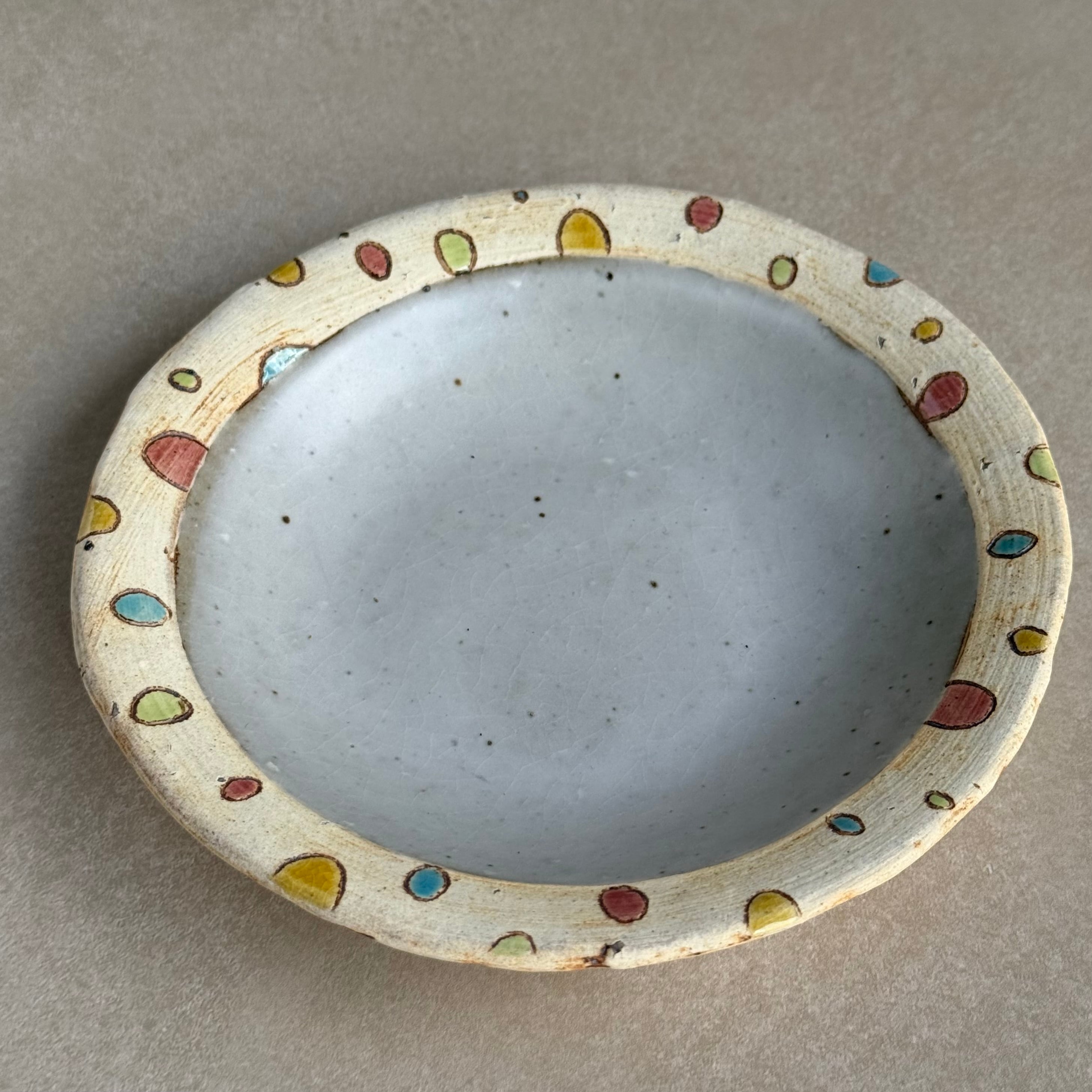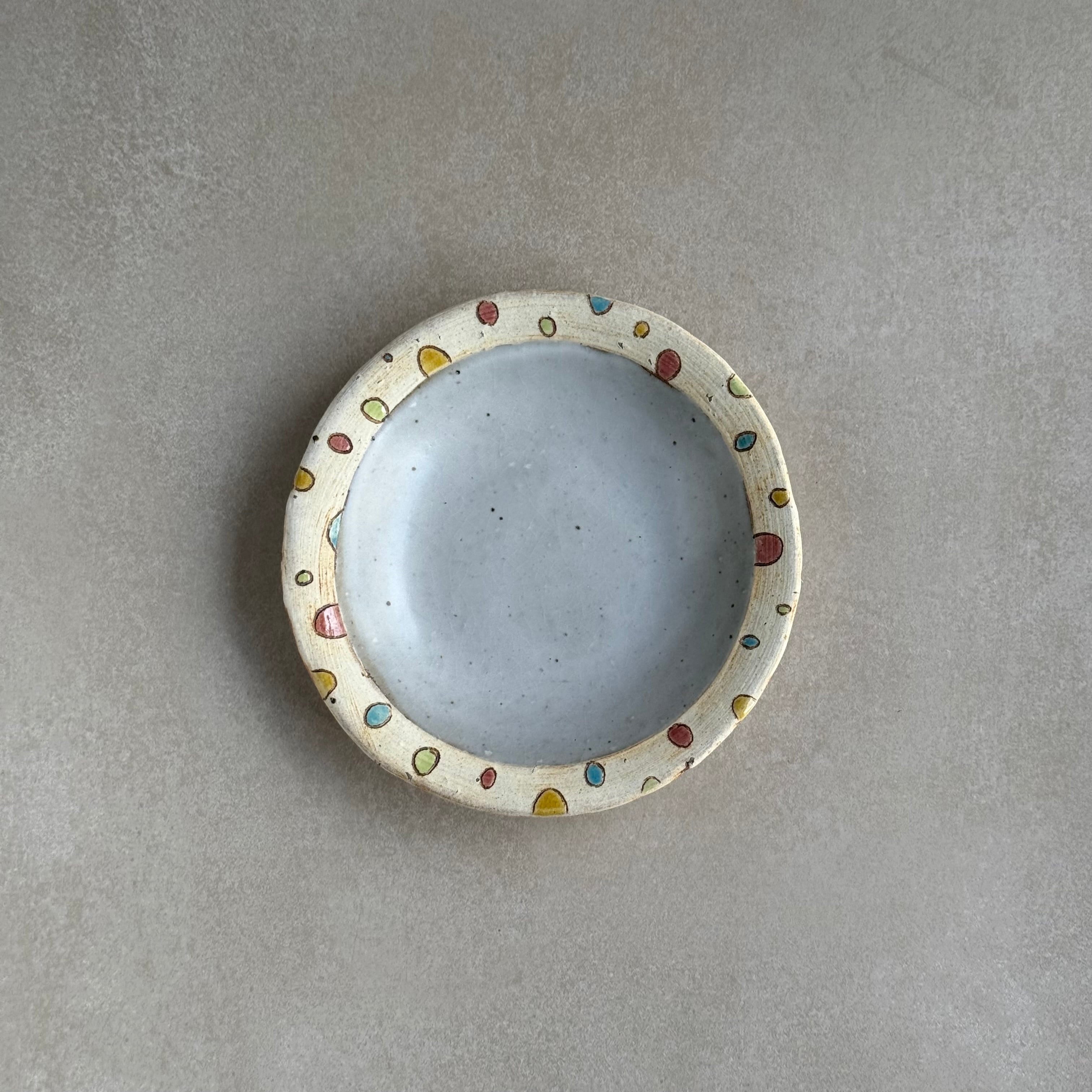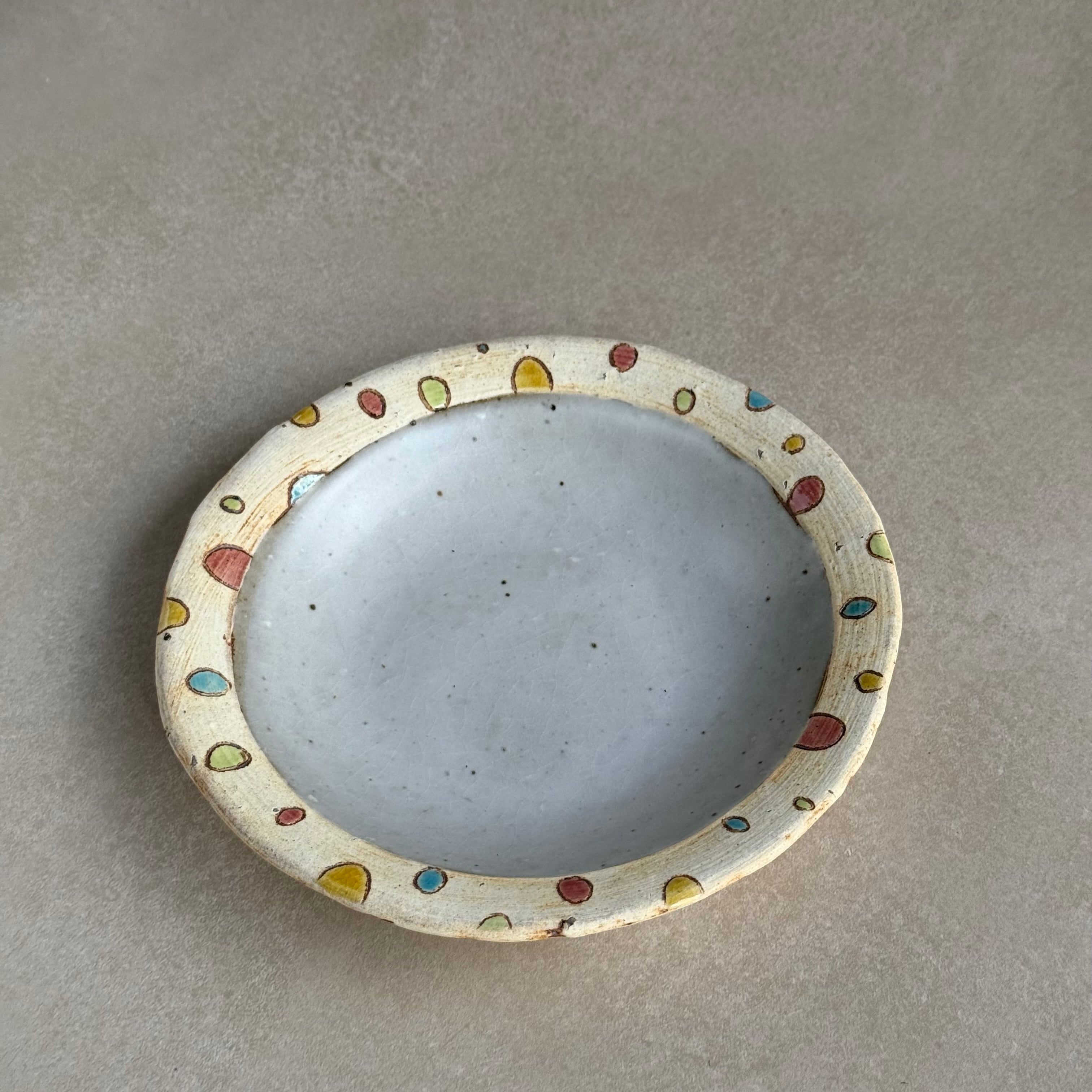 大平真己 色絵小皿です。かわいい模様が特徴の、見ているだけでも楽しい作品です。