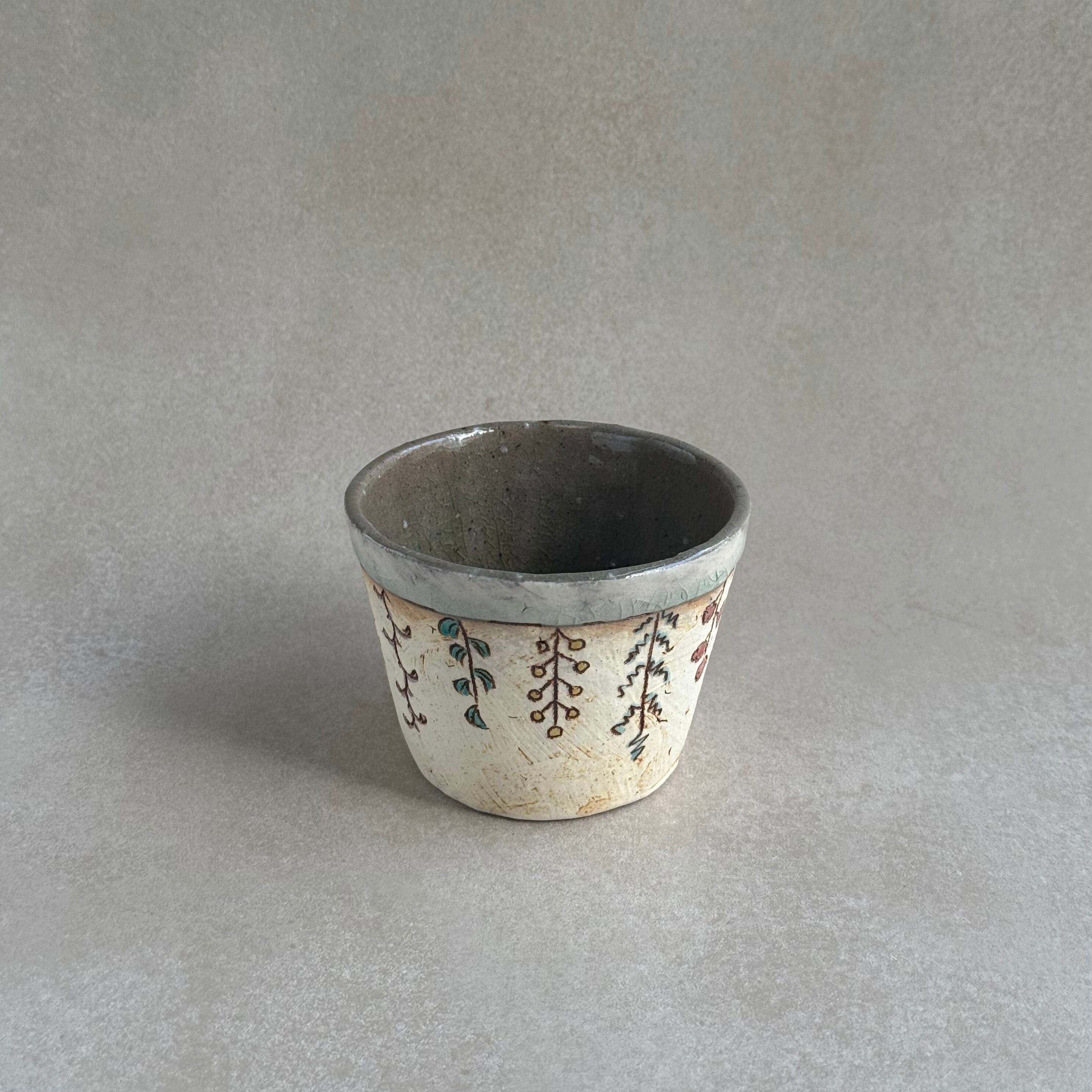 大平真己 色絵カップです。かわいい模様が特徴の、見ているだけでも楽しい作品です。