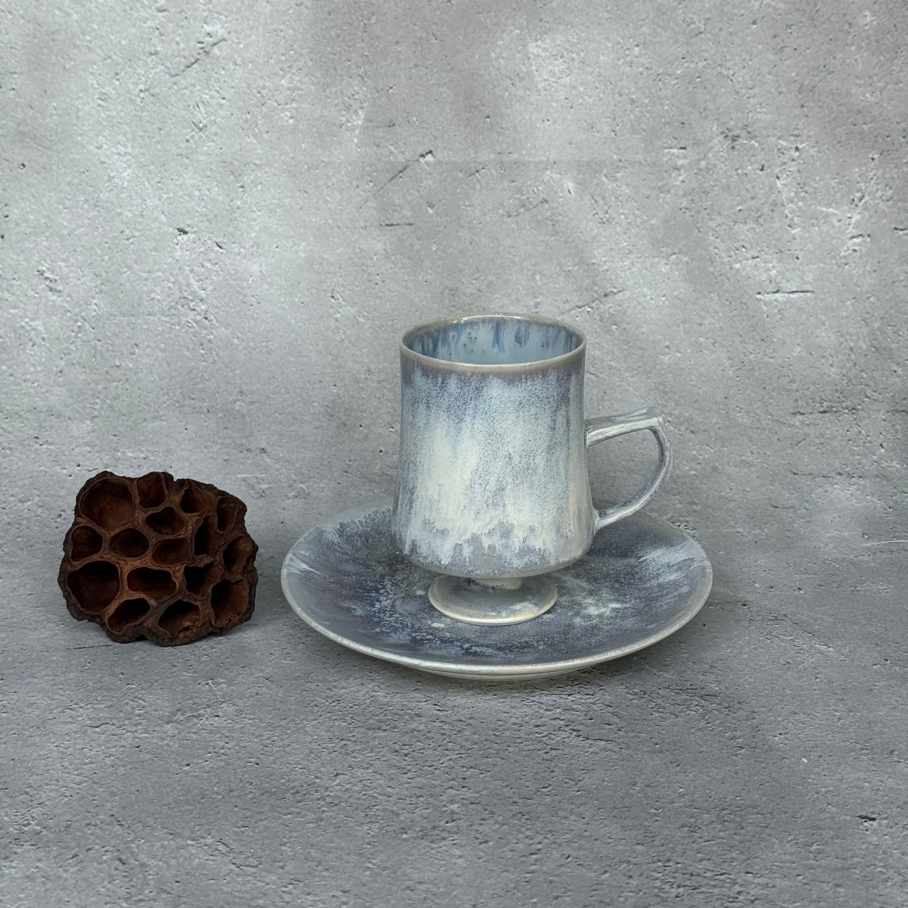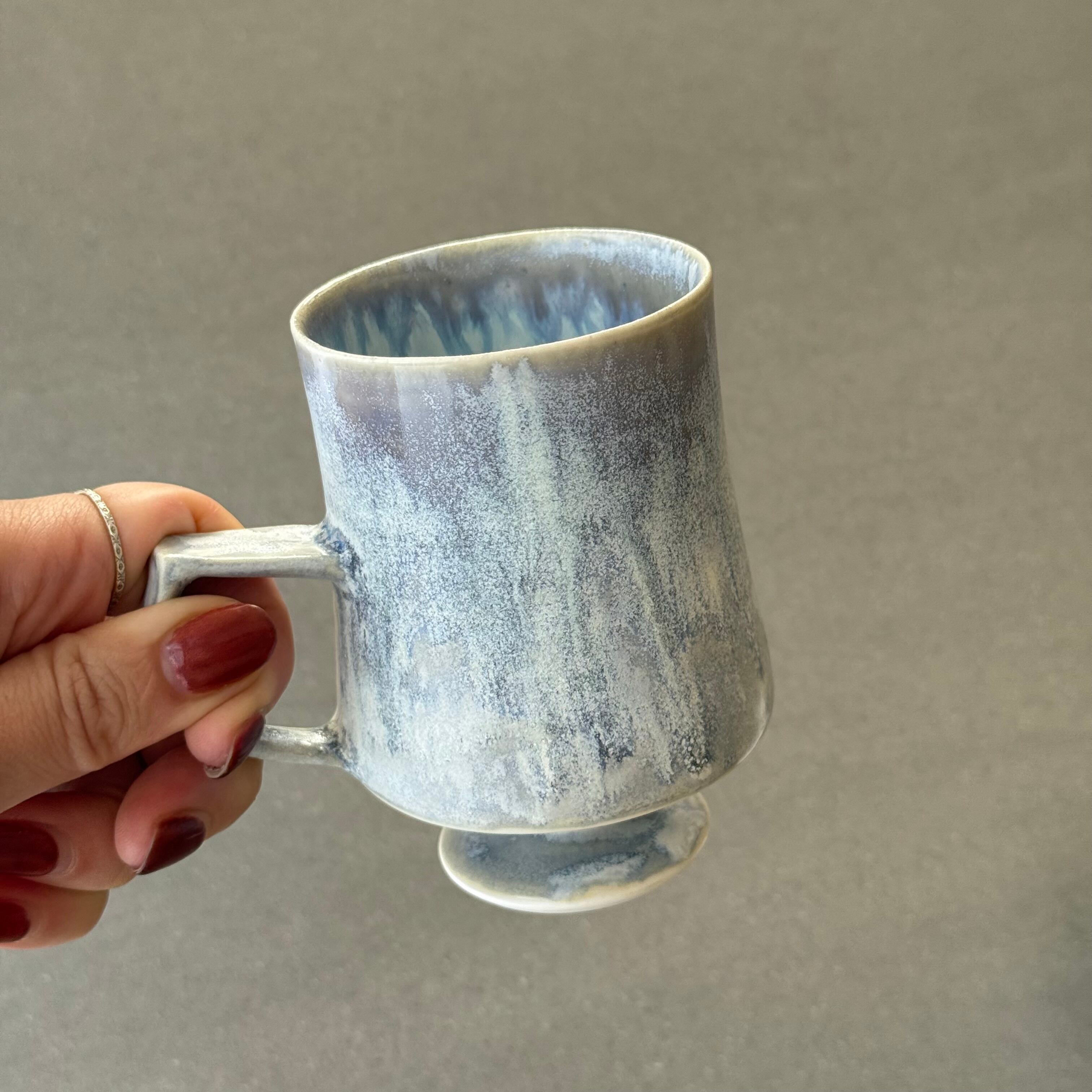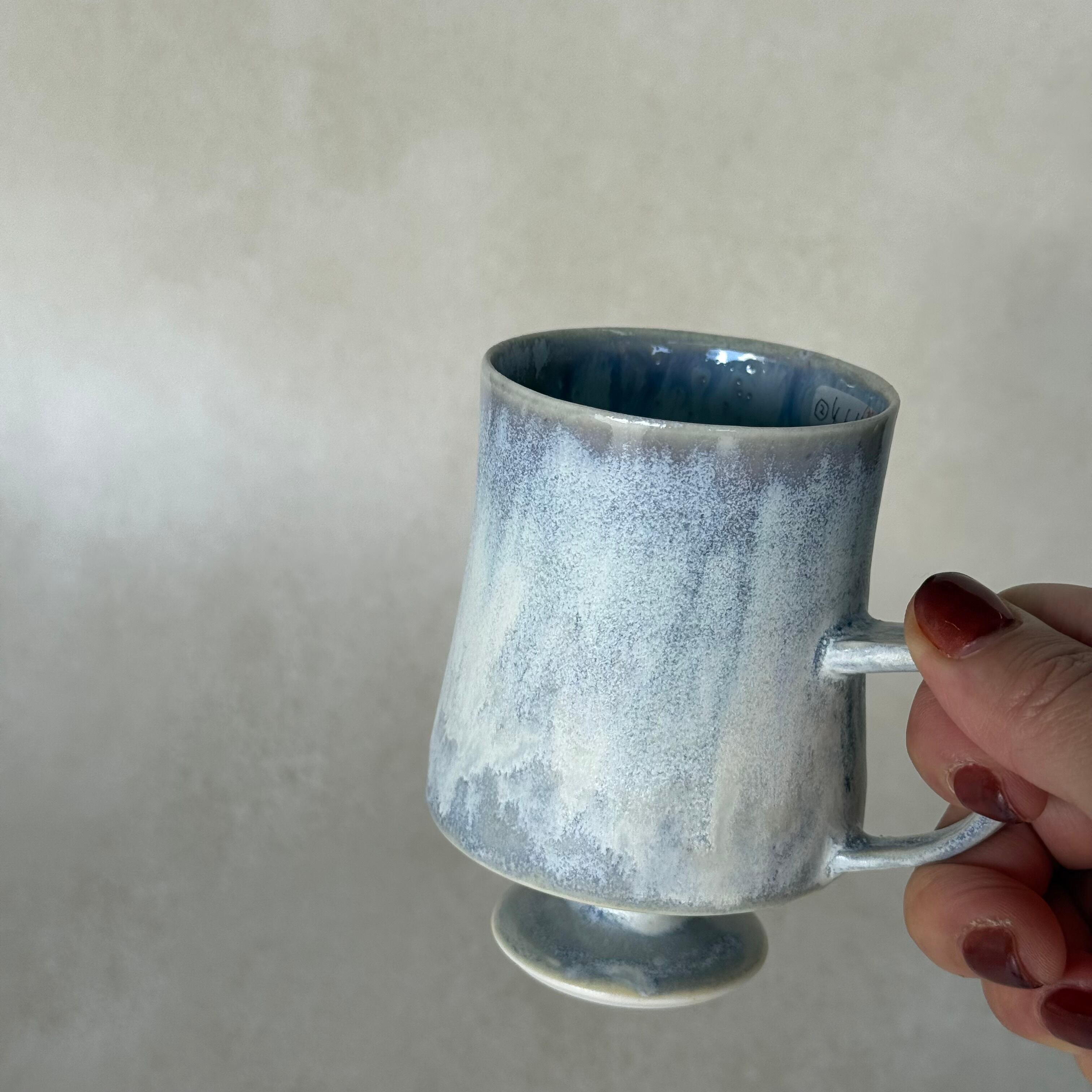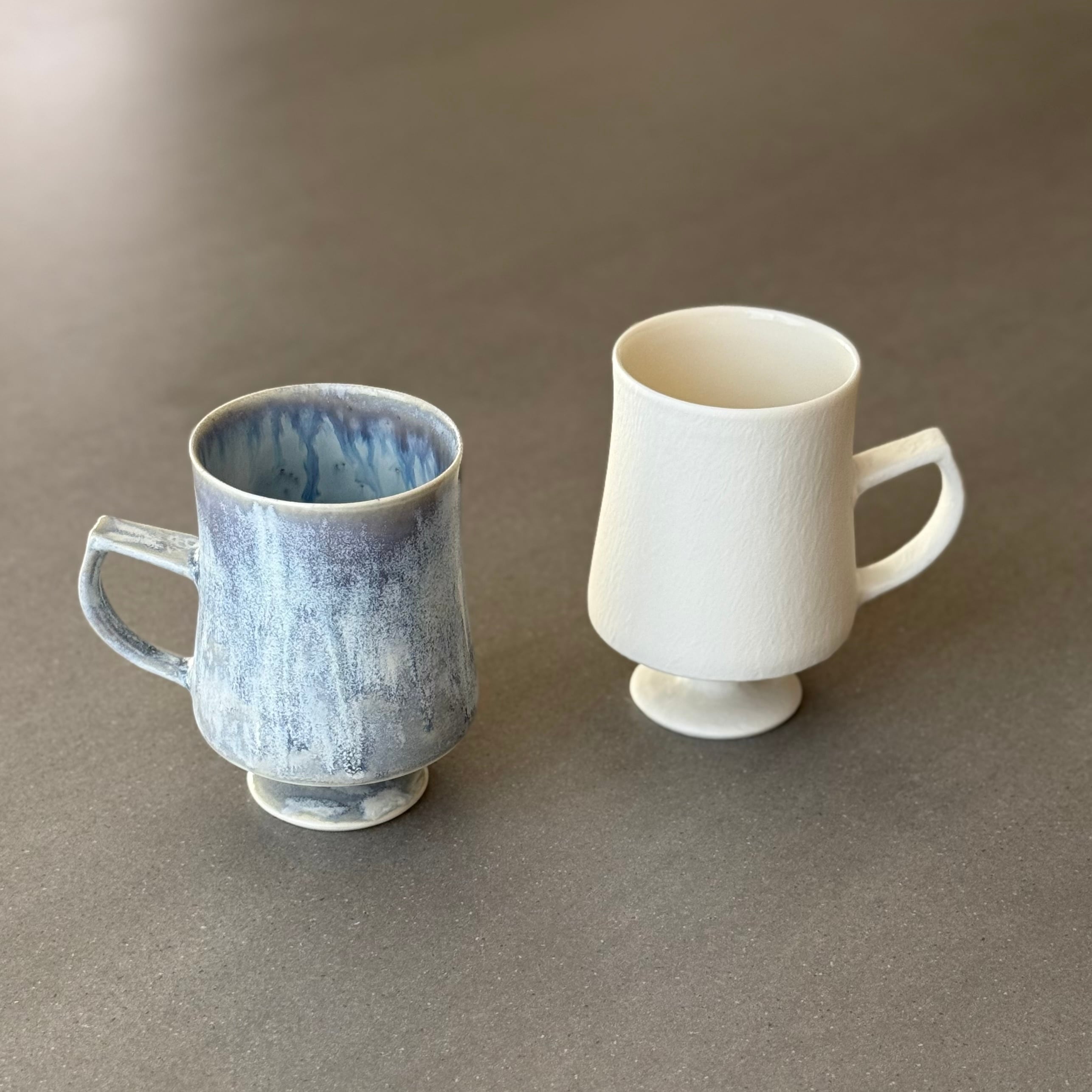 磁器でありながら、チタン釉の表情が美しい脚付のマグです。