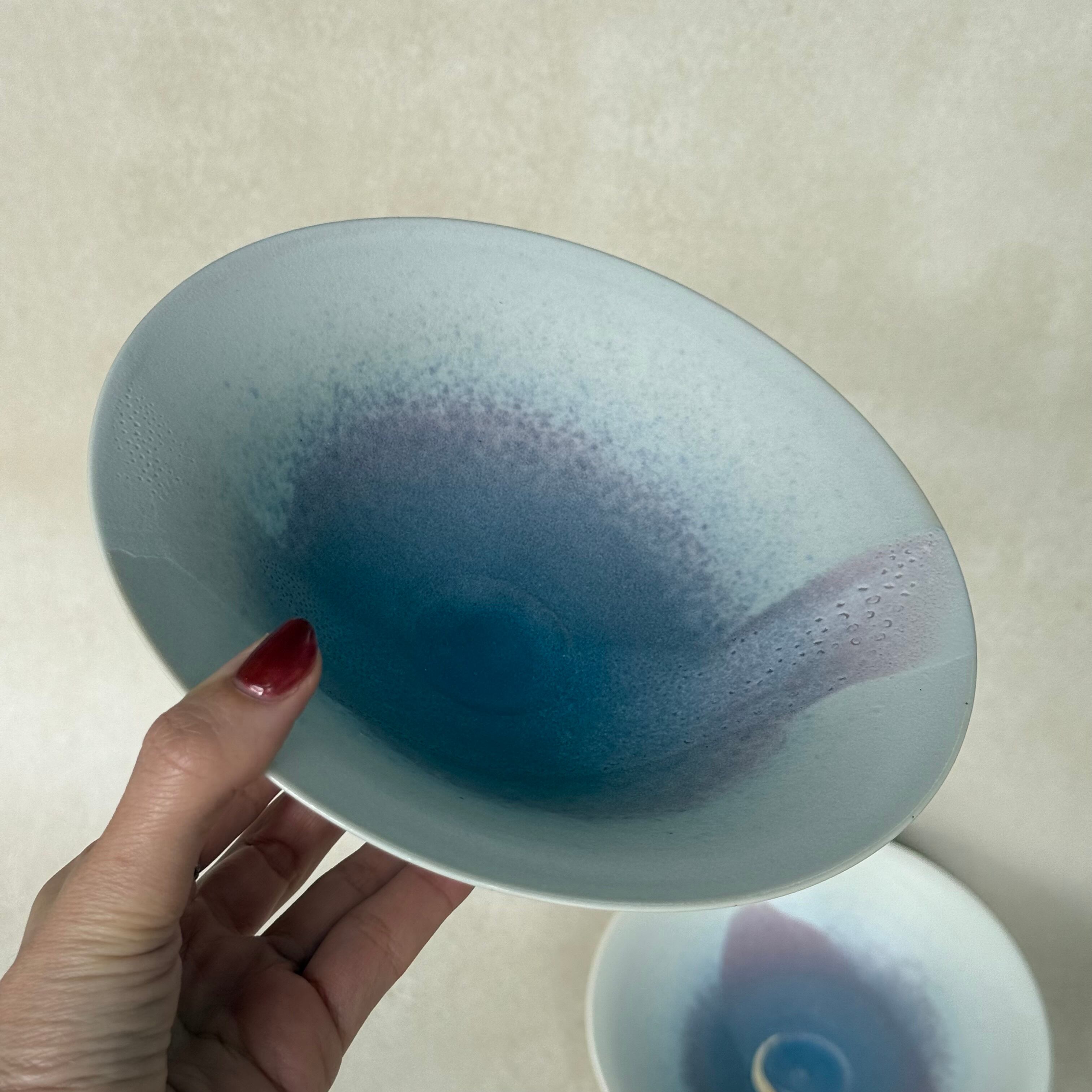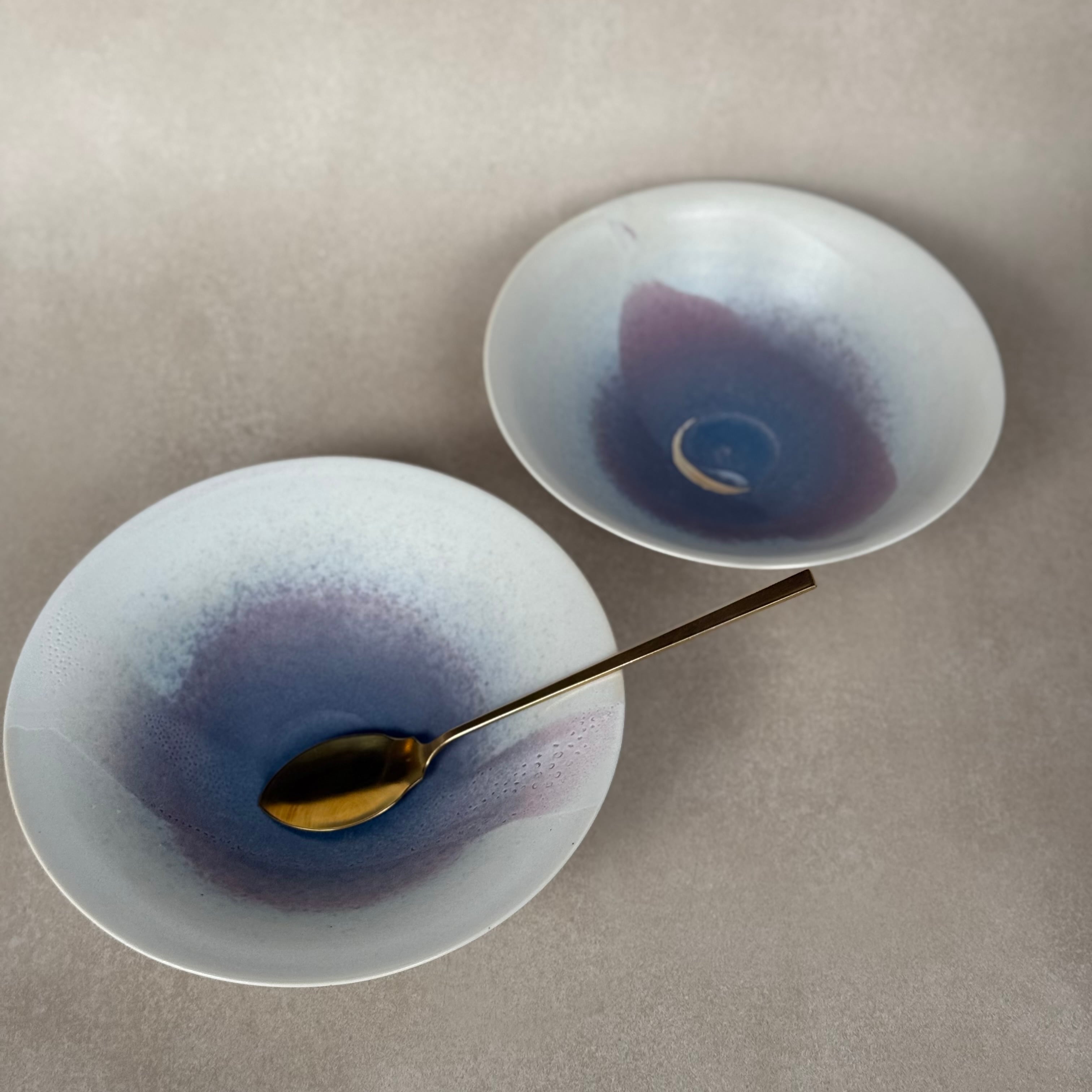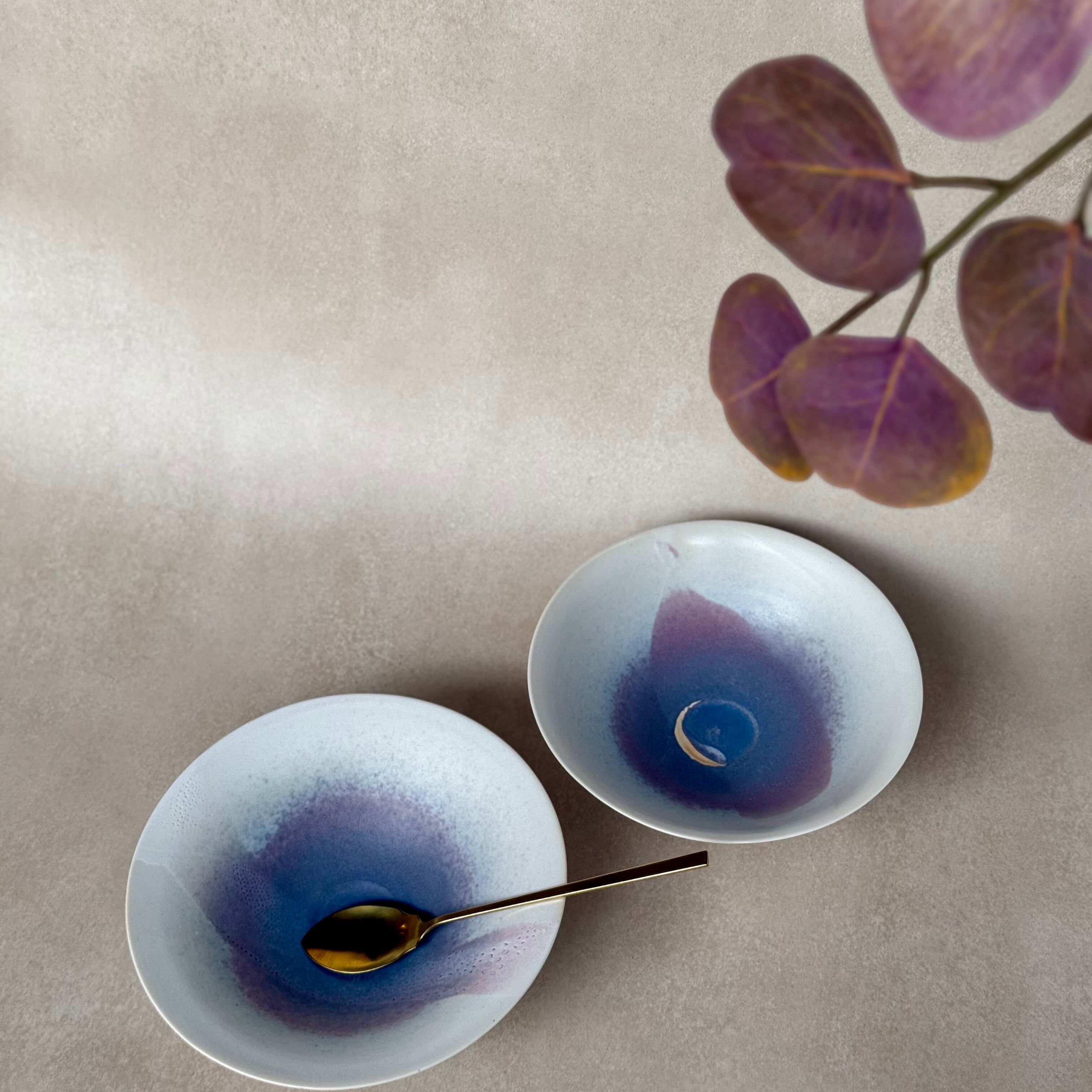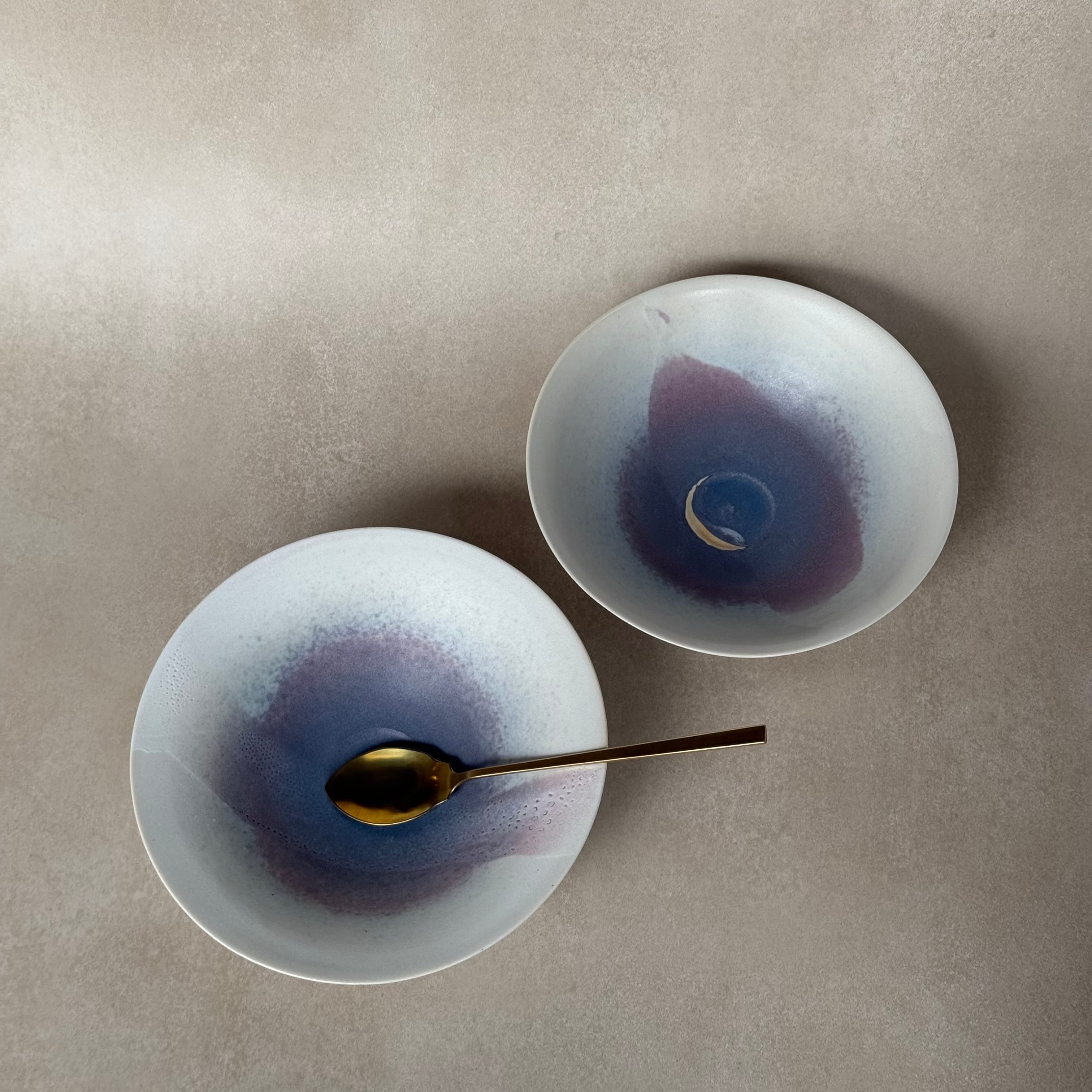 淡く滲む青と淡い紫が、春先の朝露を思わせます。