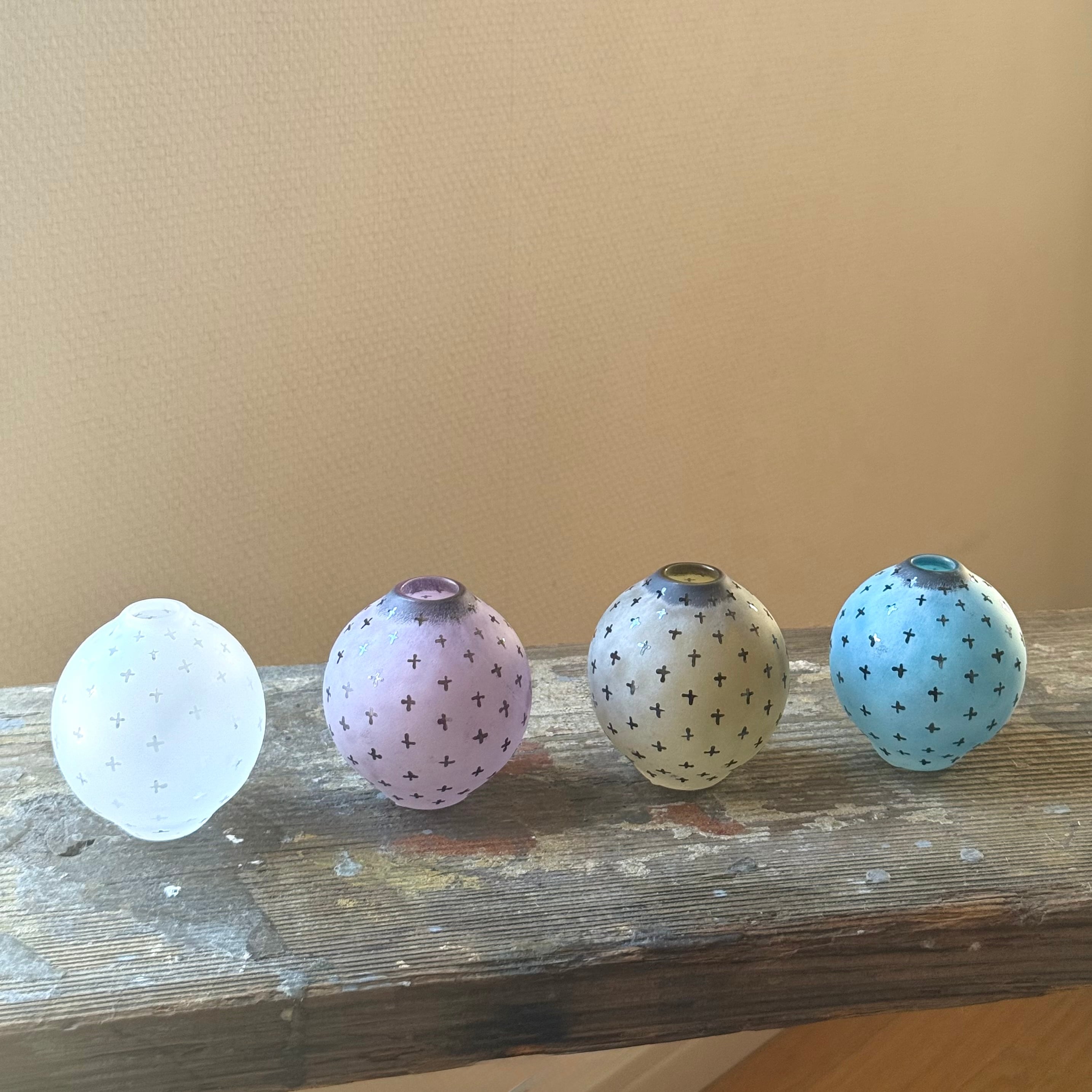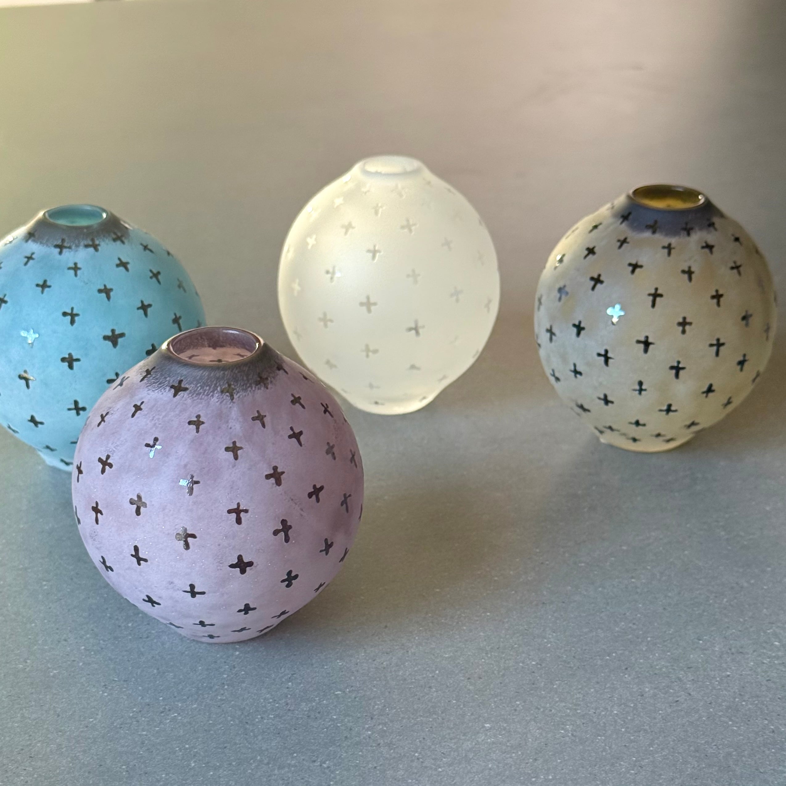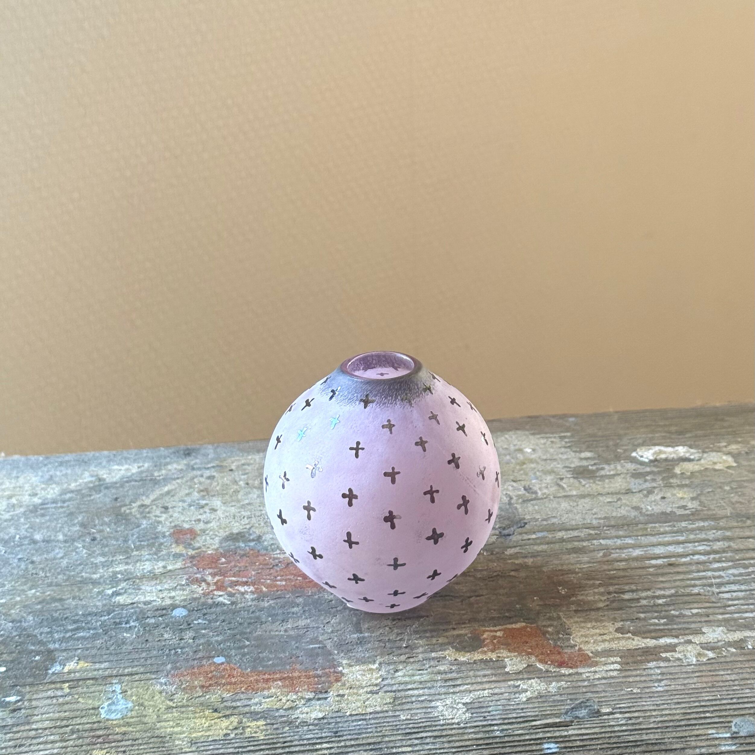 吹きガラスで形作られ、細かいサンドブラスト加工を施された一つ一つ手作業で作られた作品です。+(cross)模様がたくさん彫り込まれており、削られたすりガラスのような風合いがとても素敵です。