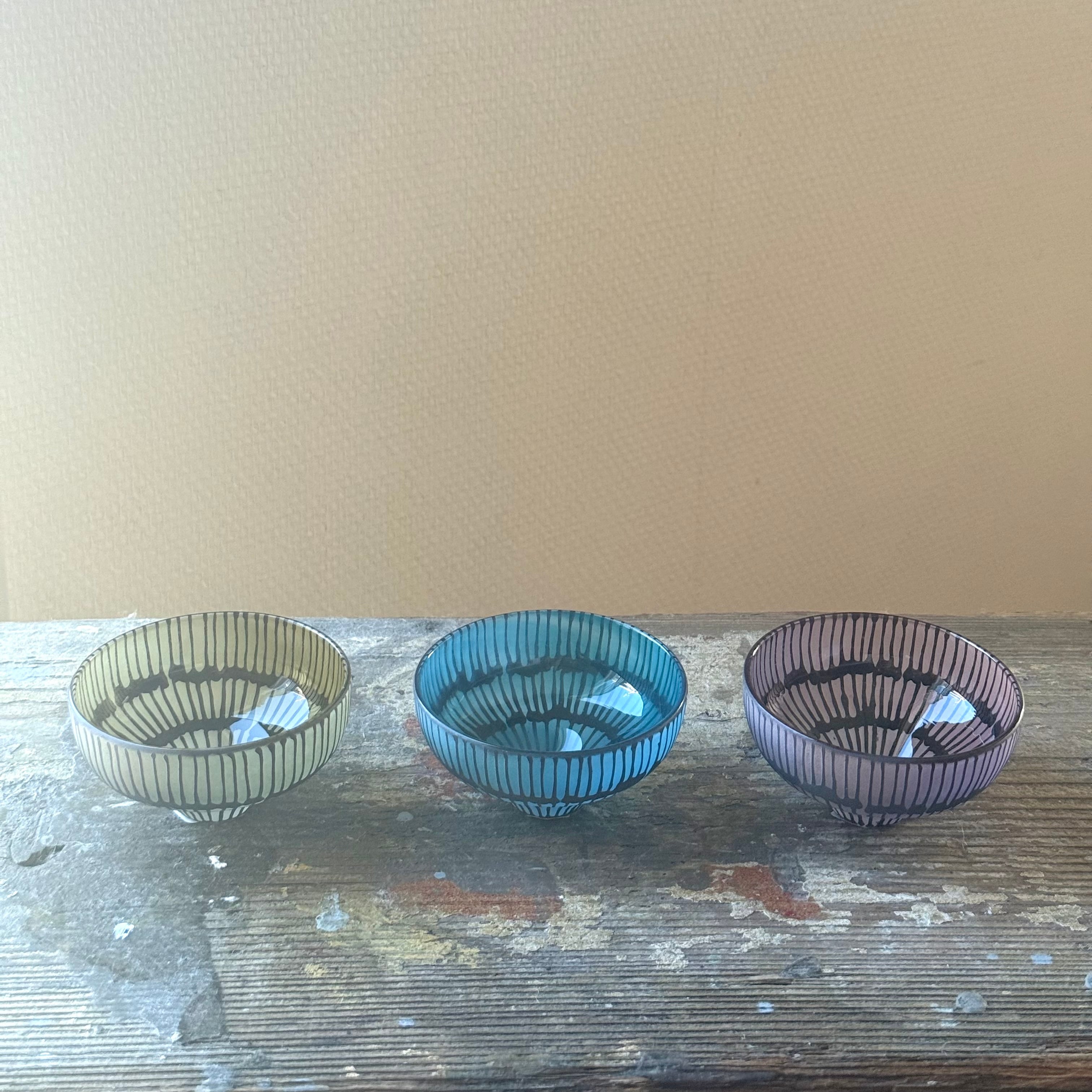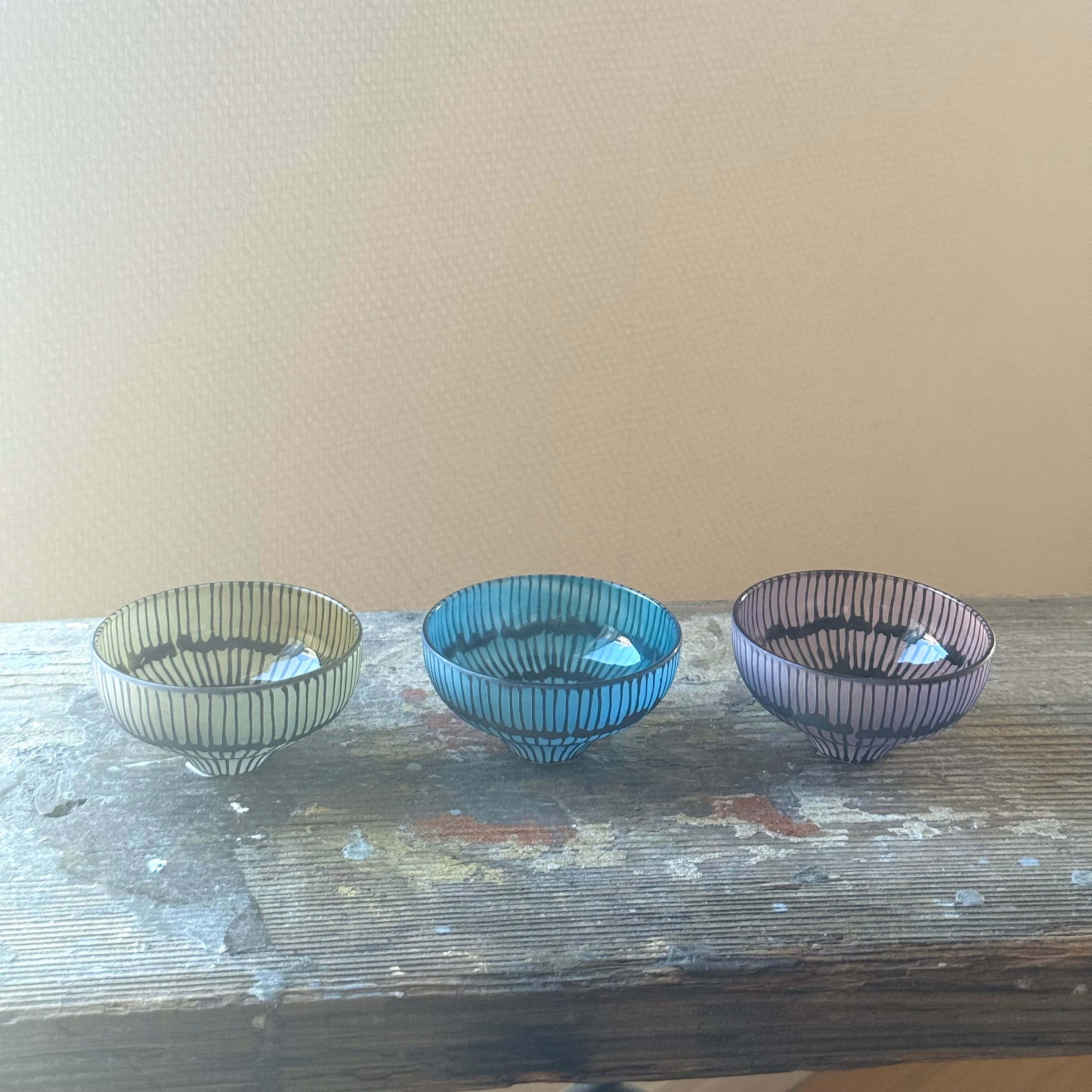 吹きガラスで形作られ、細かいサンドブラスト加工を施された一つ一つ手作業で作られた作品です。模様は彫り込まれており、削られたすりガラスのような風合いがとても素敵です。