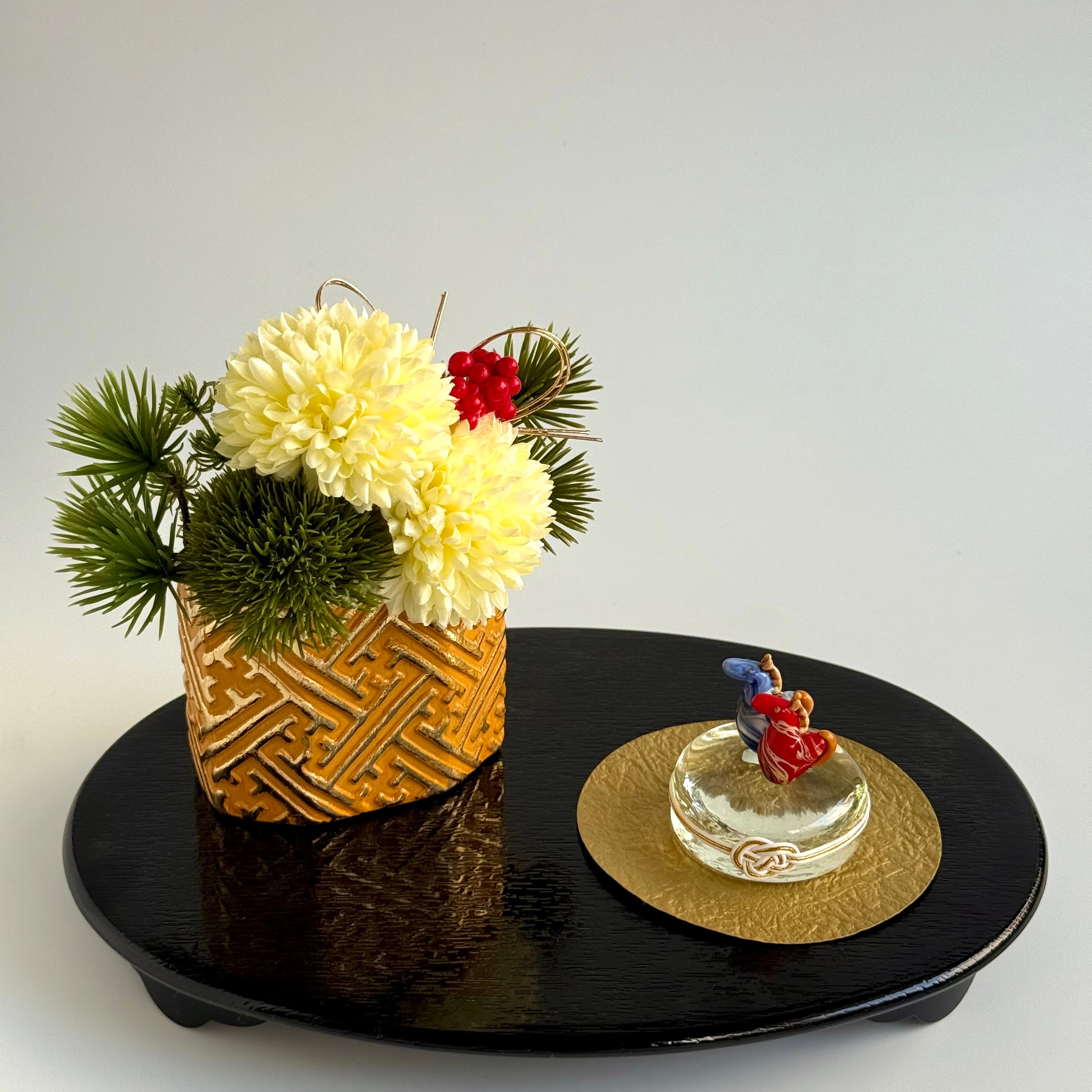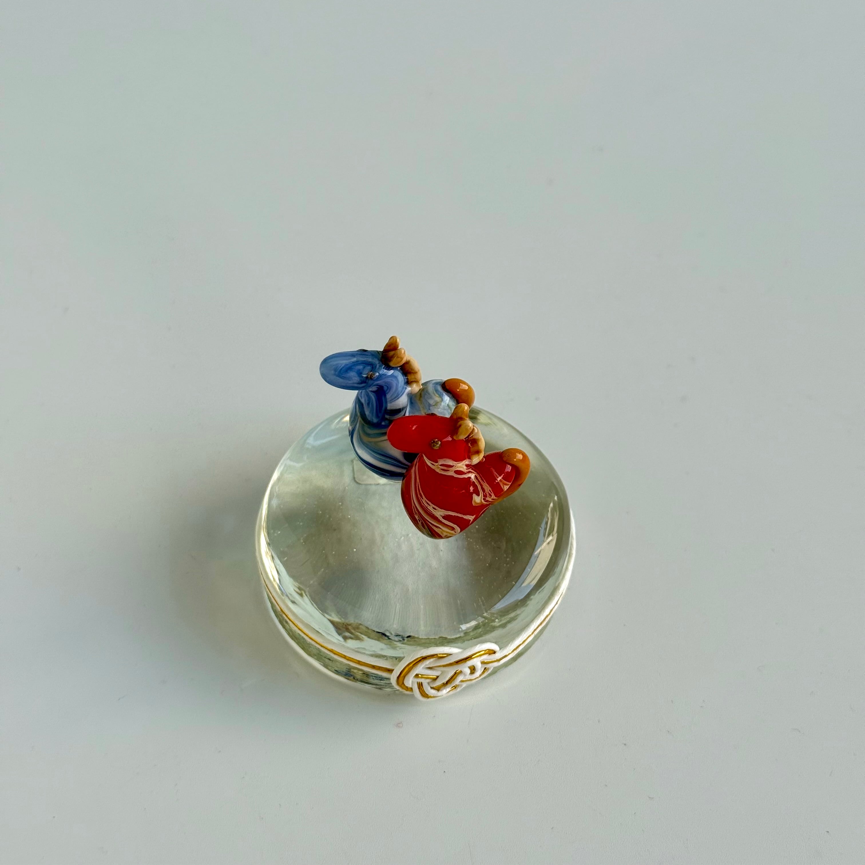透明感のあるクリアなガラスに上品な水引をあしらい、干支が可愛くこちらを向いています。