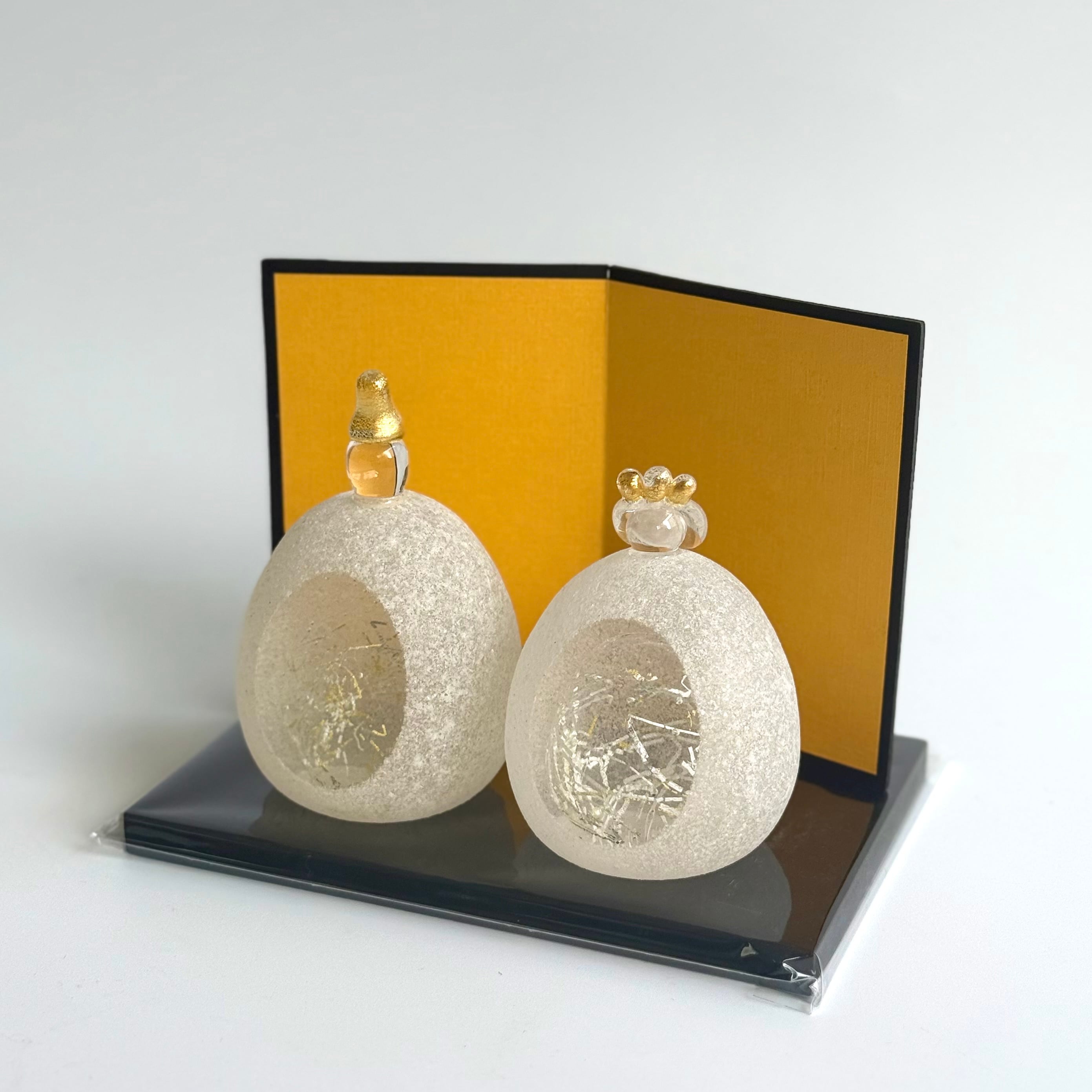 ガラスで丁寧に作られたお雛様は、コンパクトながらも華やかさを兼ね備えています。
