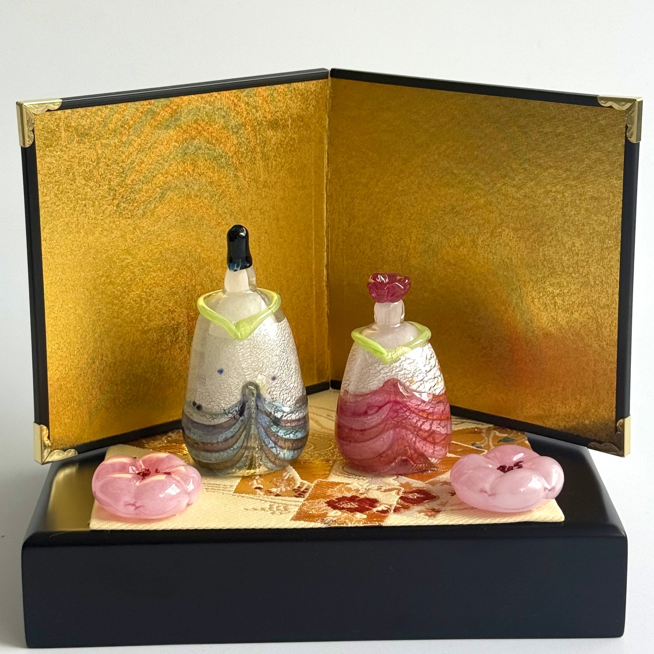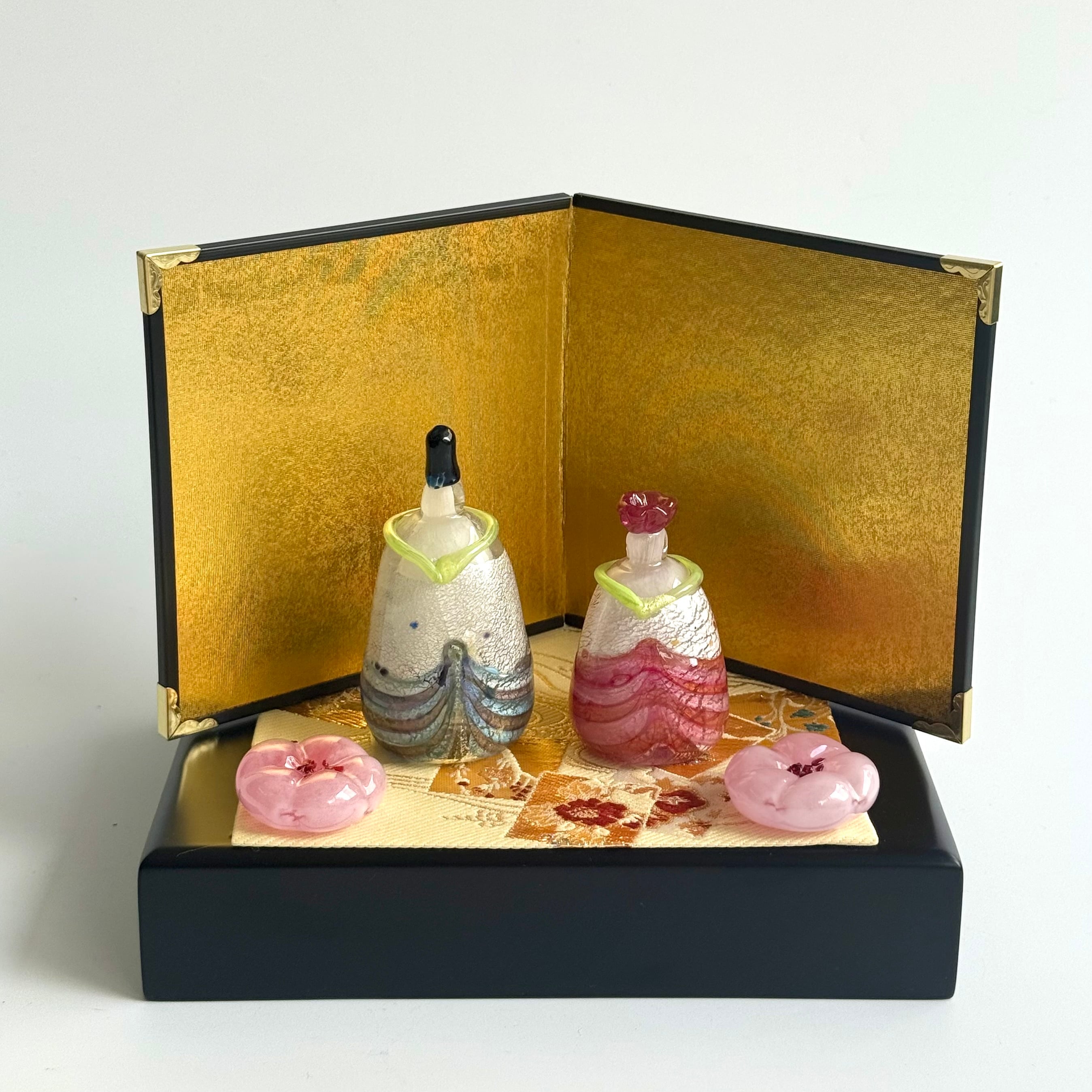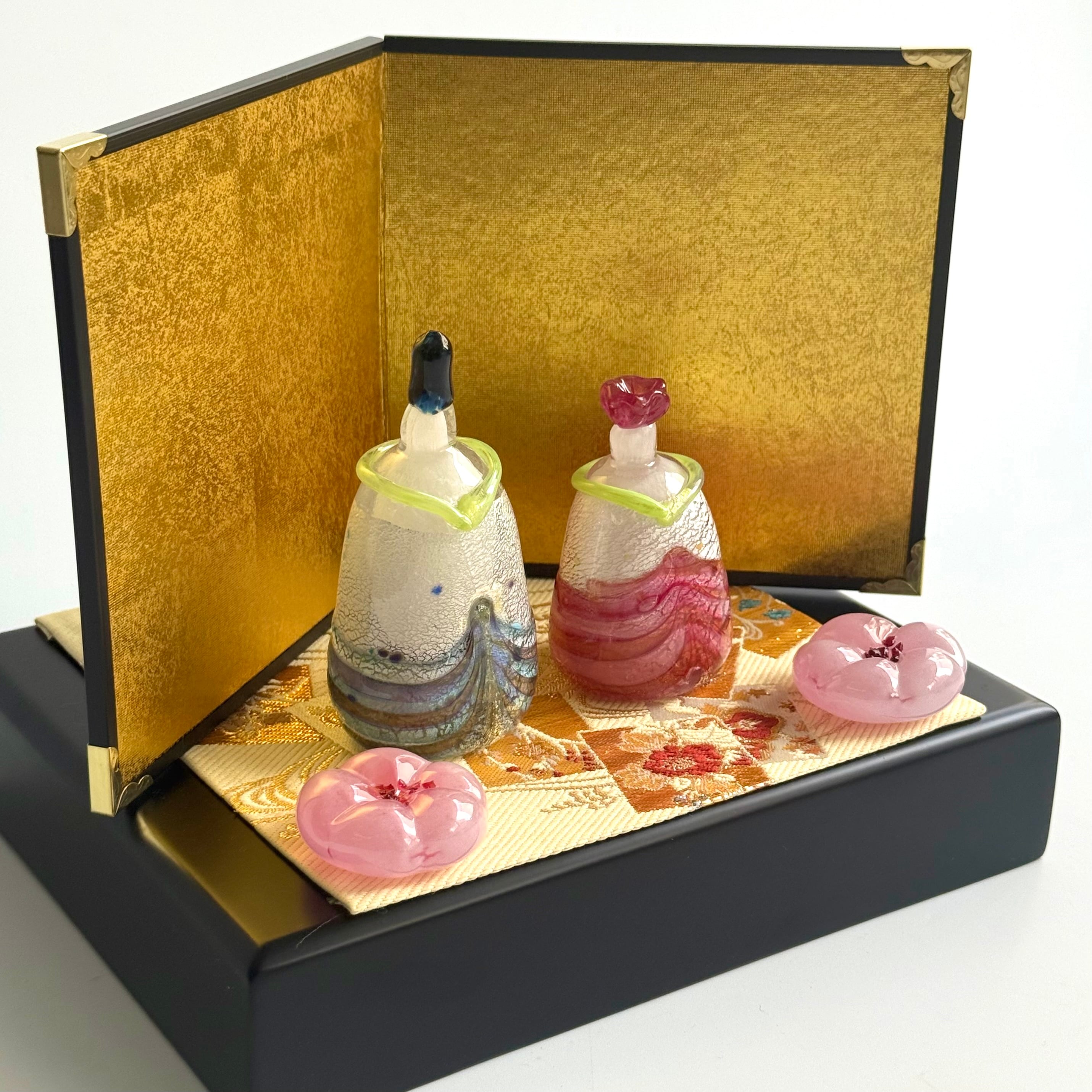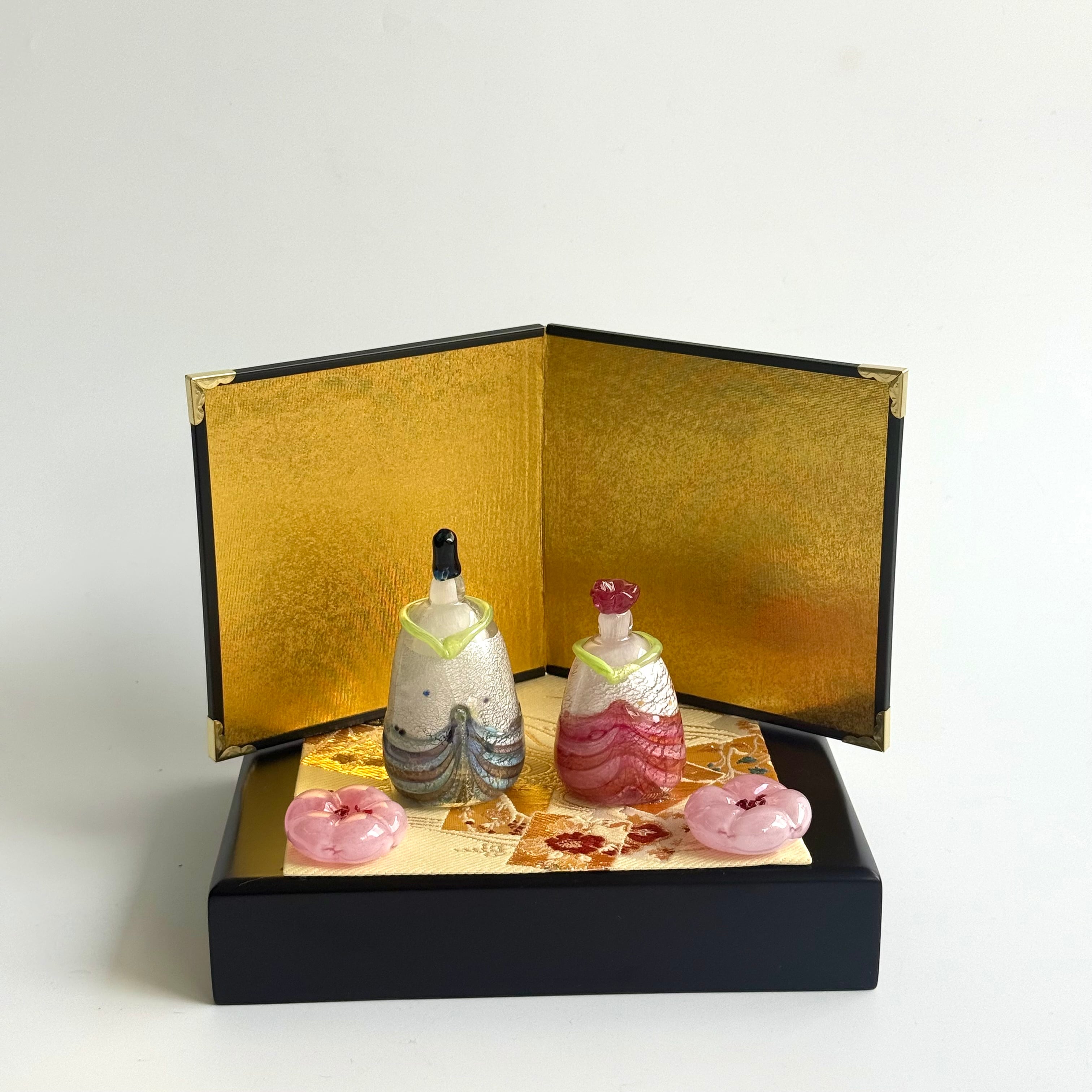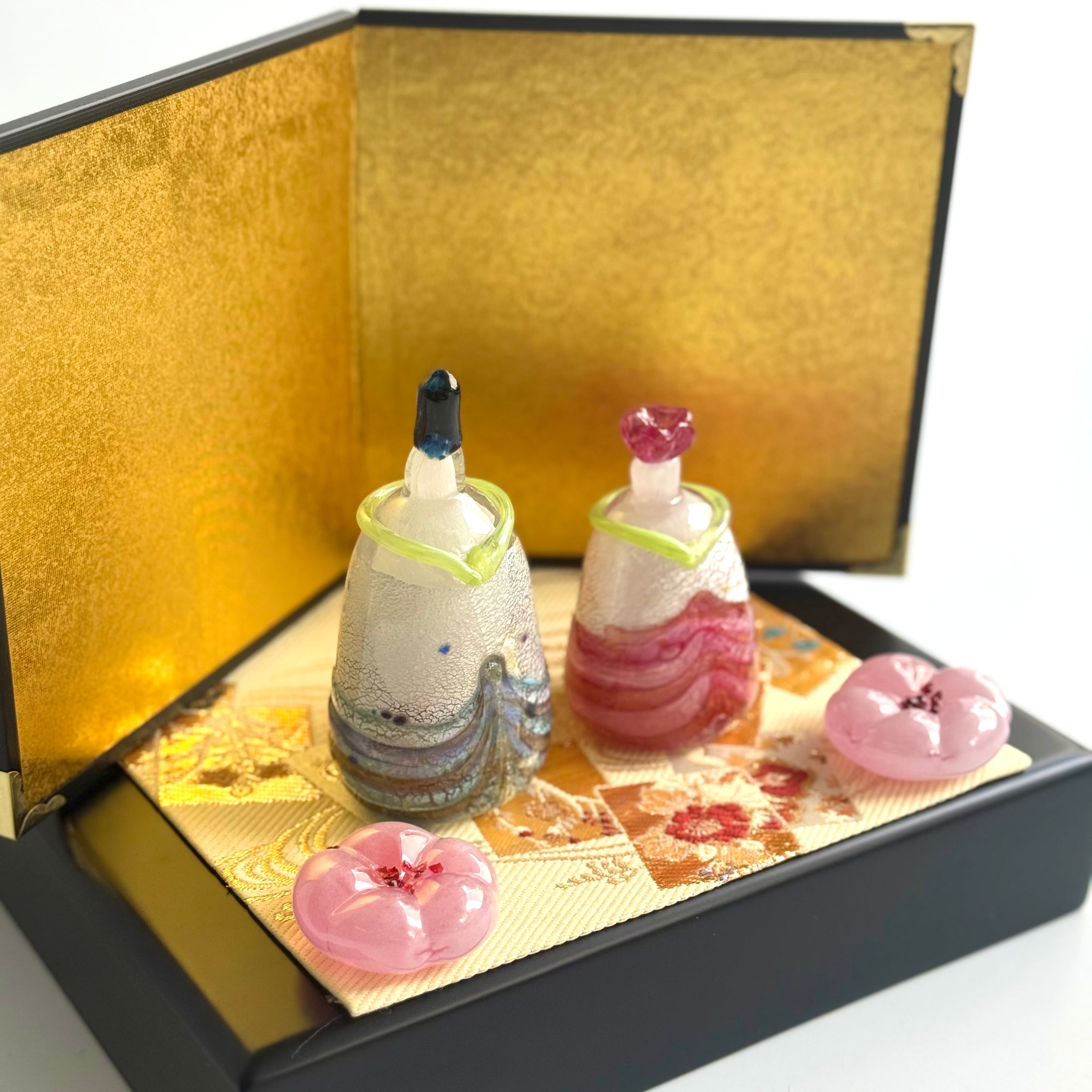 ガラスで丁寧に作られたお雛様は、コンパクトながらも華やかさを兼ね備えています。