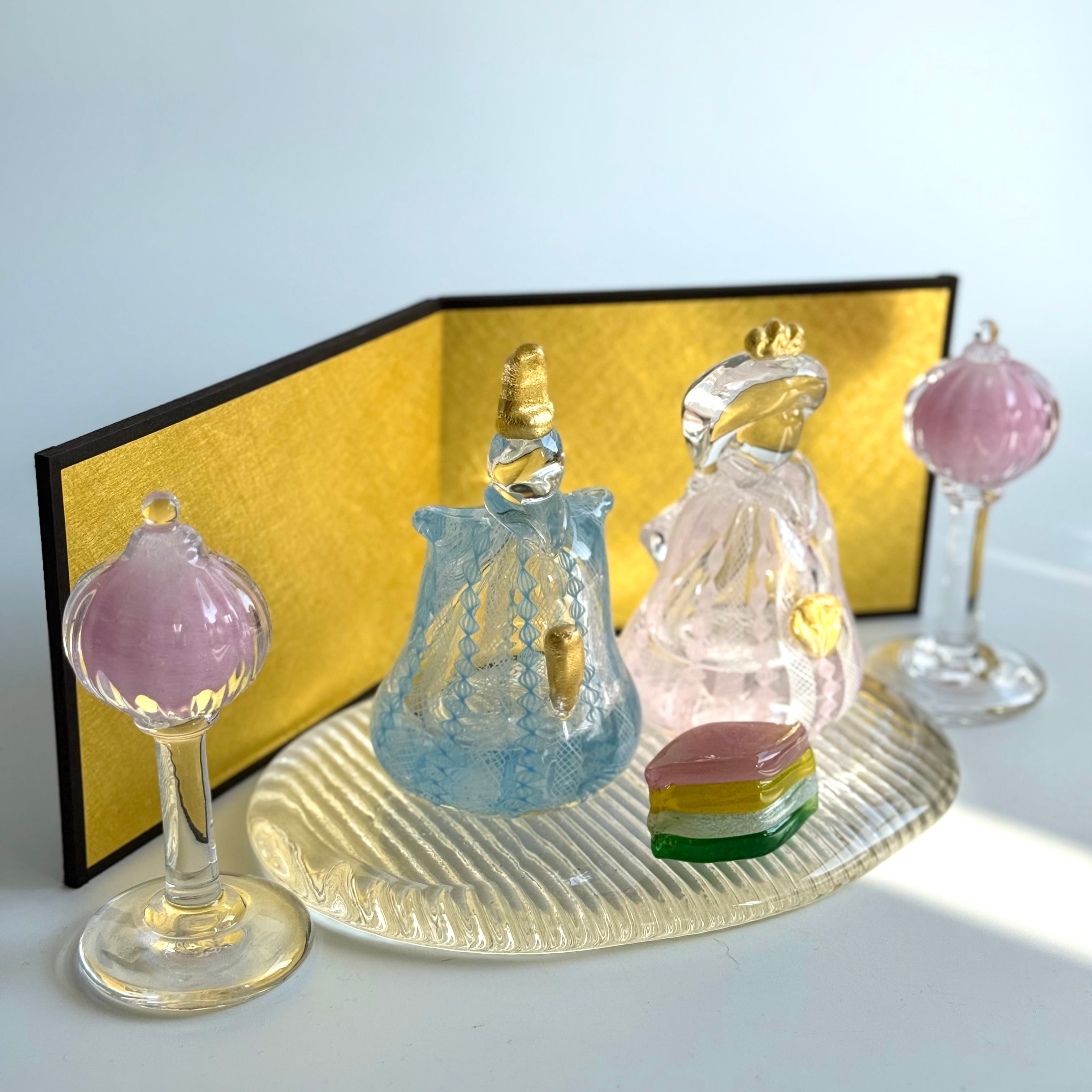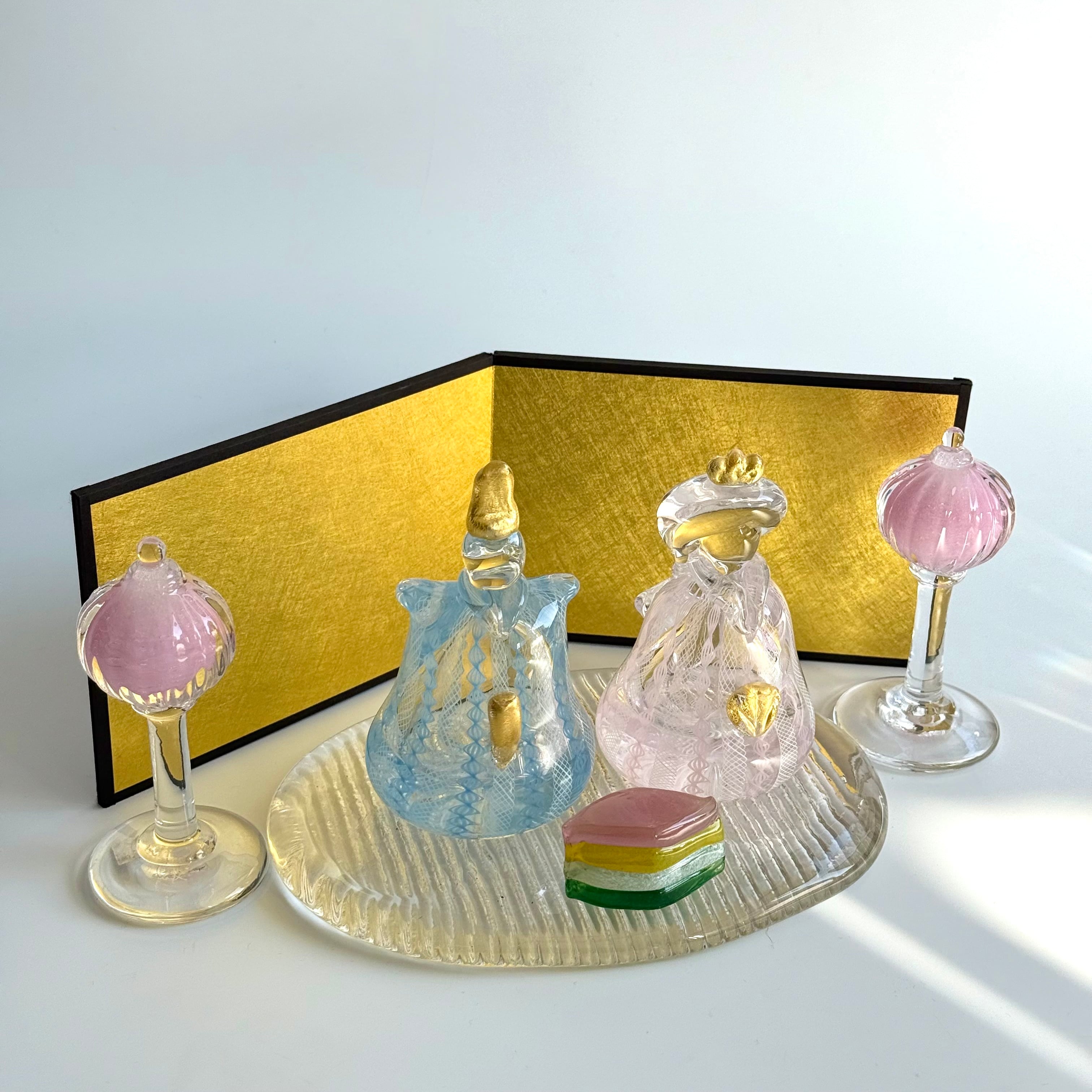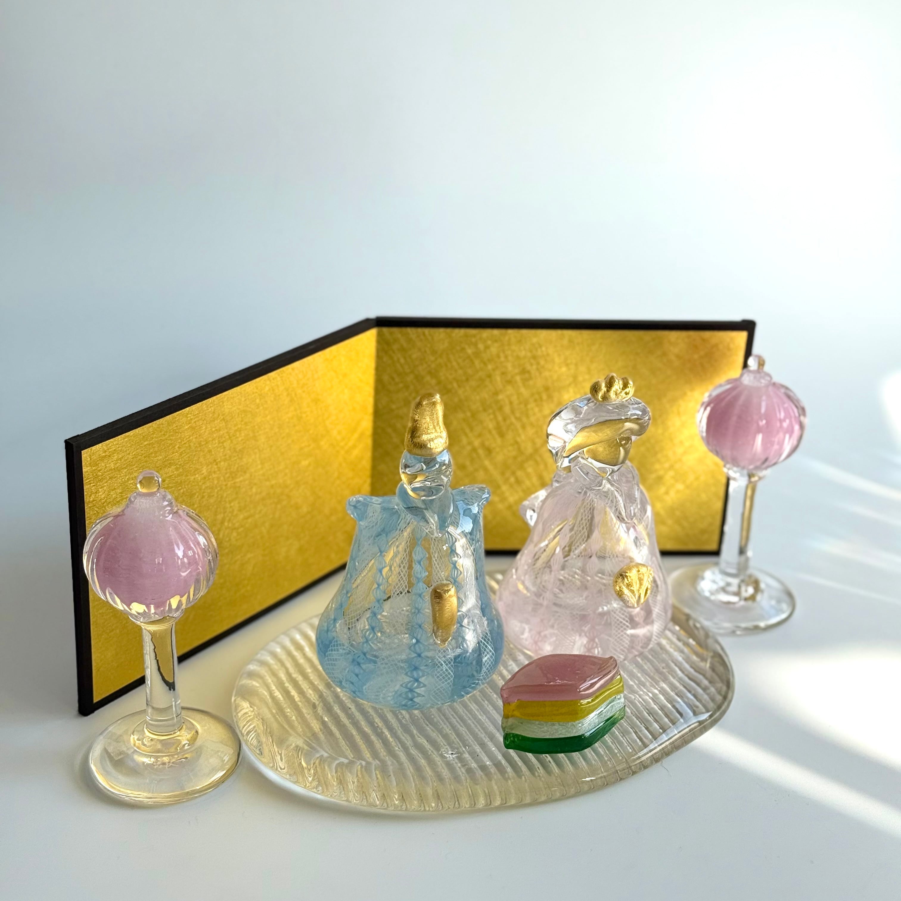 ※ガラスのおひなさまとぼんぼり、菱餅、台、屏風のセットです。