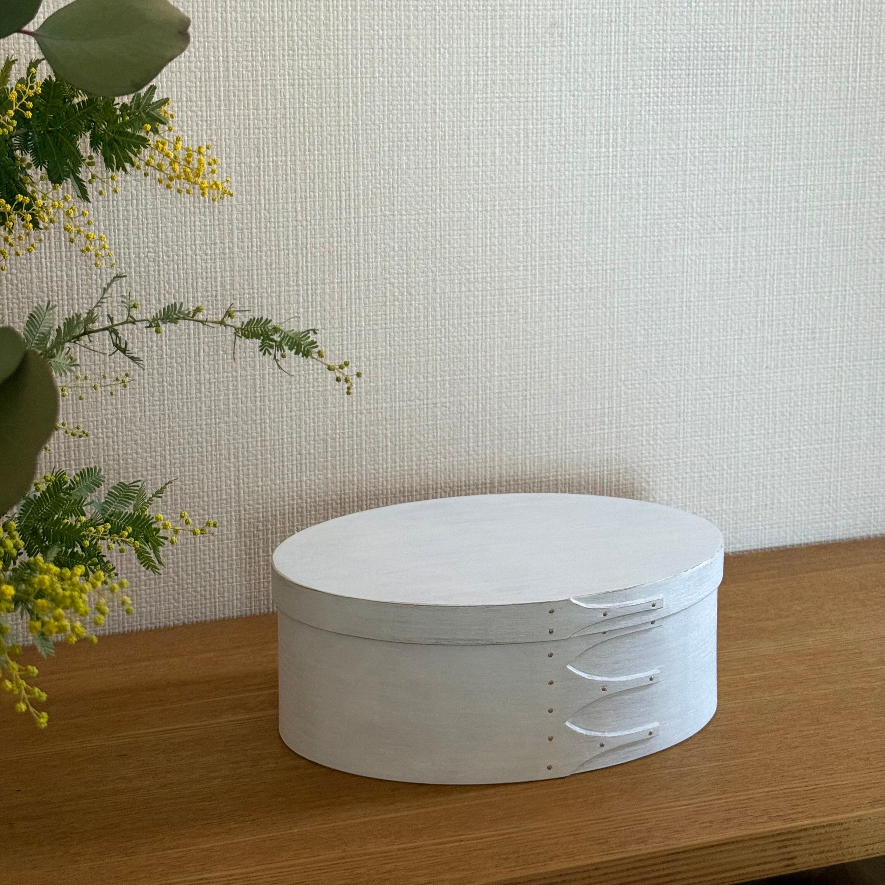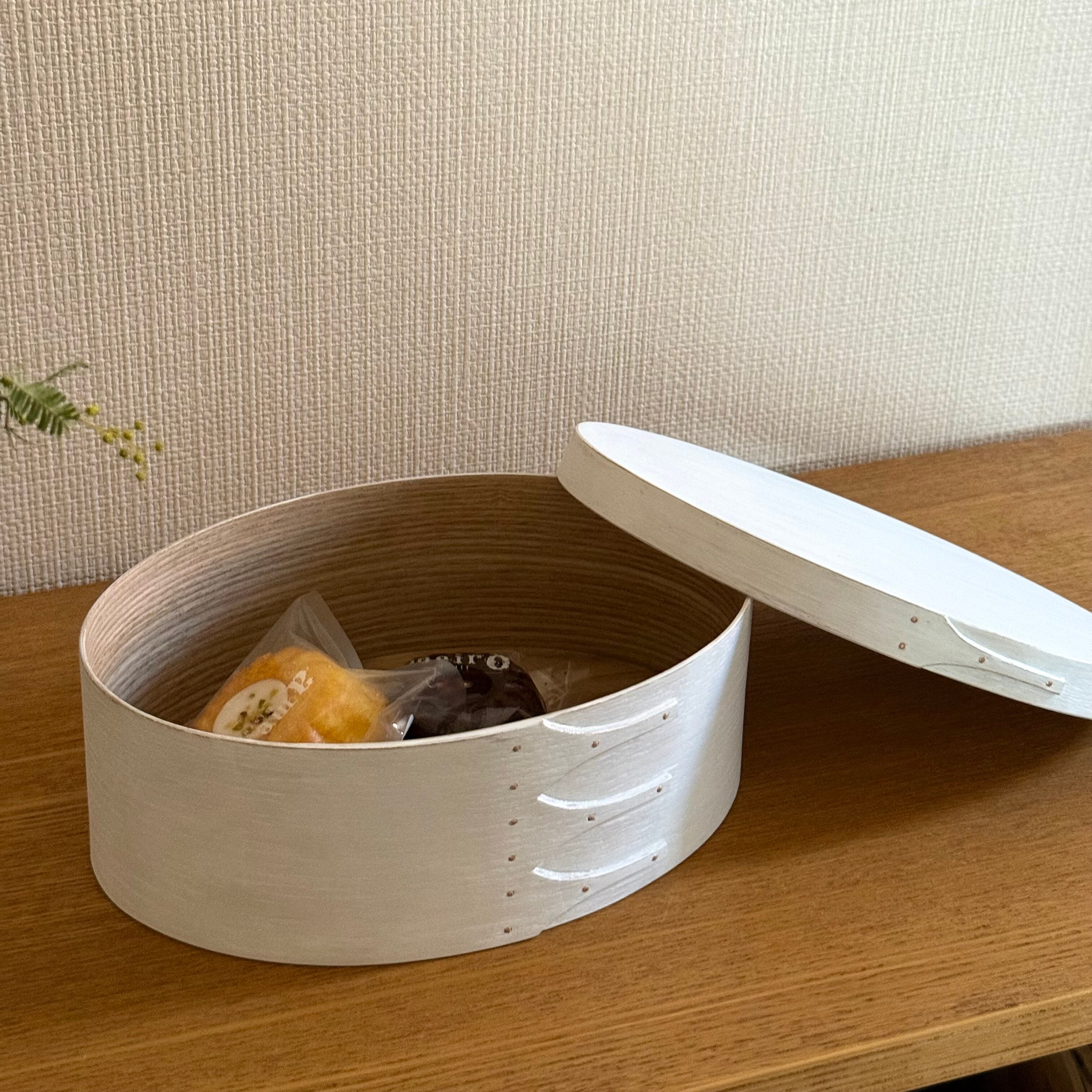 このオーバルボックスはシェーカーボックスとも呼ばれ、19世紀にキリスト教プロテスタント宗派のシェーカー教徒たちが作っていた木製のオーバル型の箱です。