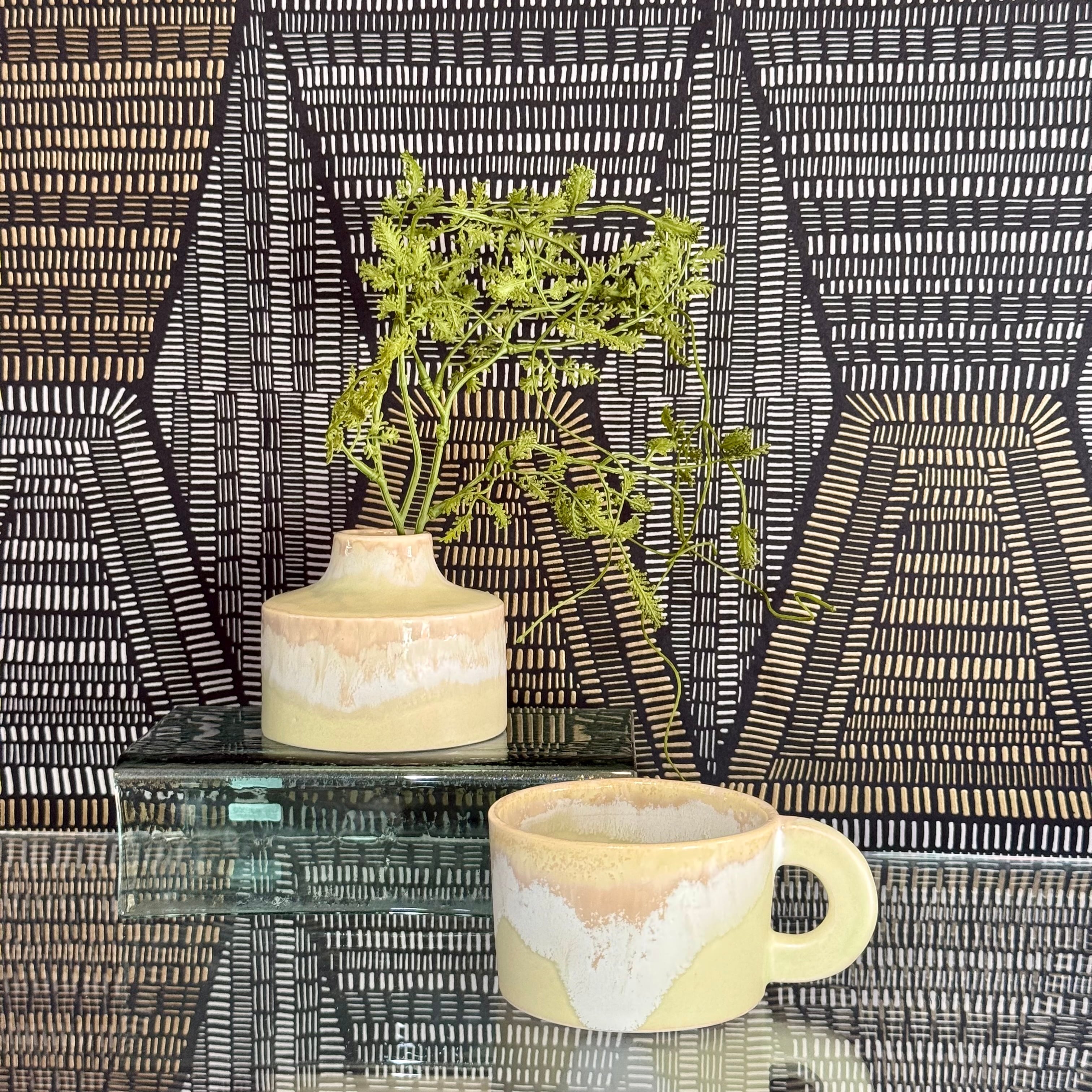雪どけカラーのMelt部分は垂れが織りなす自然現象により2色の層が出現し、窯の中で作られる表情の醍醐味を凝縮した一品となっております。