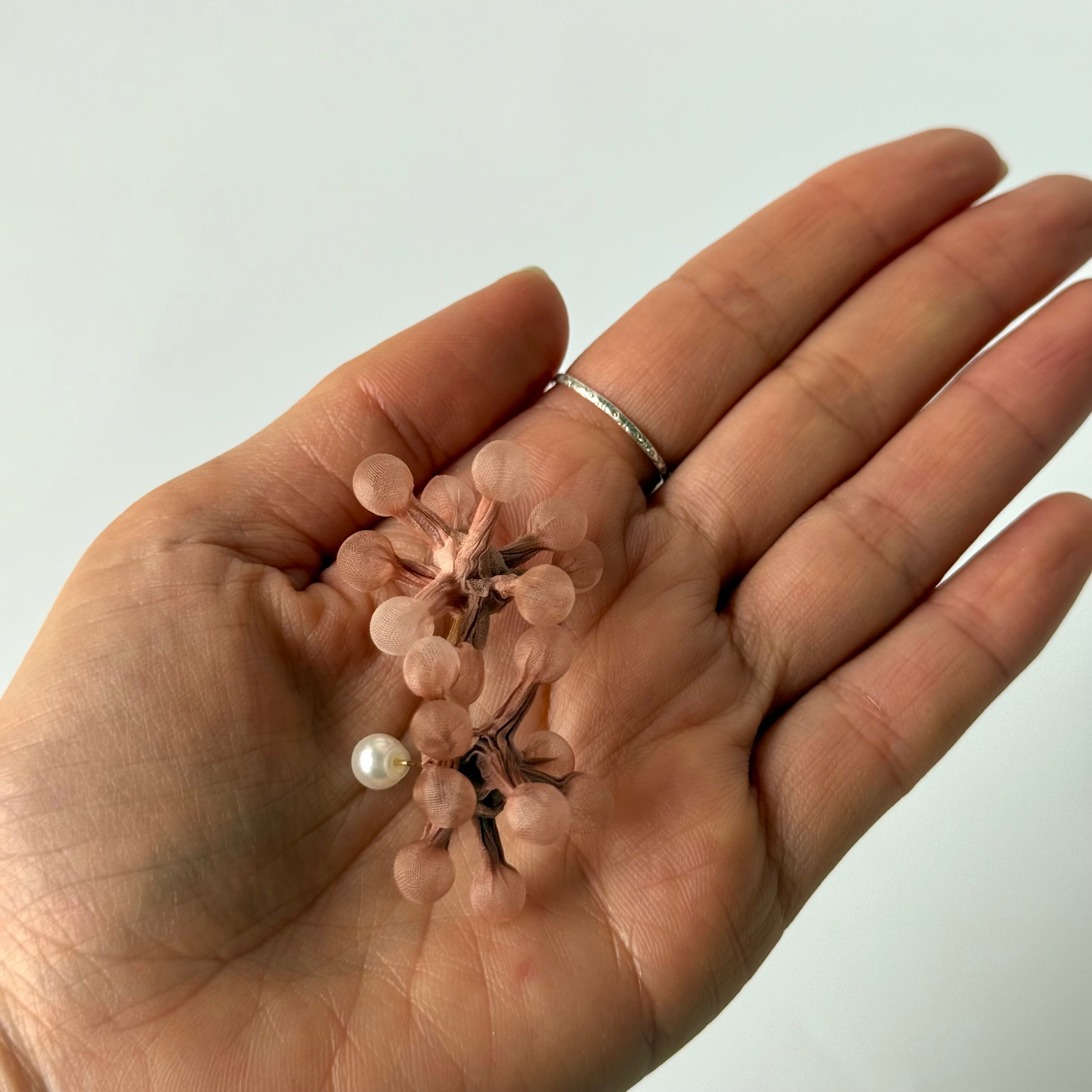 ふわっと丸いかたちが雪の結晶のように広がり、重なった色合いと軽やかな質感が耳元でやさしく映えます。シンプルな装いにも程よい存在感を添えてくれるので、季節を問わず色々なシーンで楽しんでいただけます。