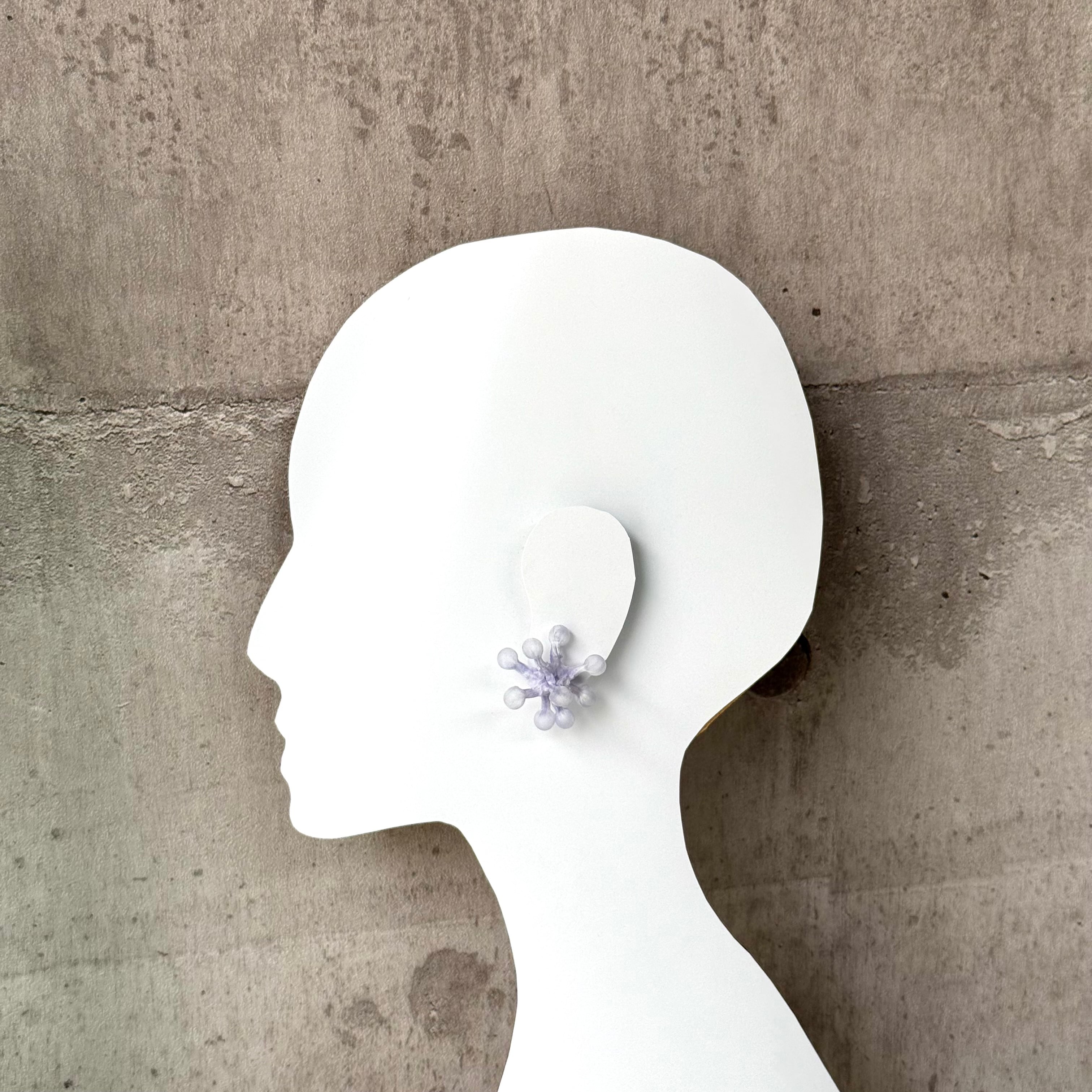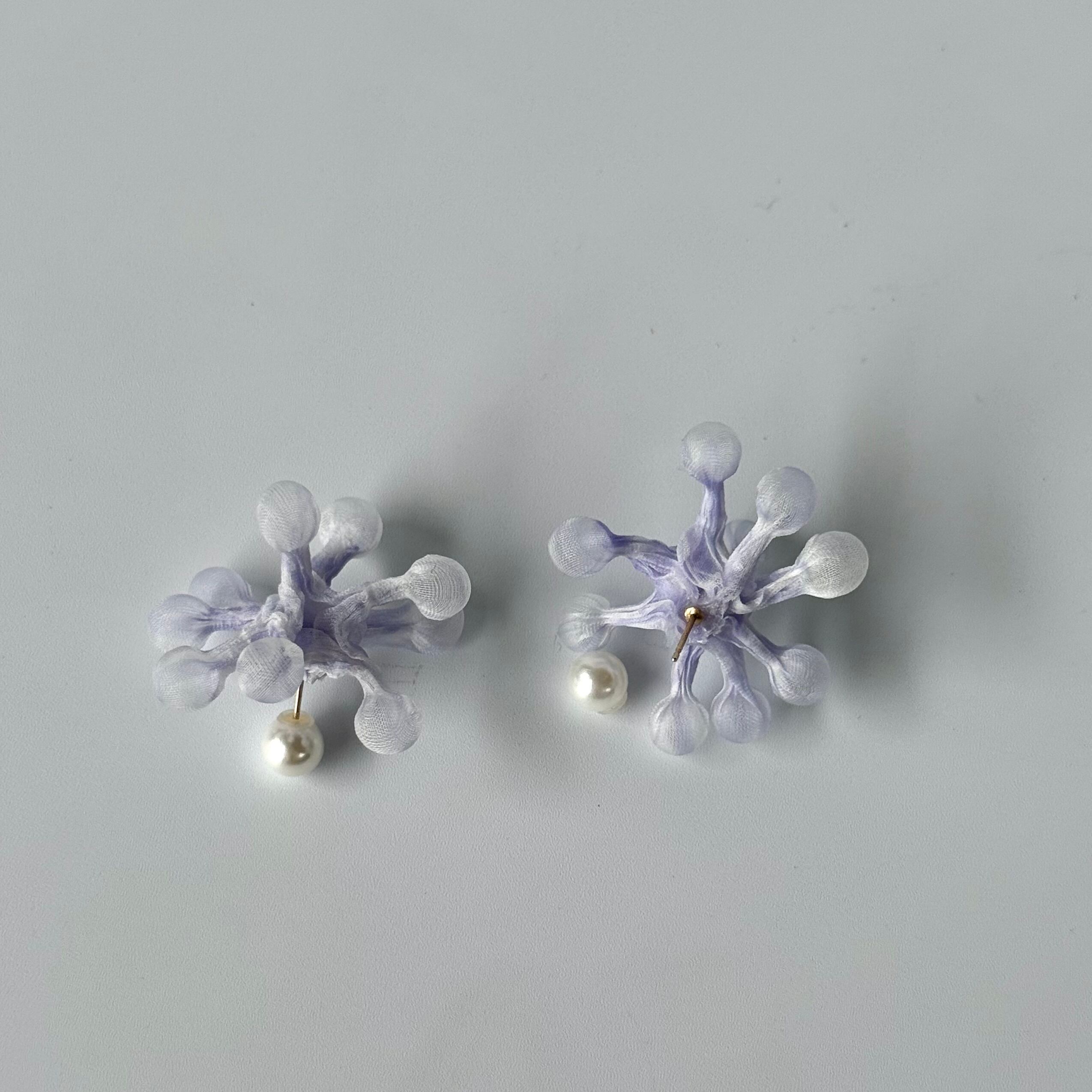 ふわっと丸いかたちが雪の結晶のように広がり、重なった色合いと軽やかな質感が耳元でやさしく映えます。シンプルな装いにも程よい存在感を添えてくれるので、季節を問わず色々なシーンで楽しんでいただけます。