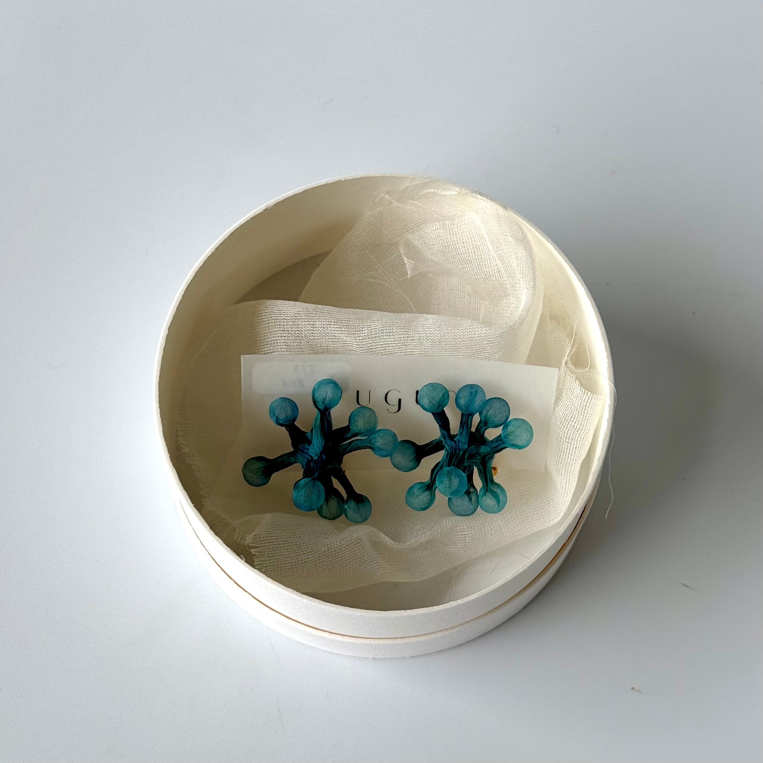 ふわっと丸いかたちが雪の結晶のように広がり、重なった色合いと軽やかな質感が耳元でやさしく映えます。シンプルな装いにも程よい存在感を添えてくれるので、季節を問わず色々なシーンで楽しんでいただけます。