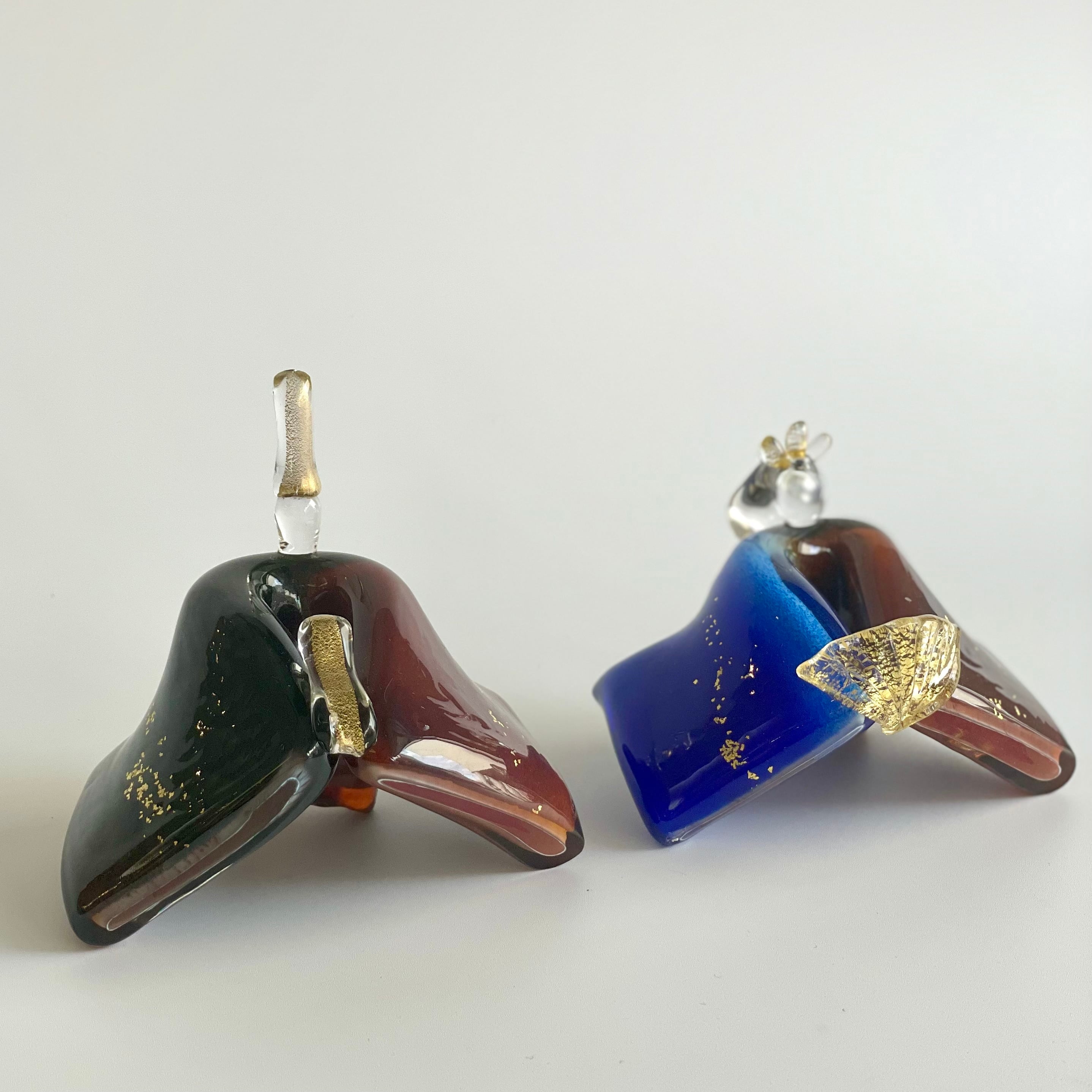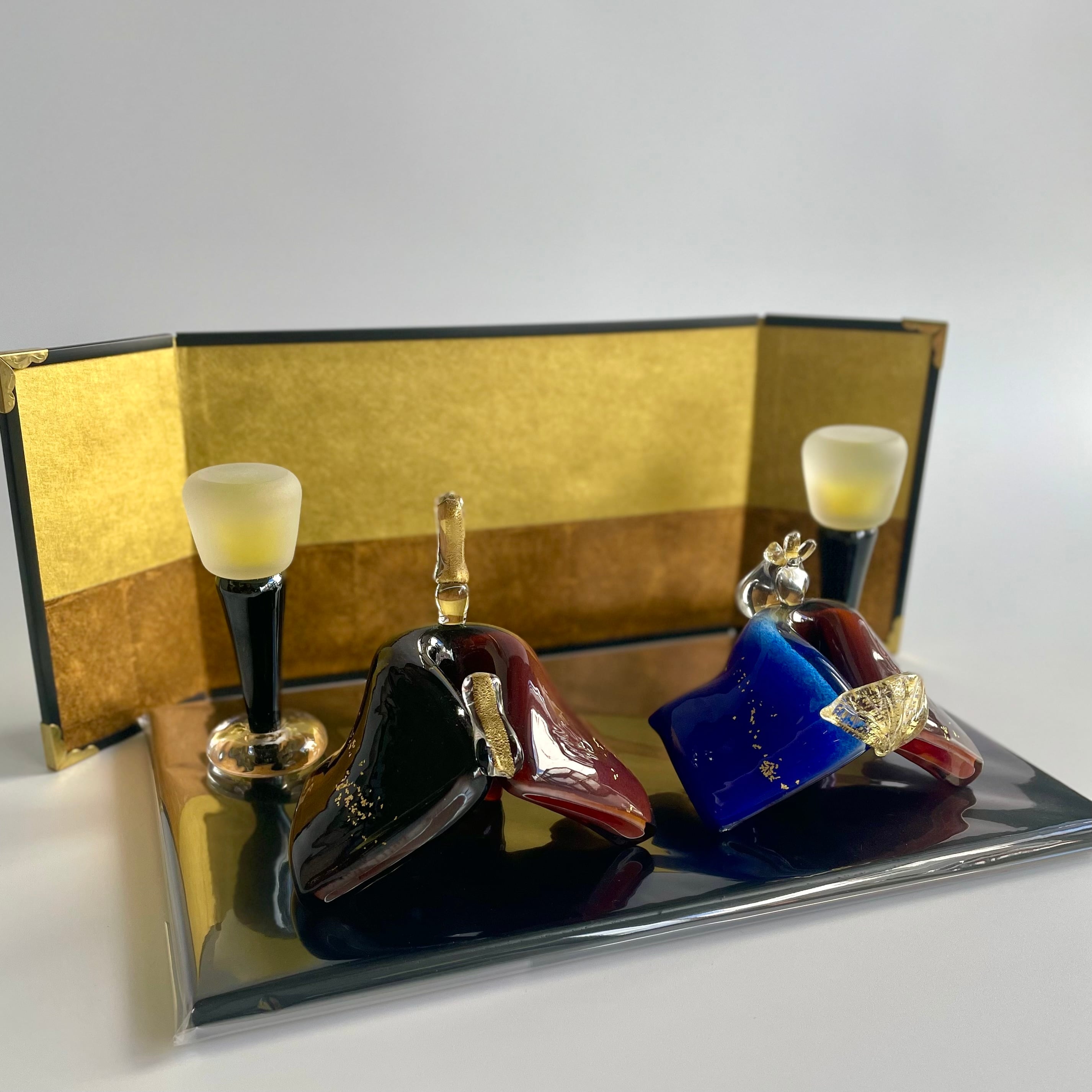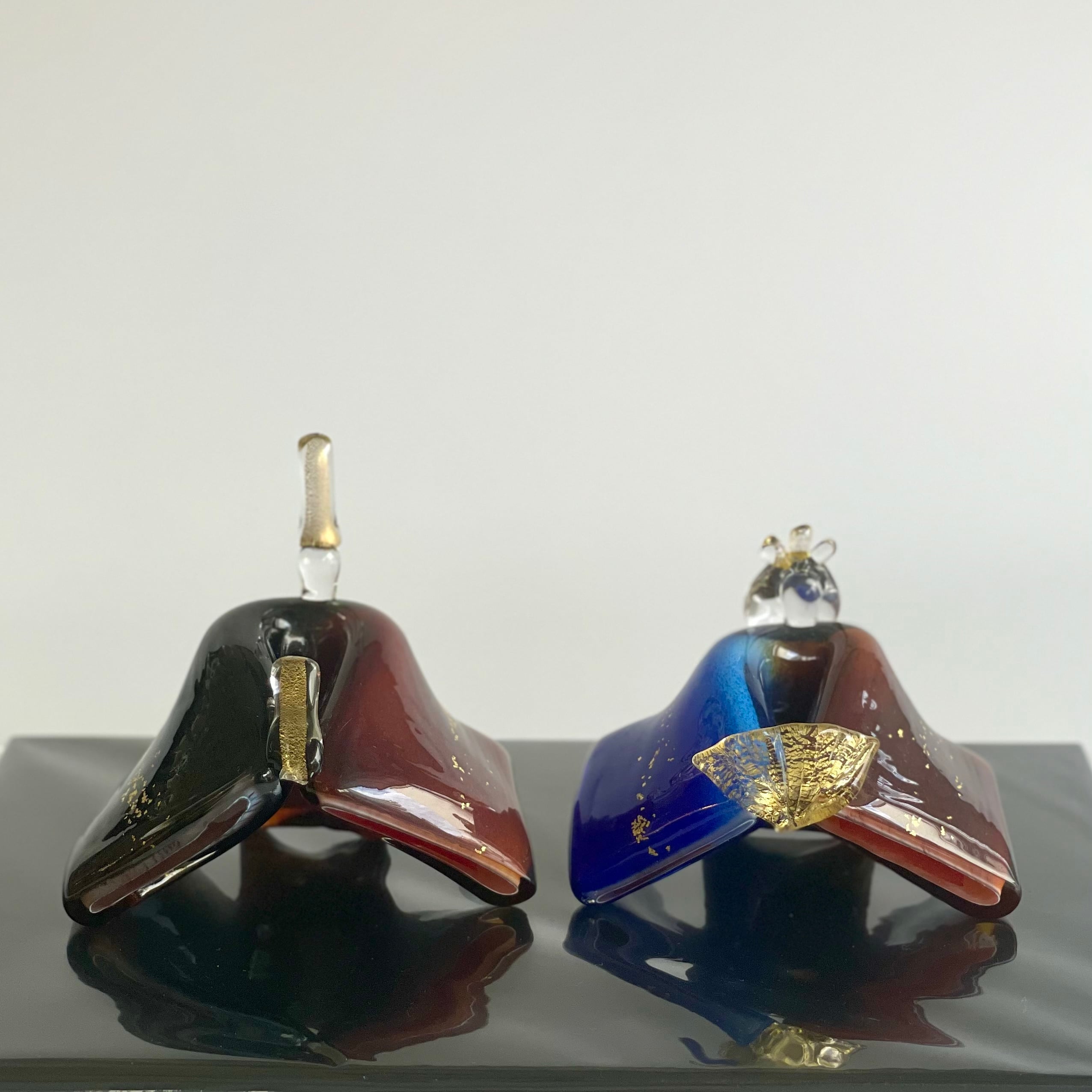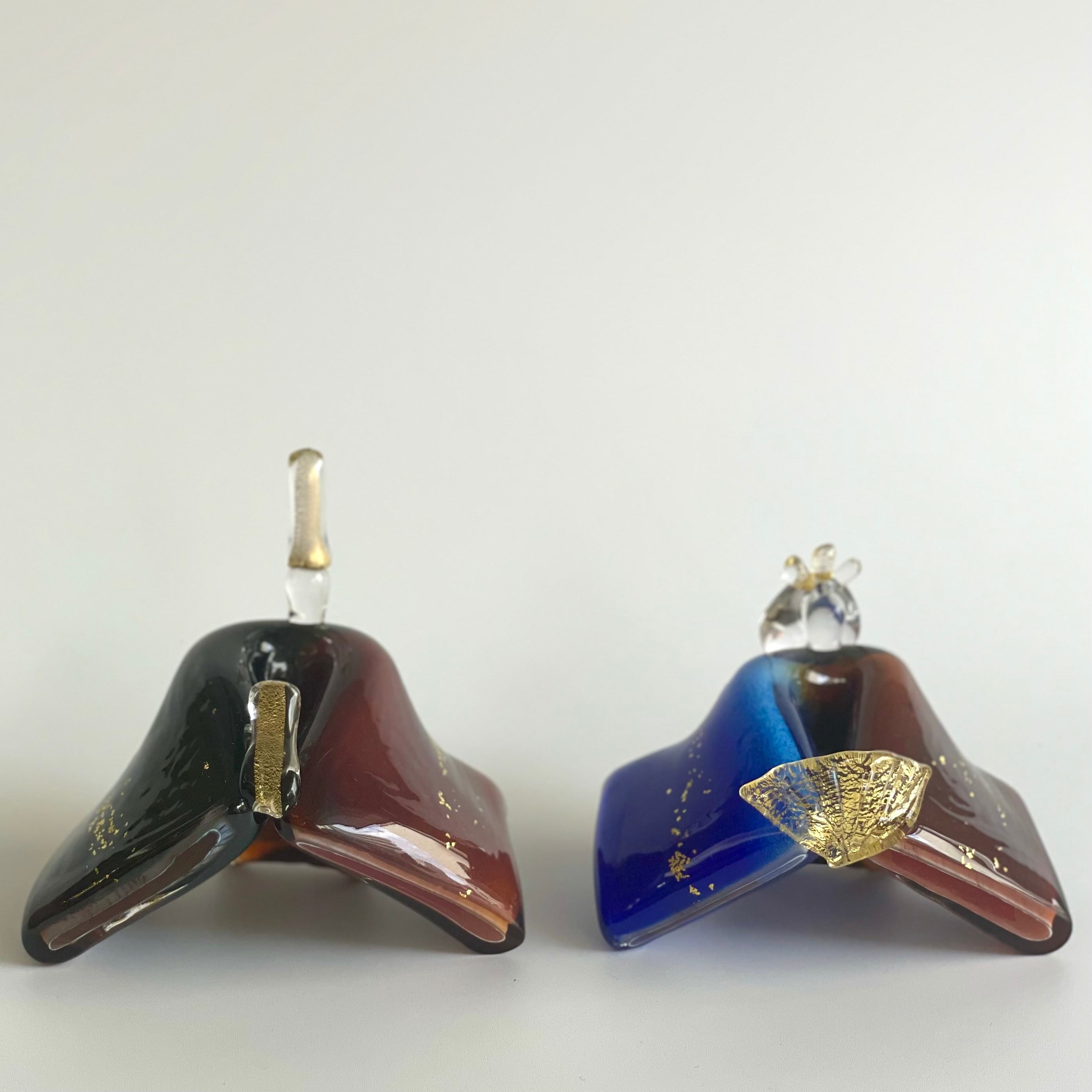 ガラスのお雛さま 夜桜です。吹きガラスで作られるお雛さまは、置く場所を選びません。シックな色合いが特徴で着物の質感が美しい作品となっています。