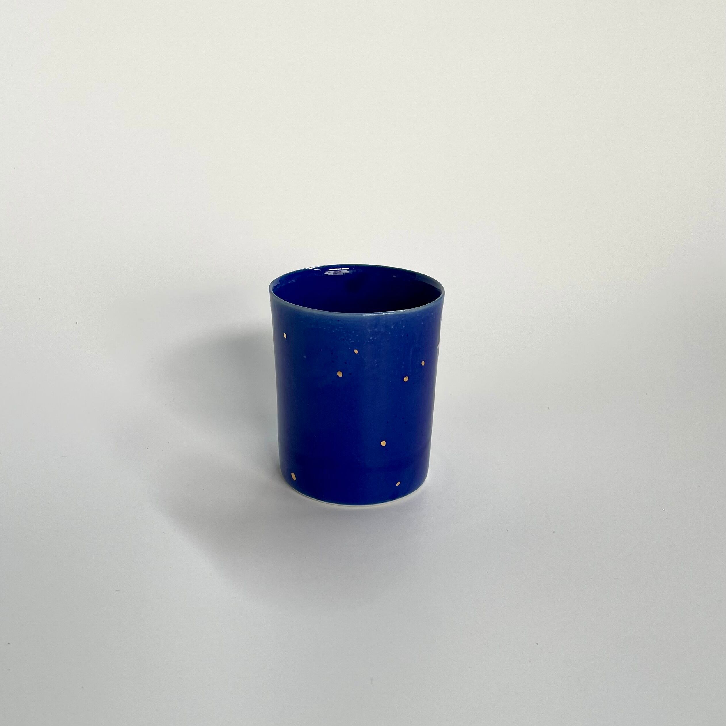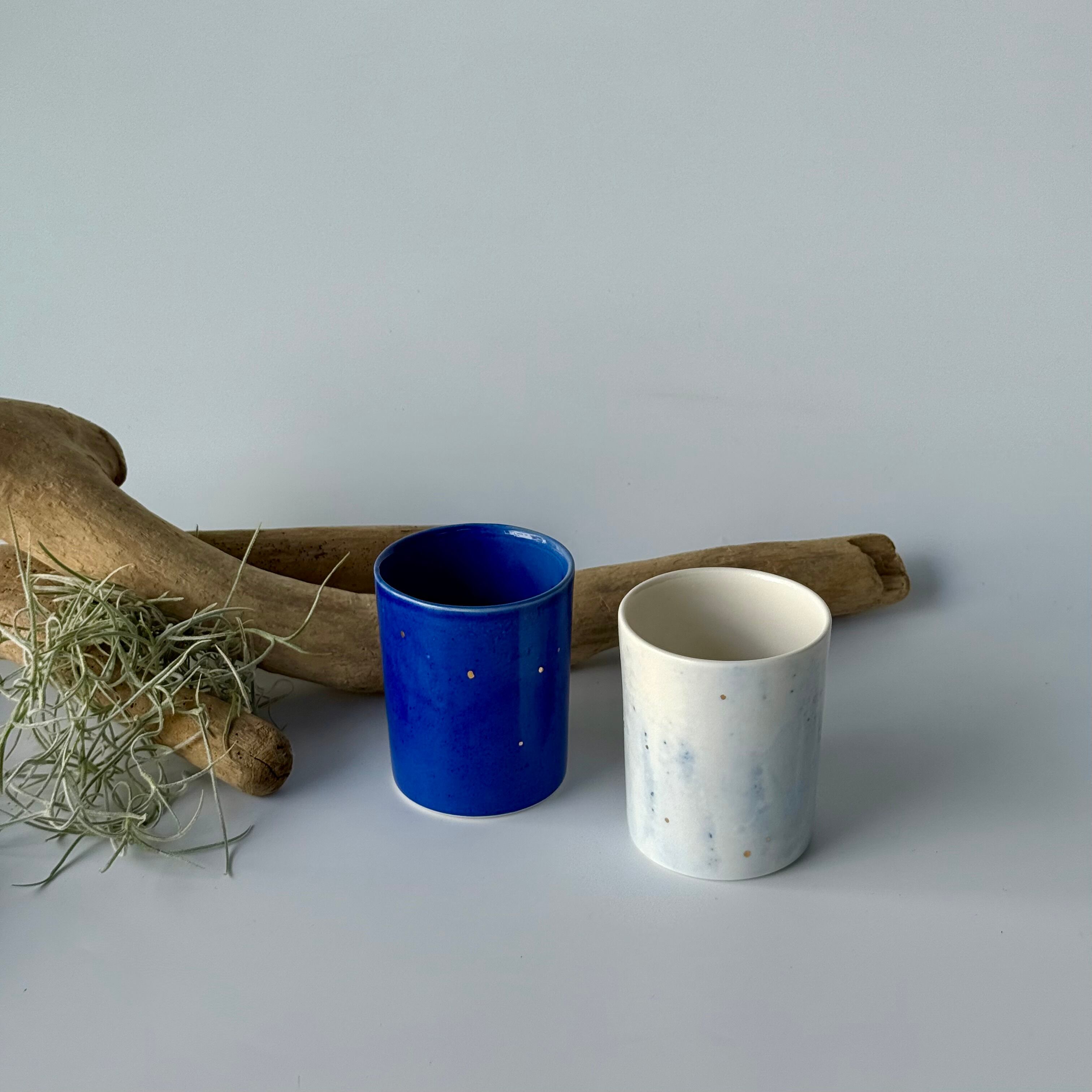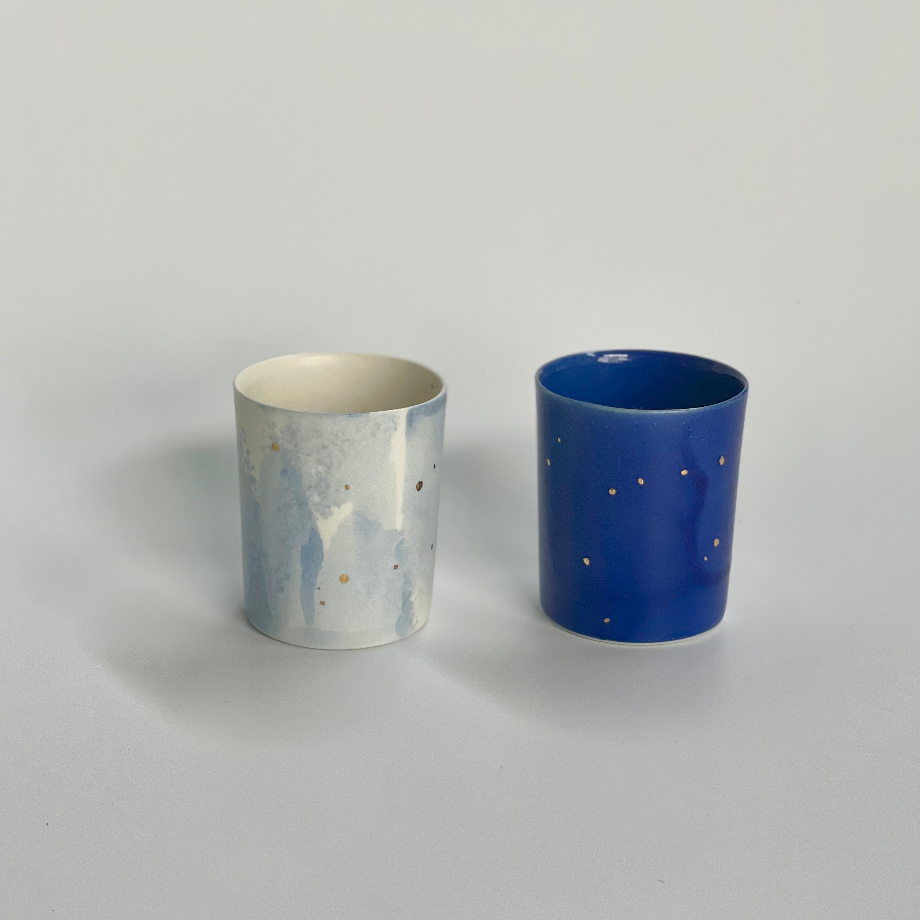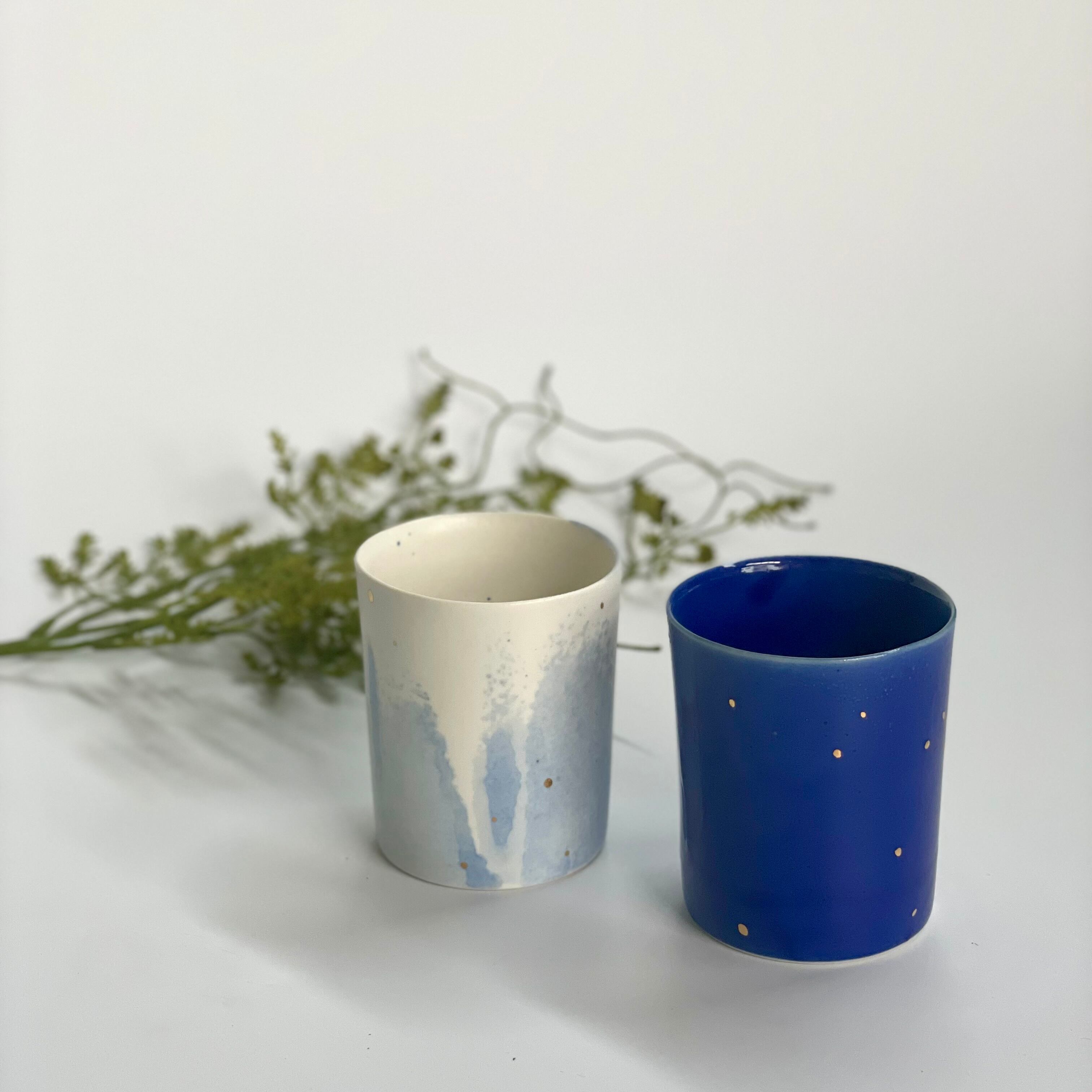 陶磁作家 犬童南佳子さんのまっすぐカップ(もや・青)です。一つずつ丁寧に形作られており、かたちのゆらぎや色のちがいを楽しんでいただける作品です。